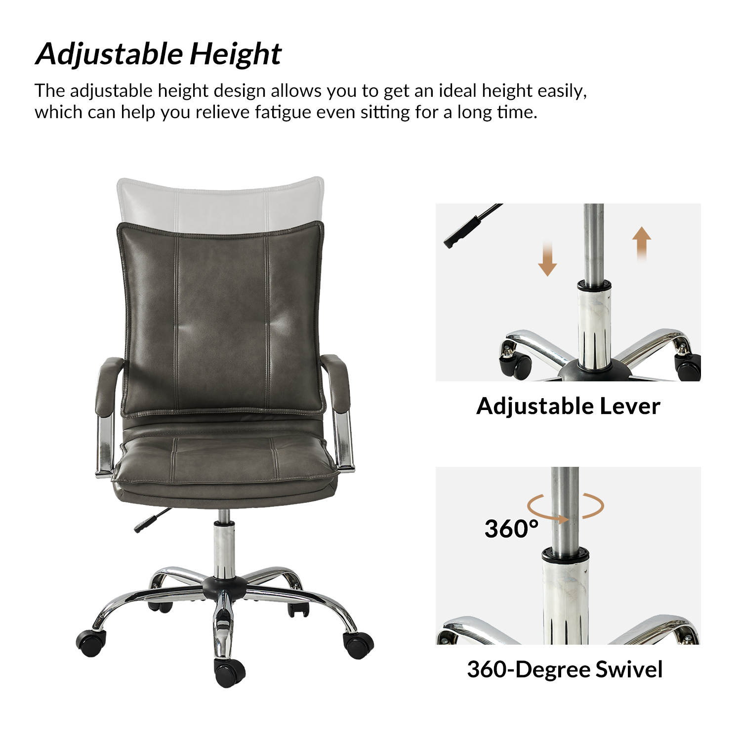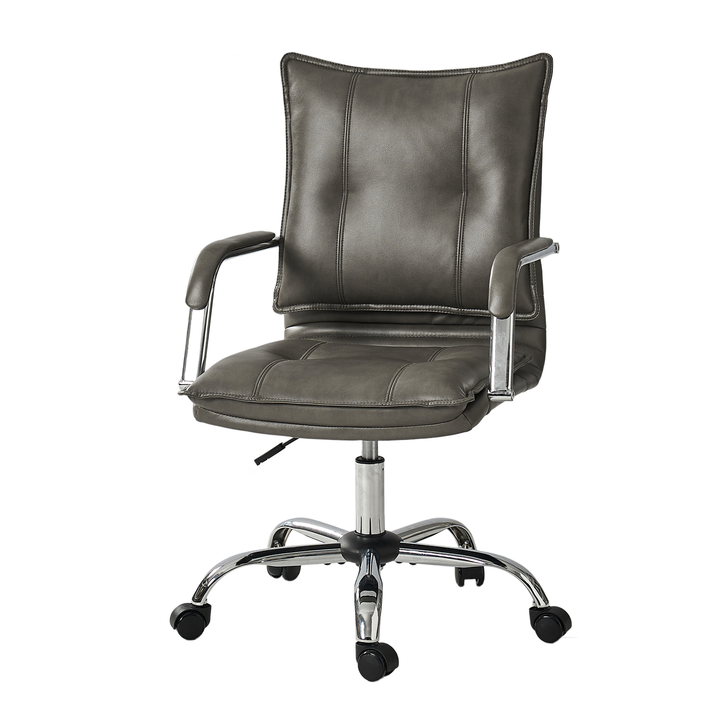 Enjoy modern comfort with this adjustable task chair. It has a vegan leather outside for a sleek look. The padded arms give you extra comfort when you sit for a long time. Its strong metal base has 5 casters for stability. Relax with the comfy tufted backrest, which gives good support. Move easily with the 360-degree swivel seat. Change the adjustable seat height to fit you. It’s SGS Certified for safety. Dimensions (WxDxH): 22.2 x 26 x 40-36.3. Seat Dimensions (WxDxH): 19.2 x 20.5 x 18.5-22.2. Product Weight (lbs): 26.46. Material: Faux Leather, Manufactured Wood, Original Foam. Color: GREY. Assembly Required: Yes.