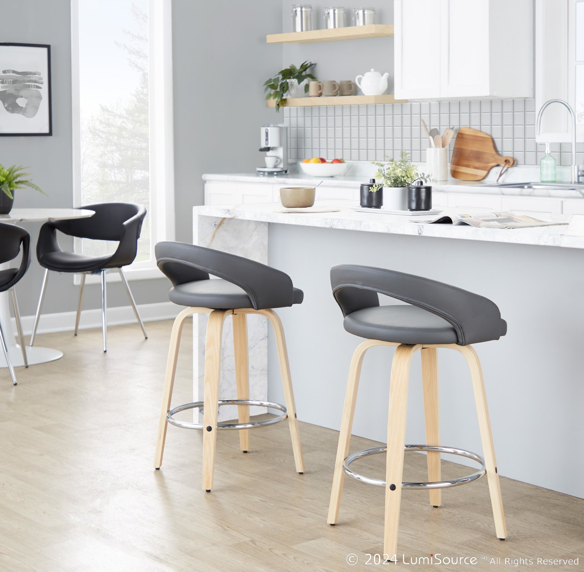 The Grotto 26-Inch Contemporary Grey Swivel Counter Stools bring a touch of refined style to your kitchen or bar area. These stools feature a fully upholstered seat and a low backrest, providing both comfort and a sleek design.