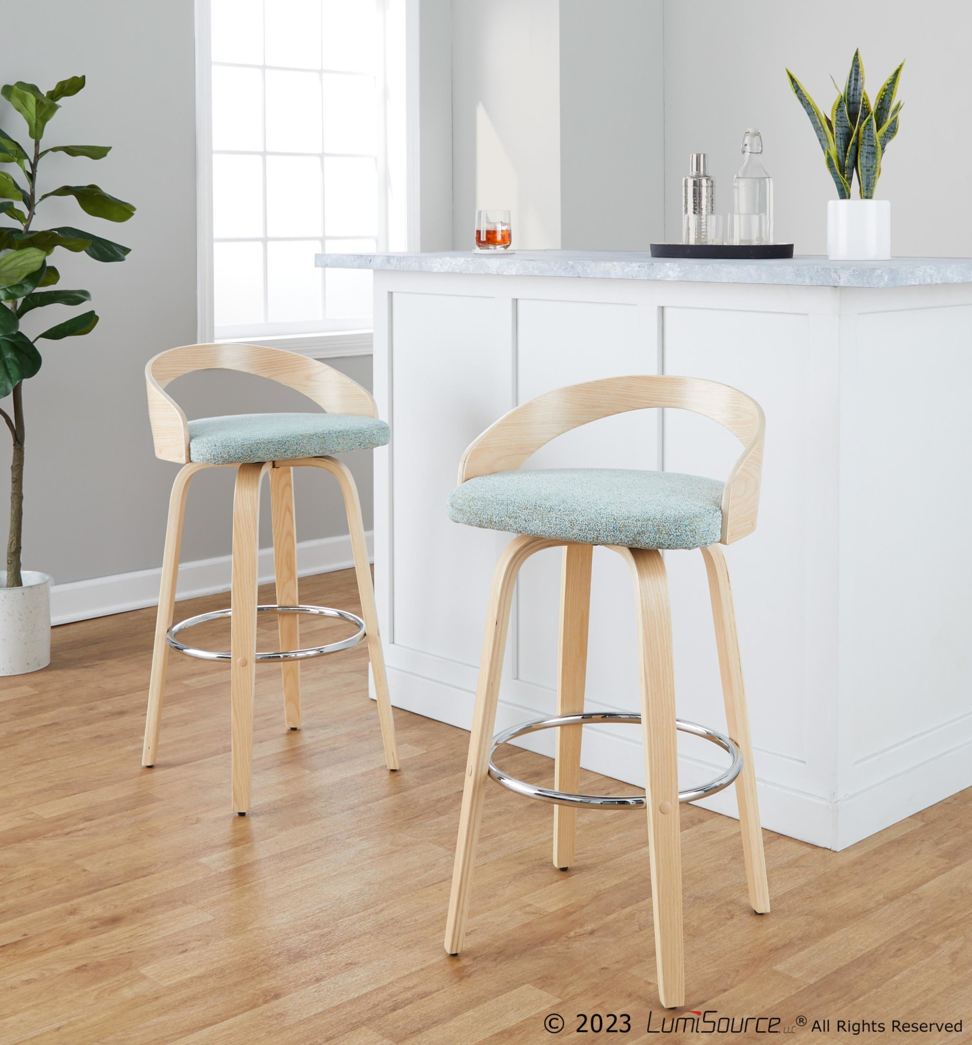 The Grotto 30″ Contemporary Light Green Swivel Barstools offer a sophisticated design with modern features. These barstools feature a curved low back and rounded legs, radiating elegance. Enjoy the comfort of a cushioned seat that swivels a full 360 degrees, along with the support of wood legs and a built-in footrest.