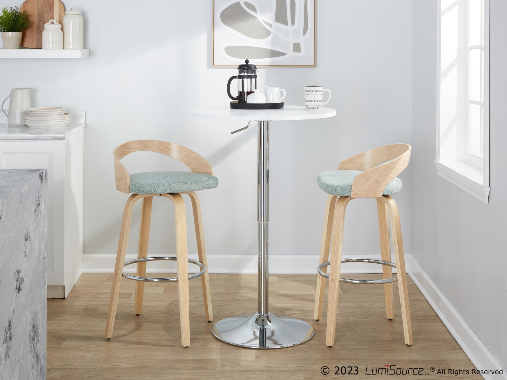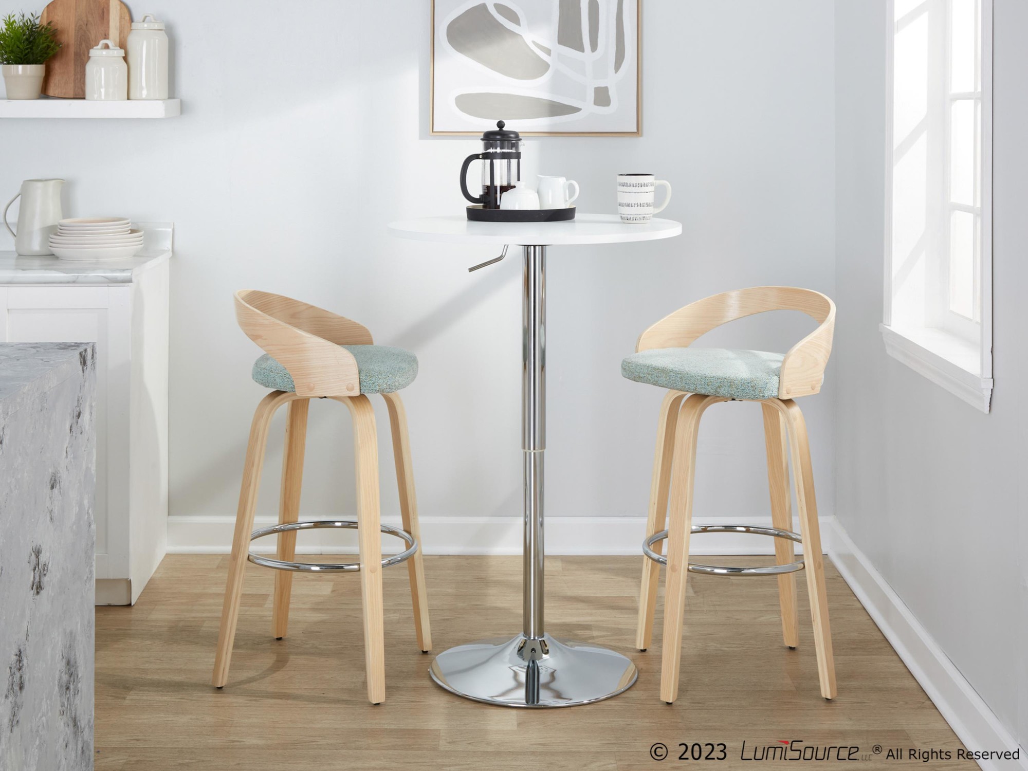 • Color: Natural Wood, Light Green Fabric, Chrome Metal