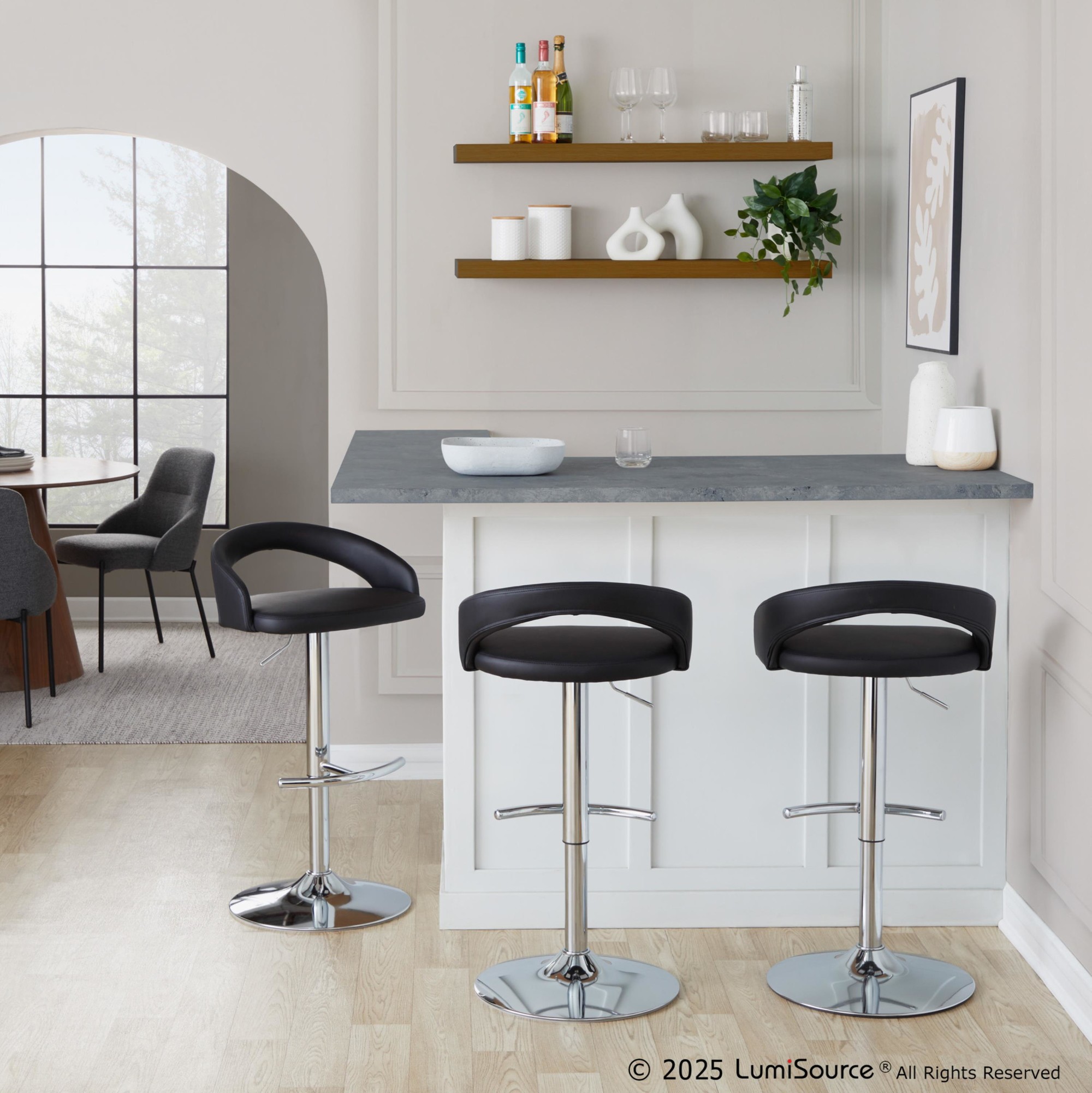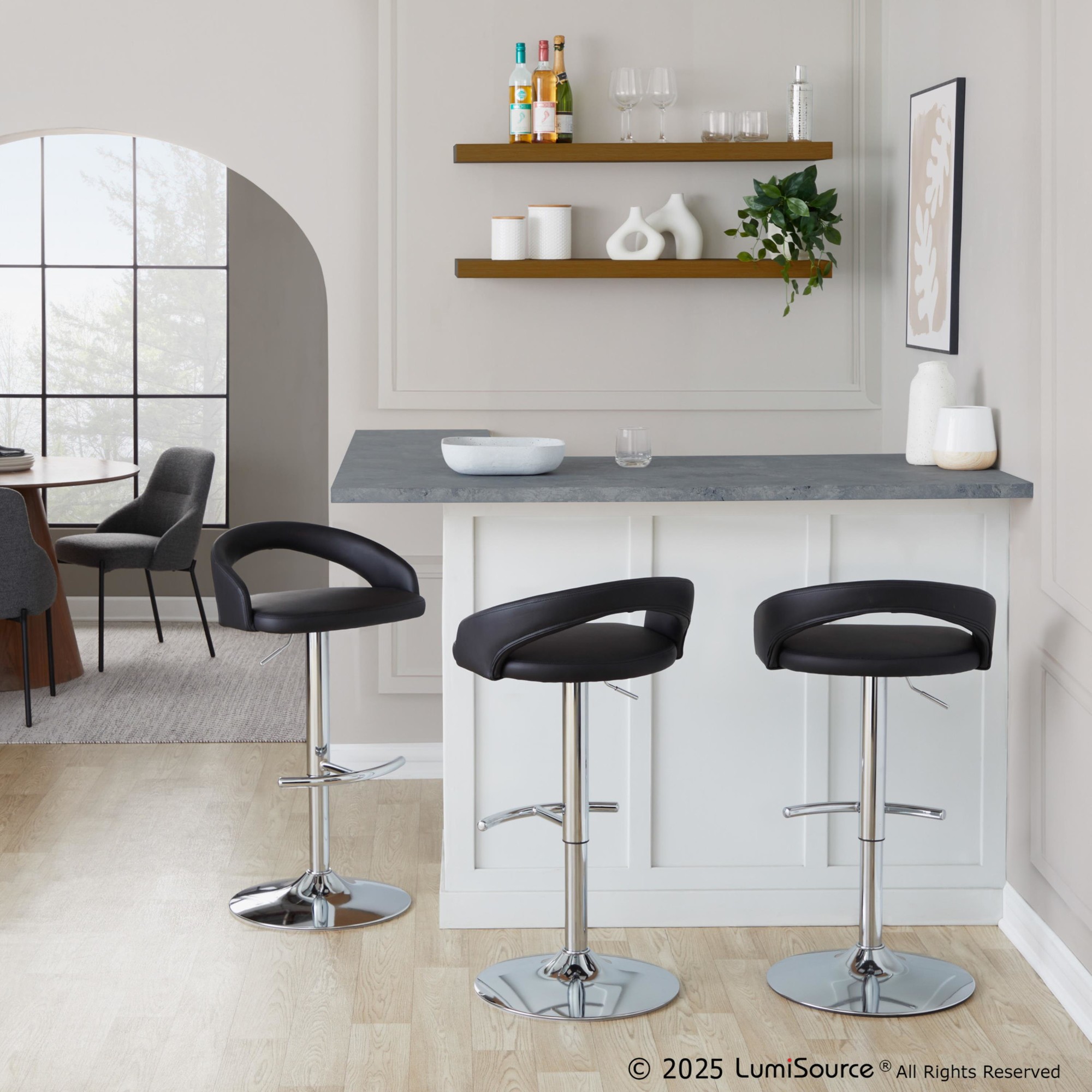The Grotto barstools aren’t just about looks; they’re about creating an inviting space. The clean-lined design of the adjustable, chrome-finished base complements the plush, black faux leather upholstery, allowing these stools to blend seamlessly into any decor. Enjoy the 360-degree swivel and find the perfect height for any counter with the adjustable mechanism! Sold in pairs, these barstools are ready to transform your space.