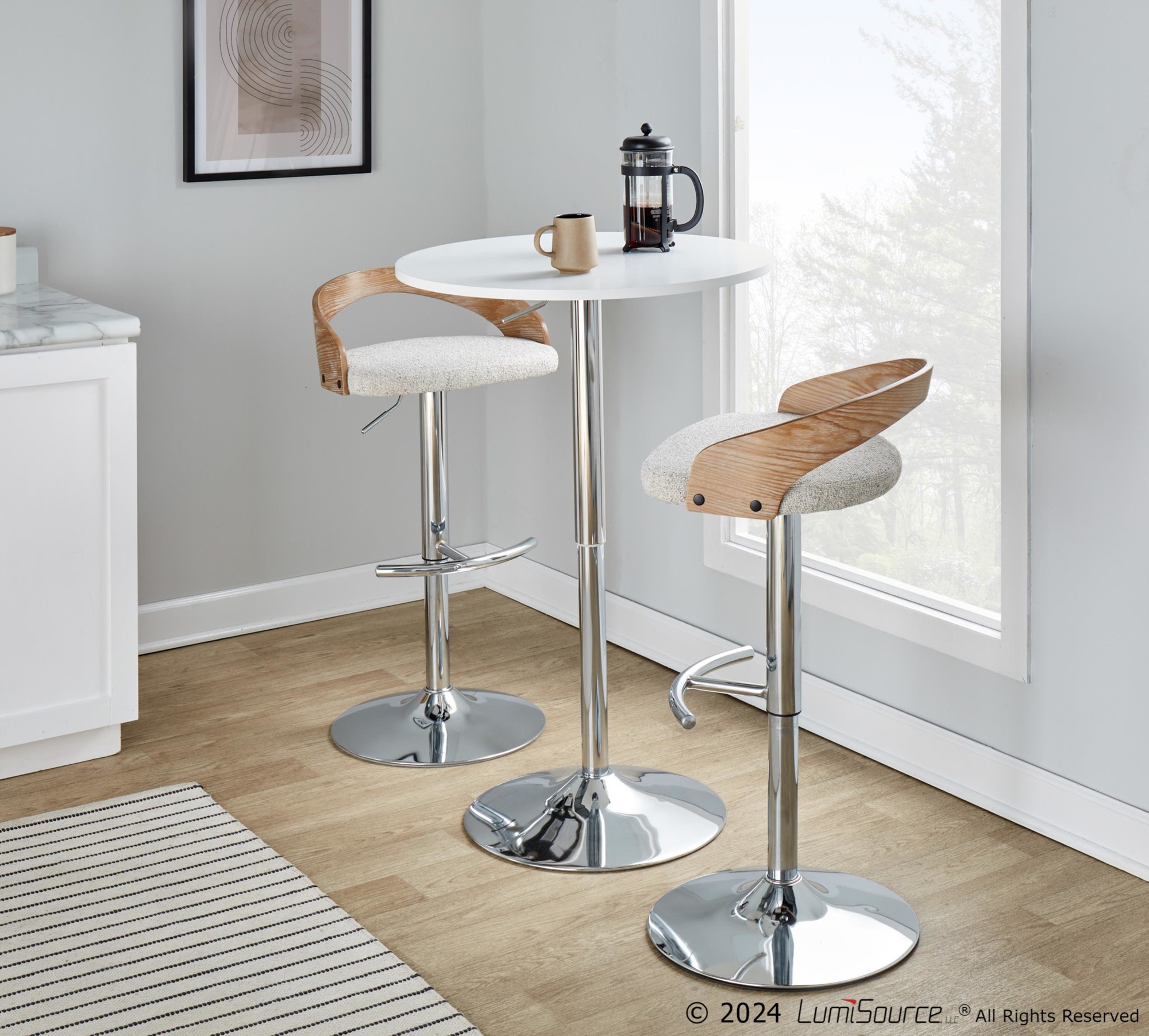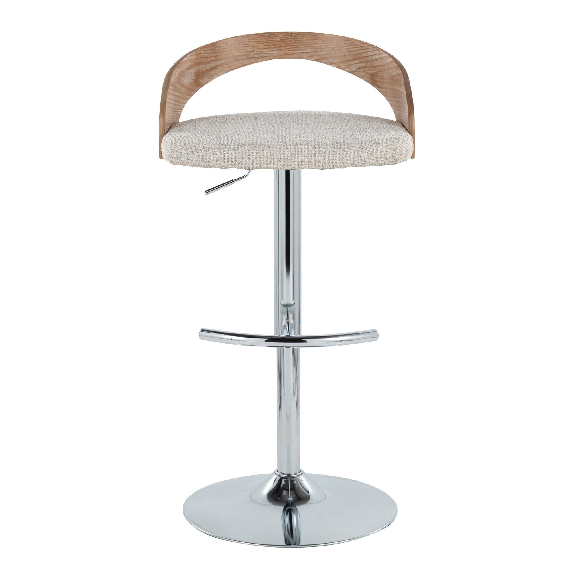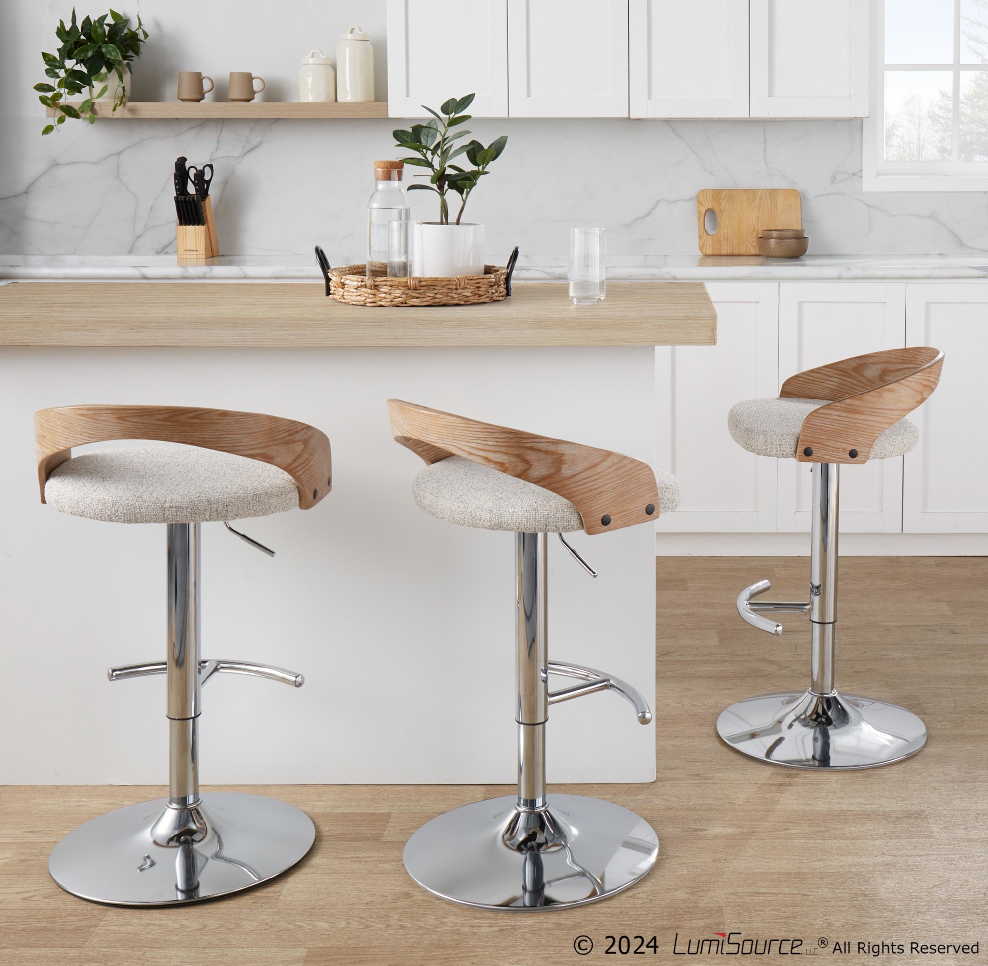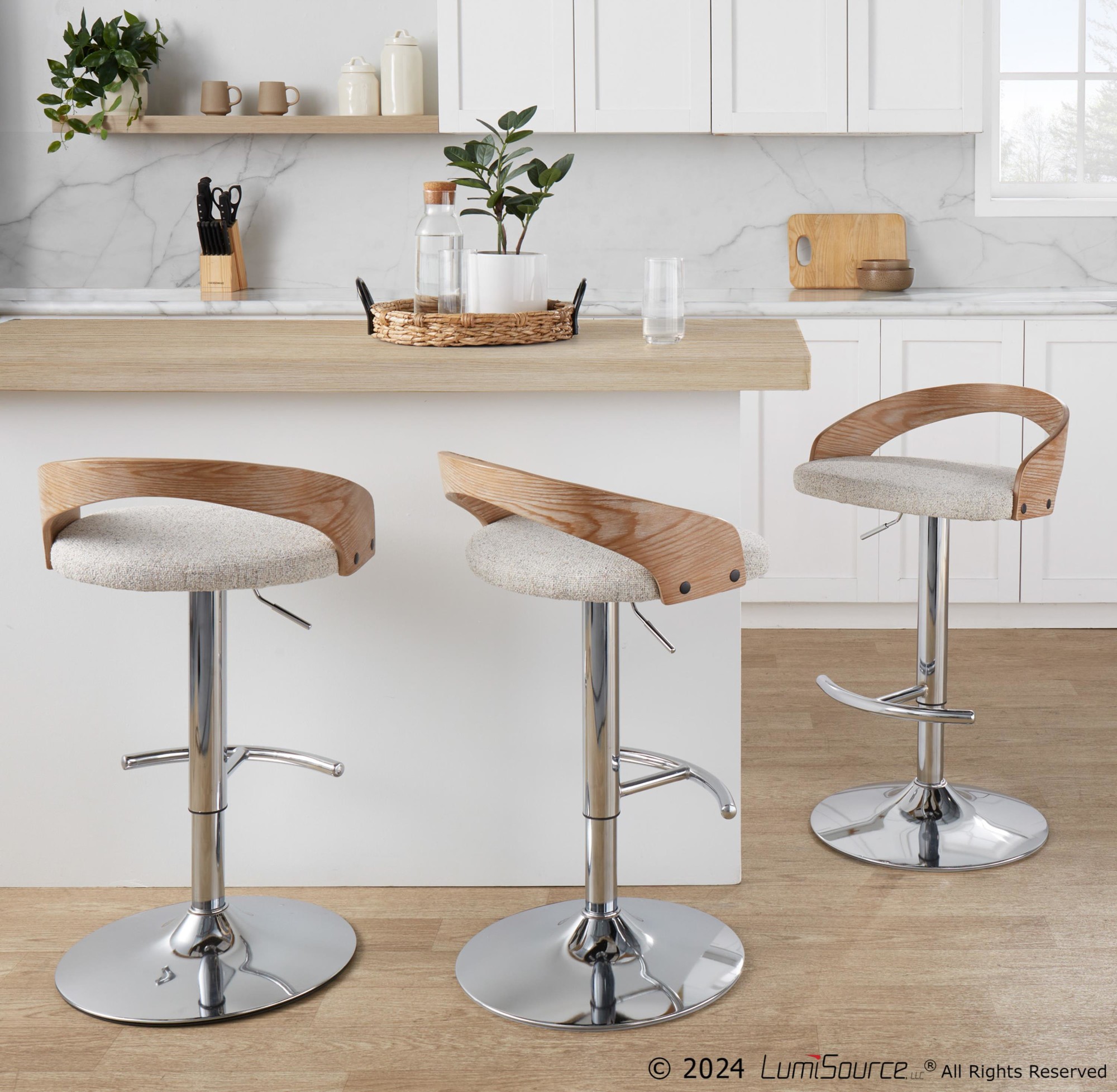 Upgrade your man cave with the Grotto Chrome and Oat Fabric Swivel Barstools. This set of two bar stools blends modern style with comfort. Each stool features a sleek, curved low back and stylish oat fabric upholstery. Enjoy a 360-degree swivel and adjustable height for the perfect fit. The chrome metal base includes a convenient rounded T footrest. These barstools are perfect for adding a sophisticated touch to your bar area while maximizing space and comfort. Assembly Required. Weight Limit: 250 lbs (each).