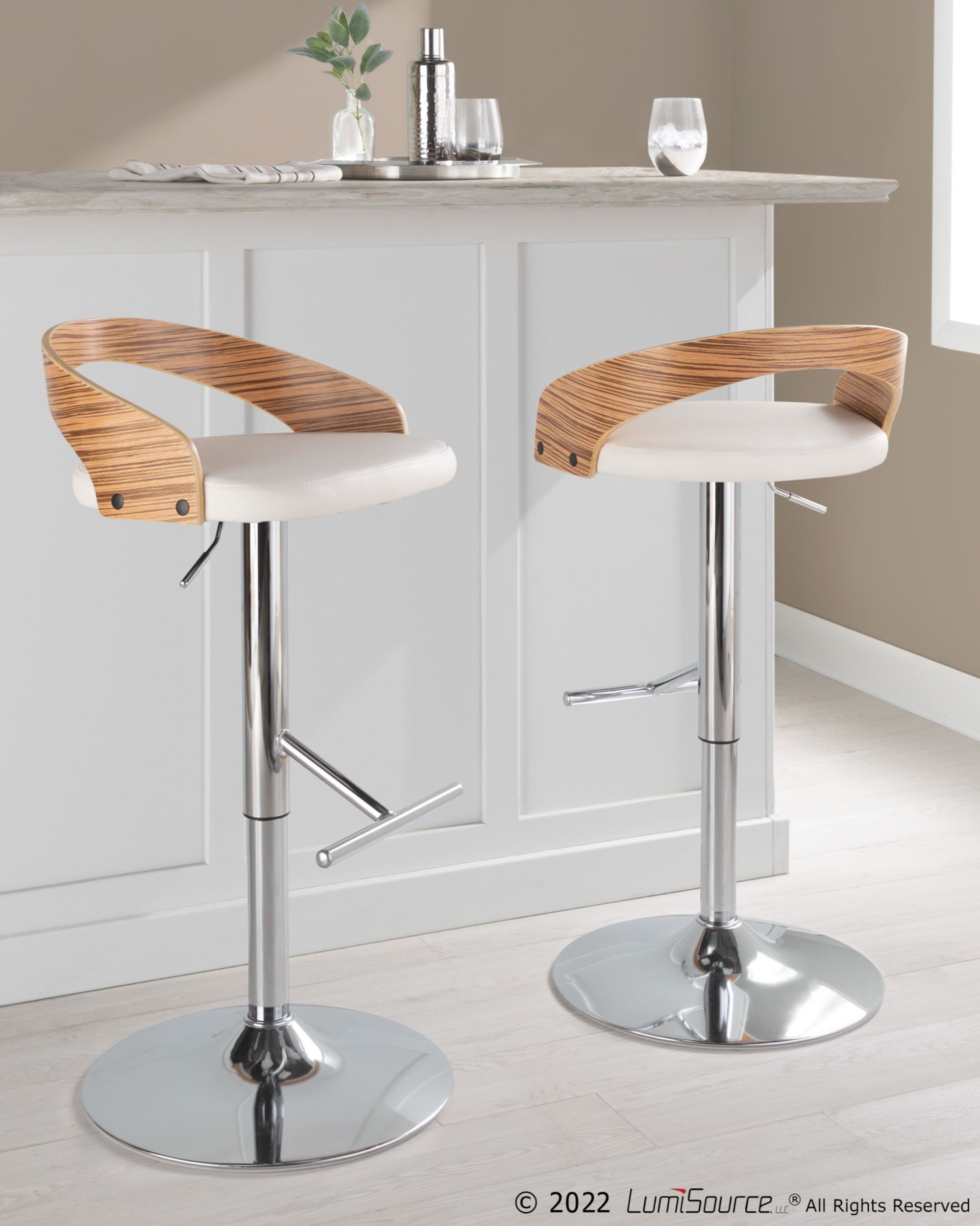 Add some style to your cave with the Grotto Adjustable Barstools! These barstools feature a mid-century modern design with a sleek, curved low back. The cushioned seat with stylish faux leather upholstery makes it comfy, plus it swivels 360 degrees! The adjustable height and built-in footrest keep you feeling good. The chrome metal base adds a modern touch. Includes two barstools. Product Specs: 17.5″L × 19″W × 30.5-39″H. Seat To Floor: 23.75-32.25″. Seat Depth: 15″. Inside Seat Width: 17.5″. Seat To Footrest: 16″. Backrest Height: 6.75″. Seat To Back Angle: 100°. Color: Chrome Metal, Zebra Wood, White PU. Material: PU Leather, Foam, Metal, Wood. Assembly Required. Weight limit: 250 lbs (each). Perfect for indoor use!