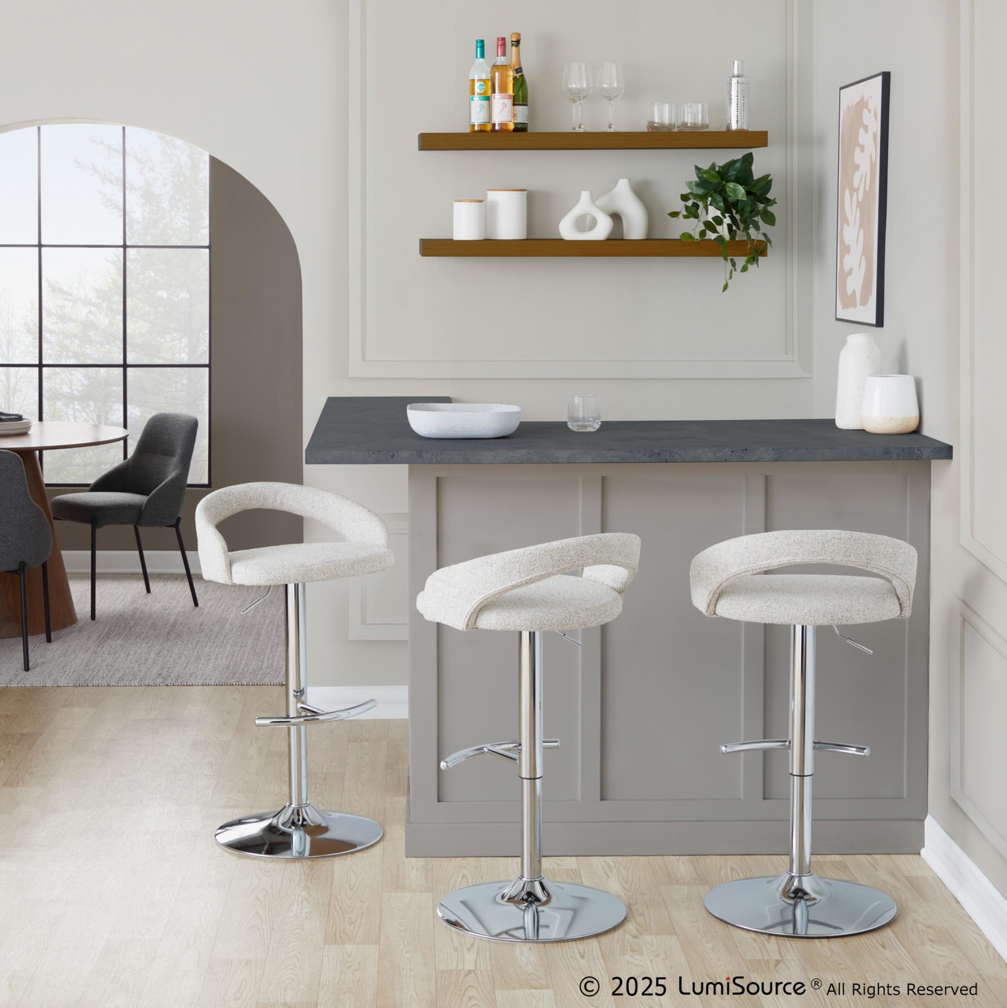 Get ready to rev up your kitchen or bar with the Grotto Adjustable Barstool Set! These aren’t just stools; they’re a statement. With their plush, fully upholstered seats and sleek, adjustable chrome bases, they’re the perfect blend of comfort and contemporary style. Prepare for compliments!