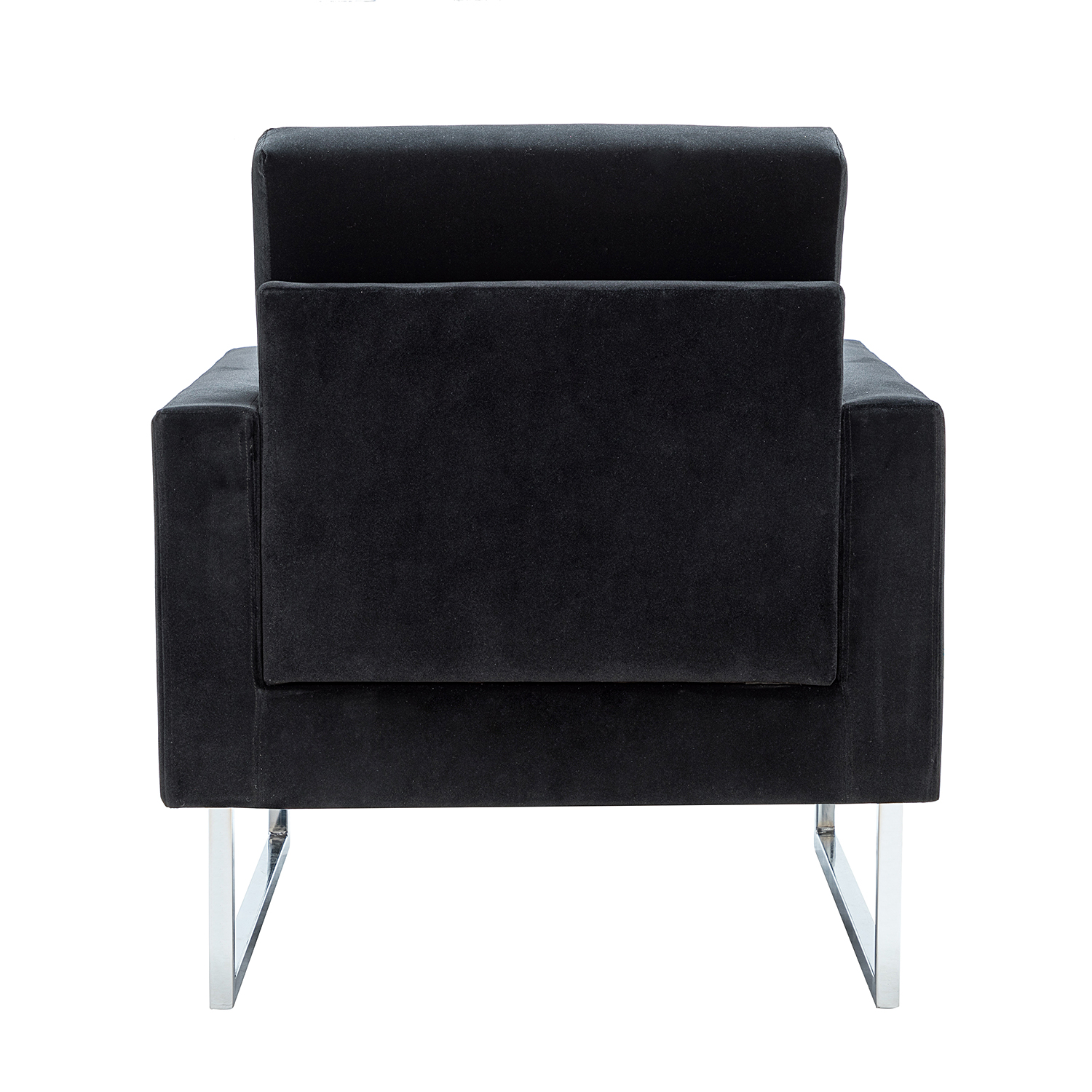 This chair features a charming boxy silhouette and a silver metal sled base, showcasing a modern aesthetic. The skin-touch-friendly velvet fabric, combined with thick foam padding, provides ultimate comfort. The attention to detail in its design makes it a delightful and inviting piece of furniture.
