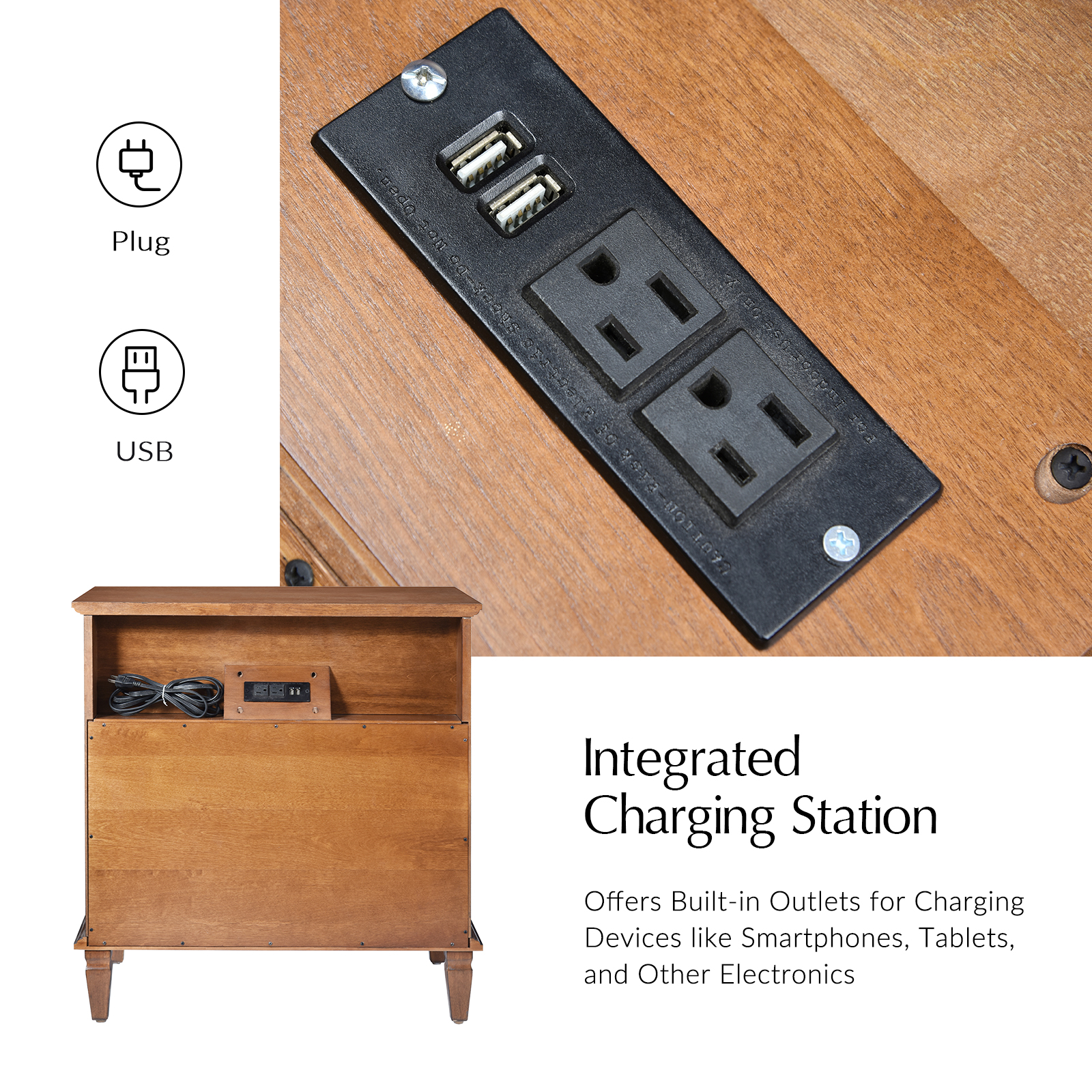 - Integrated Charging Station: Built-in outlets for convenient device charging.