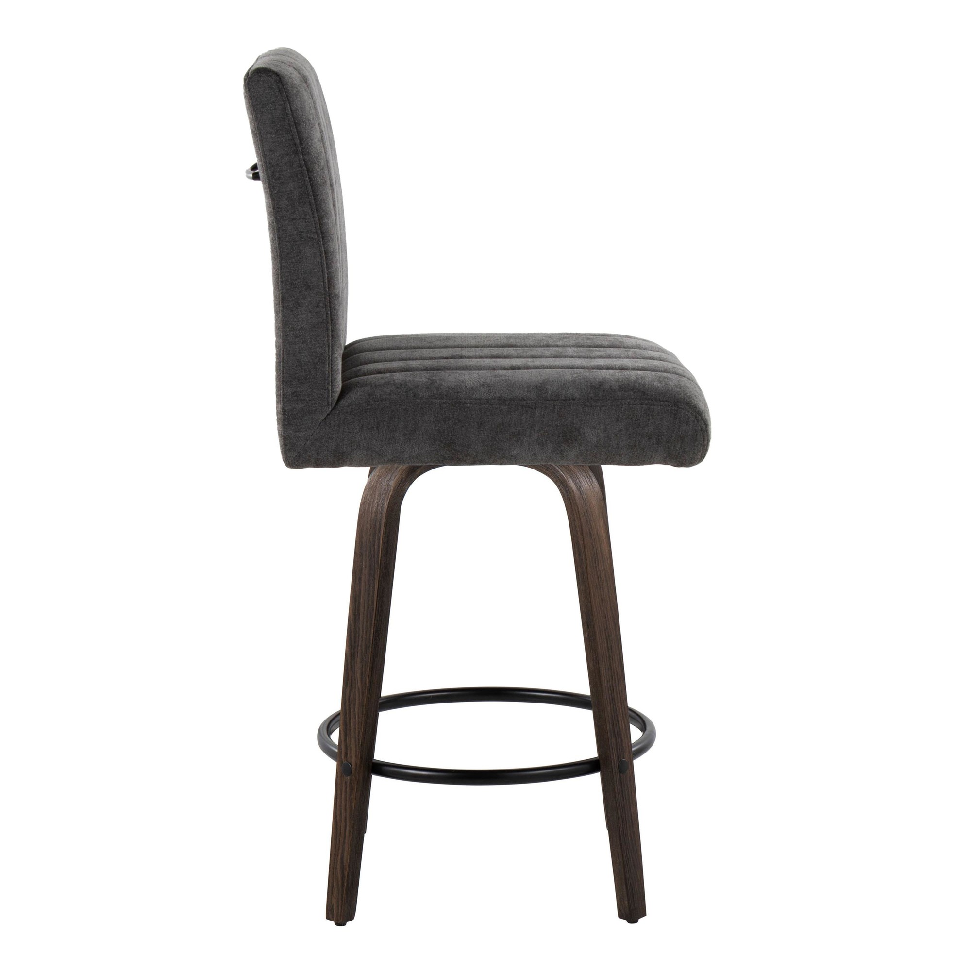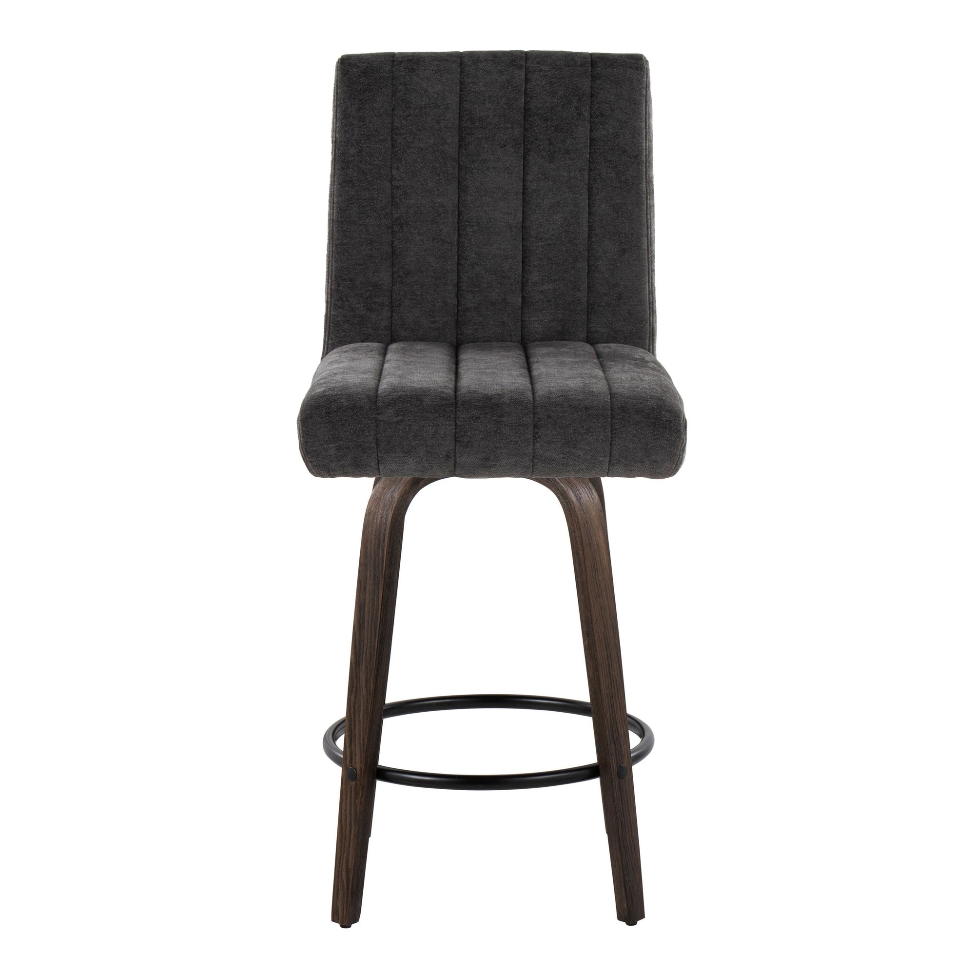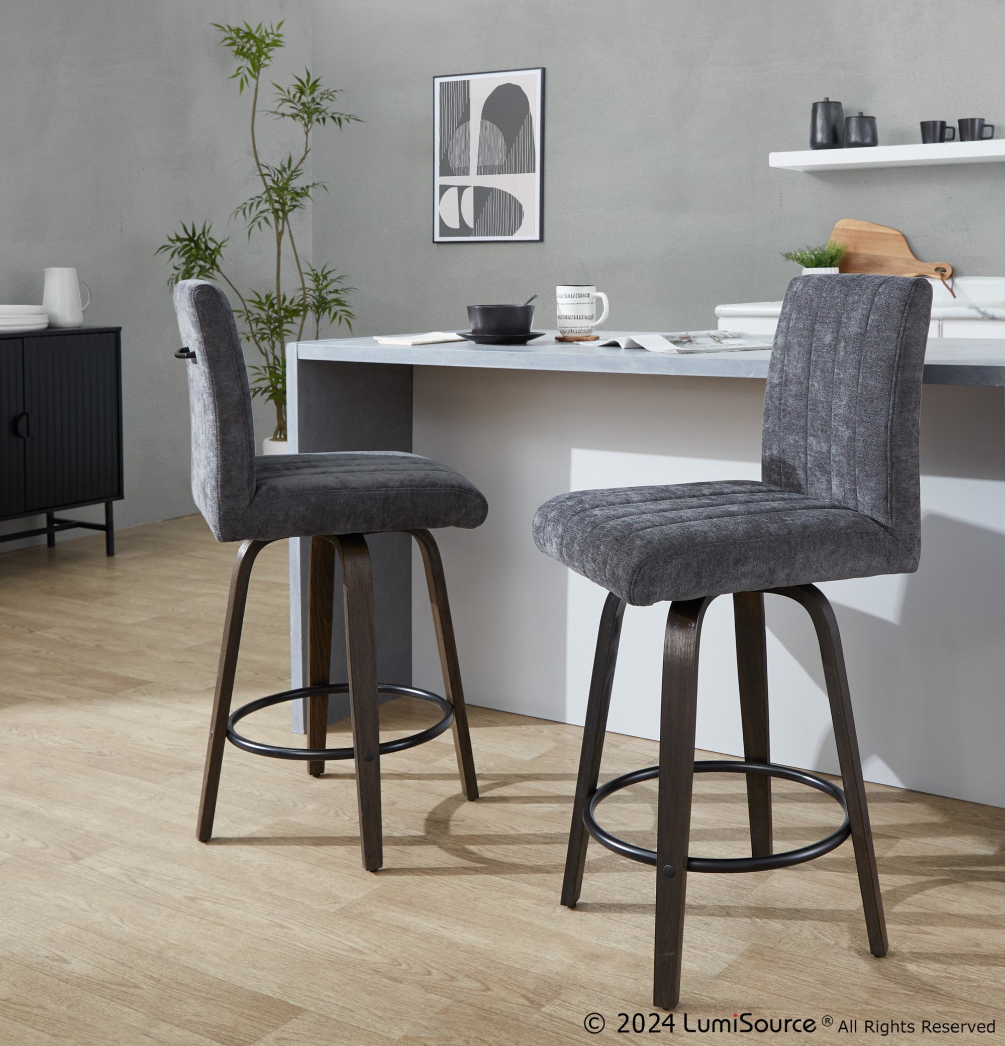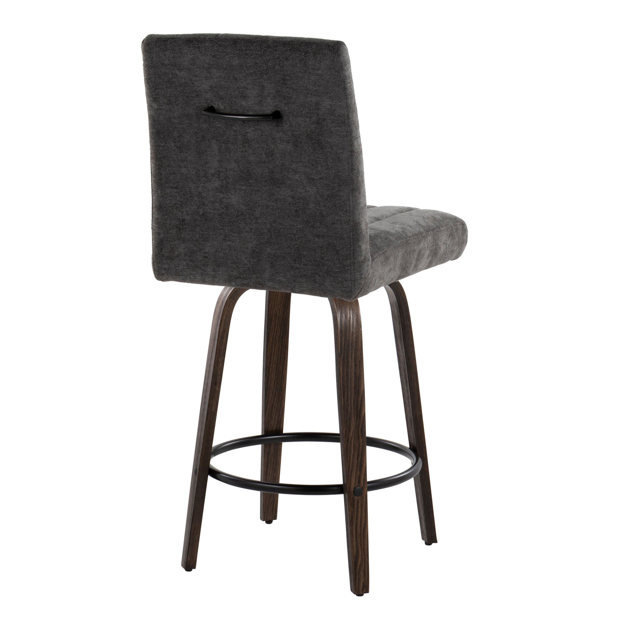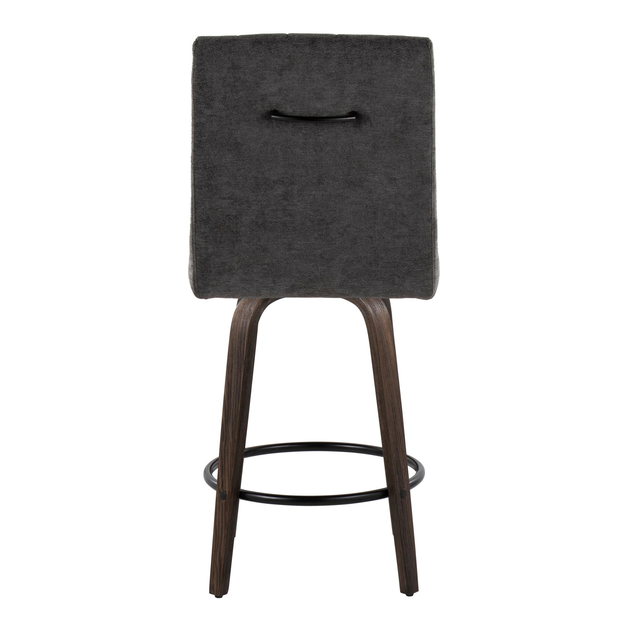 The Hank 26 Contemporary Walnut and Black Swivel Counter Stools are a modern seating solution that combines style and comfort. With a plush, tufted cushioned seat, a decorative handle on the seat back, and a sturdy wood frame, these stools will add sophistication to your space. Enjoy the sleek tapered legs, convenient 360-degree swivel, and comfortable design.