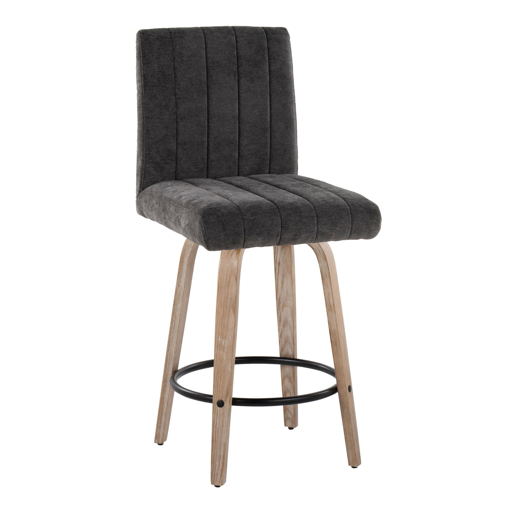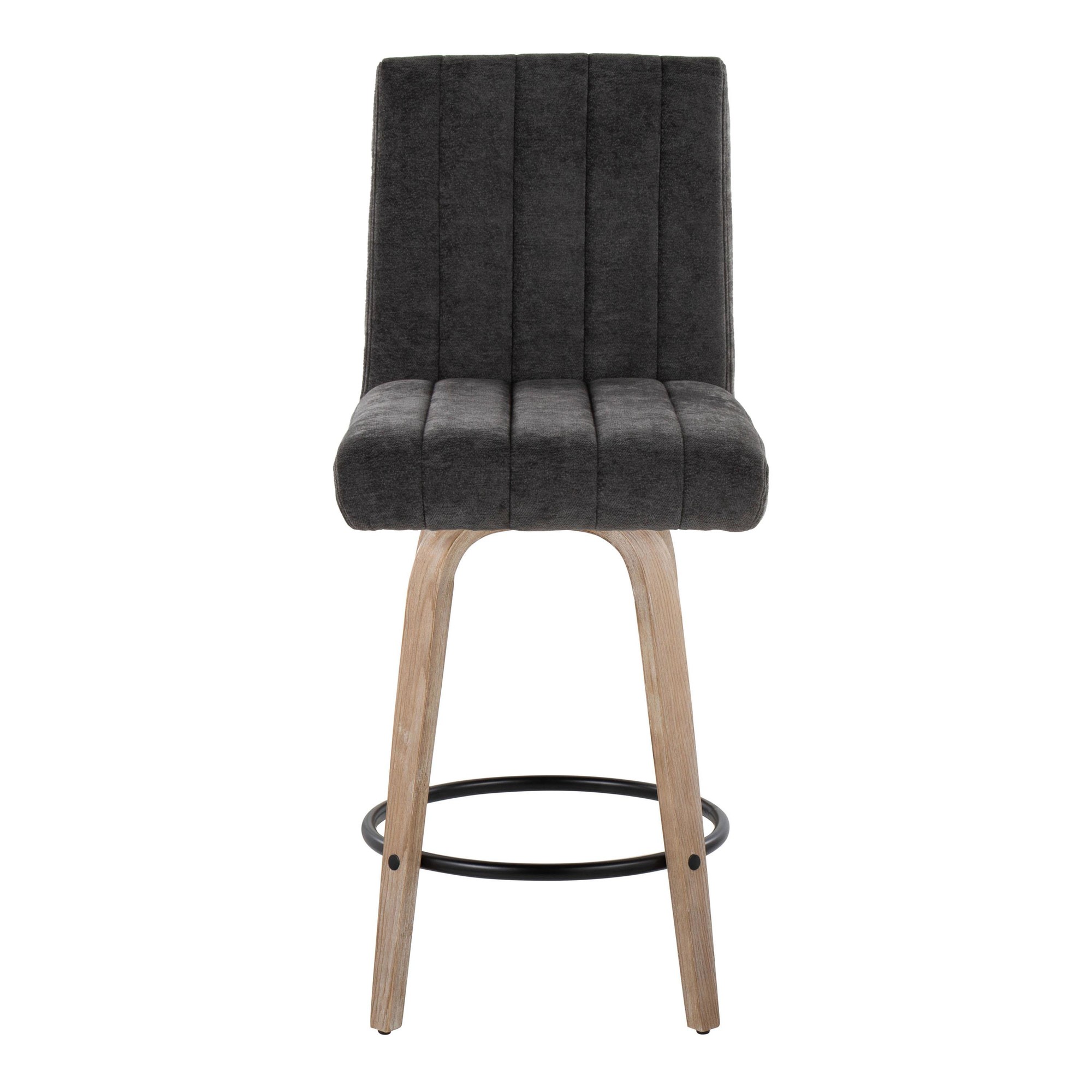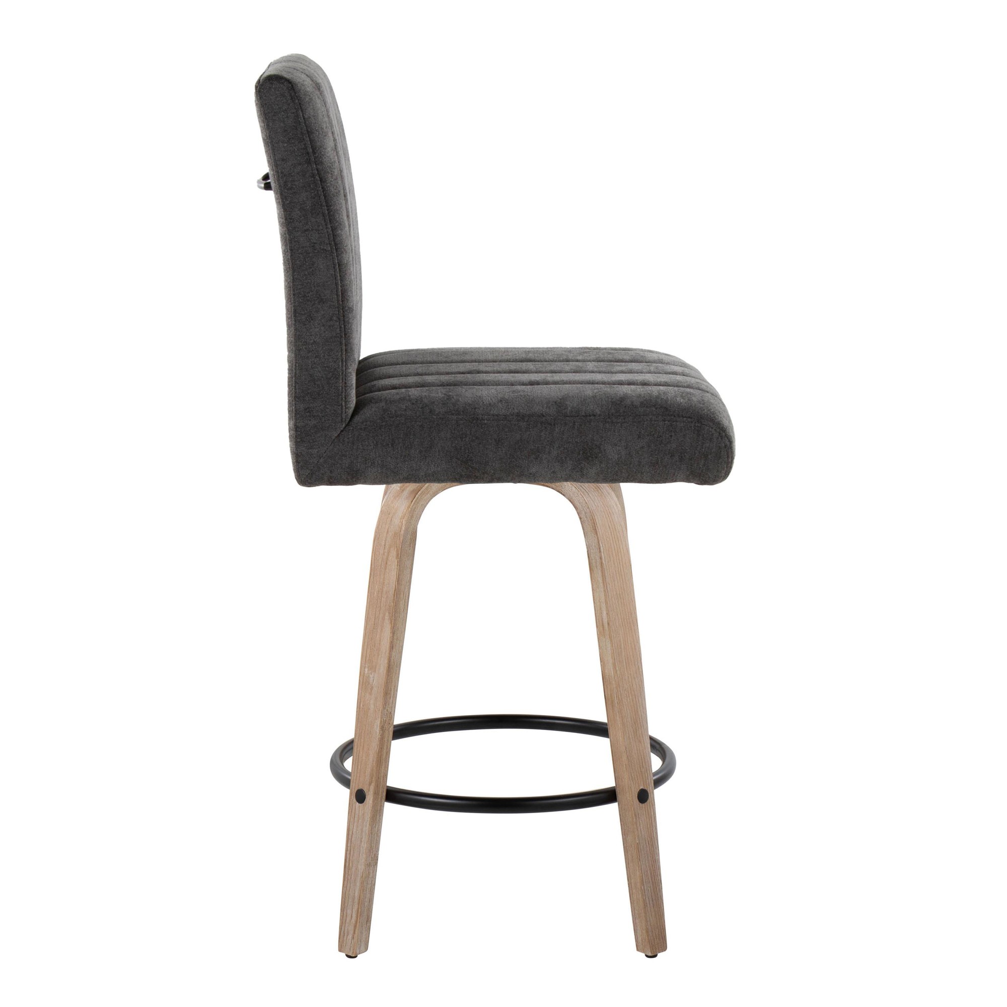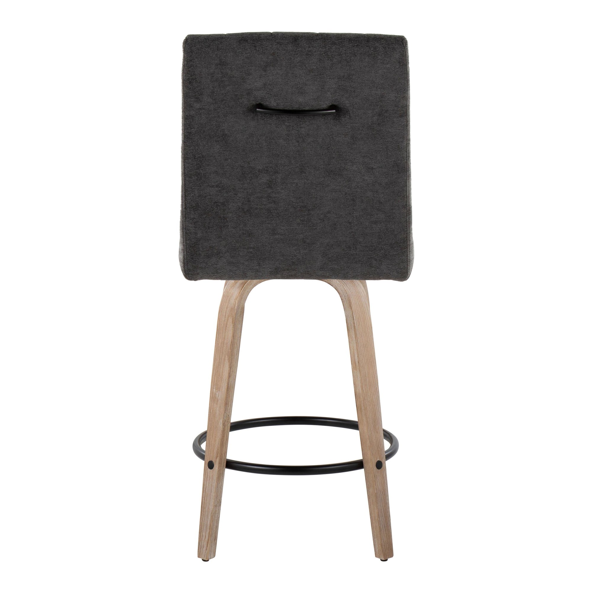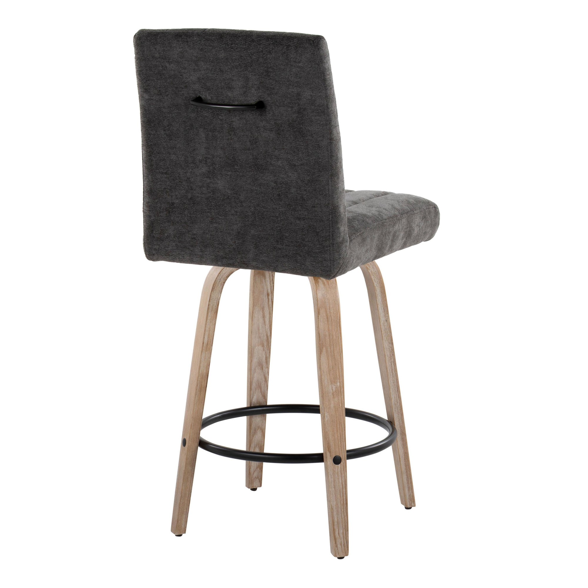 The Hank 26 Whitewashed Wood Black Fabric Contemporary Counter Stool is a modern seating solution that combines comfort and style. This fixed-height counter stool features a plush, tufted, cushioned seat, a decorative handle on the seat back, and a sturdy wood frame. The sleek tapered legs and 360-degree swivel enhance both form and function, making it a perfect addition to any kitchen or dining area.
