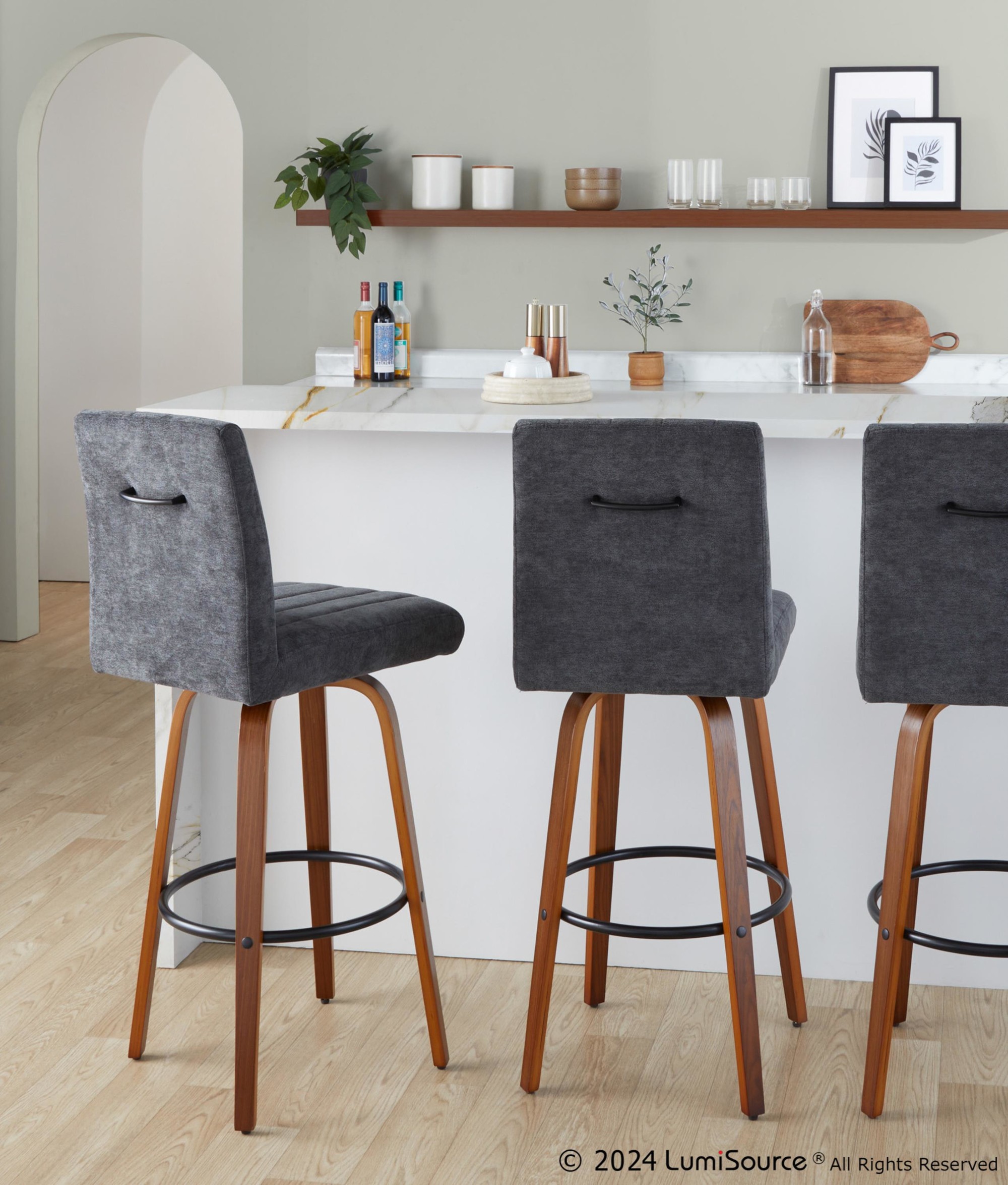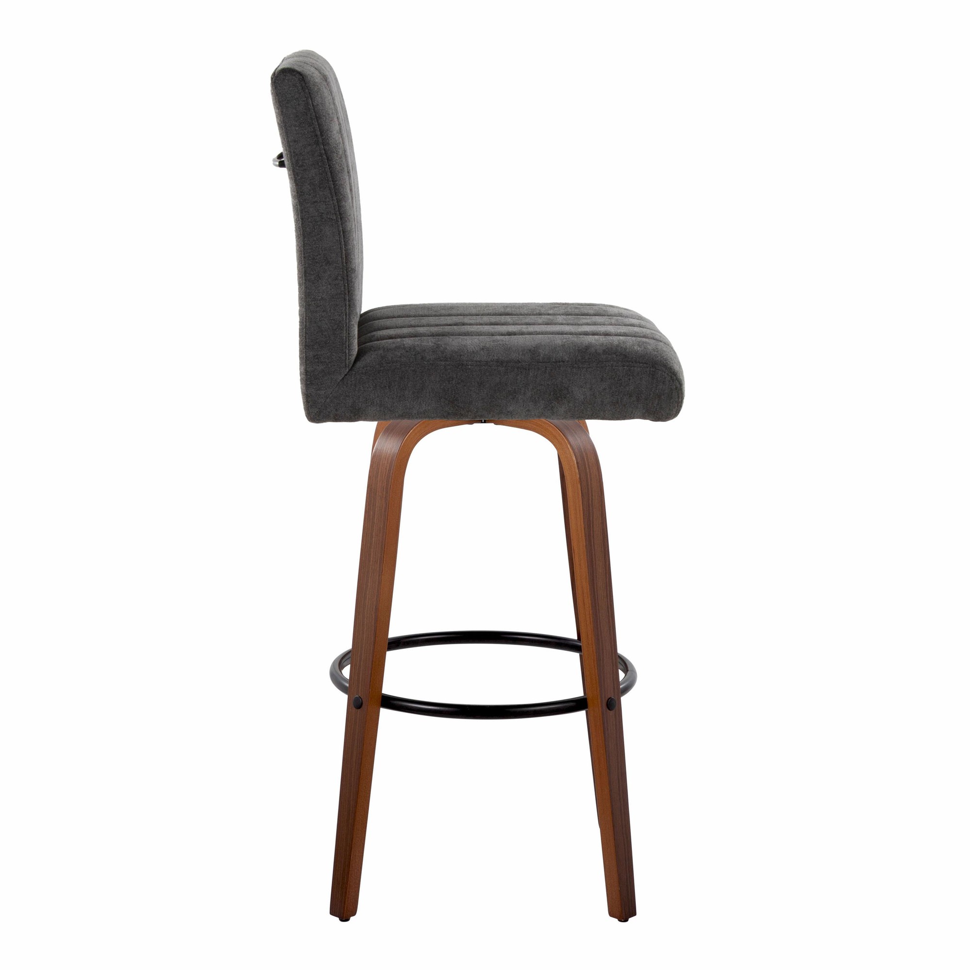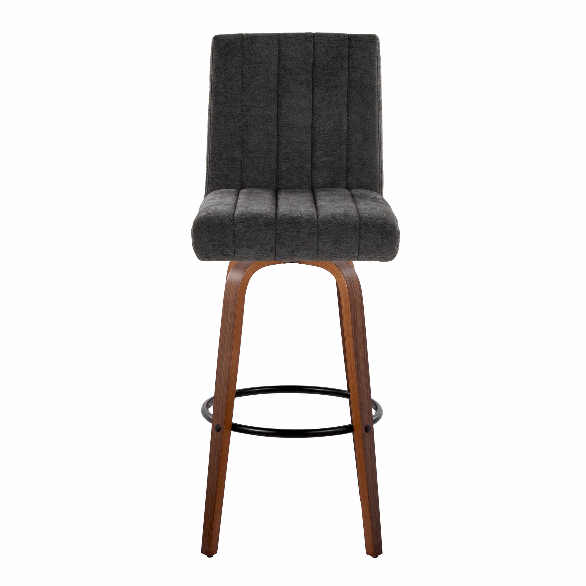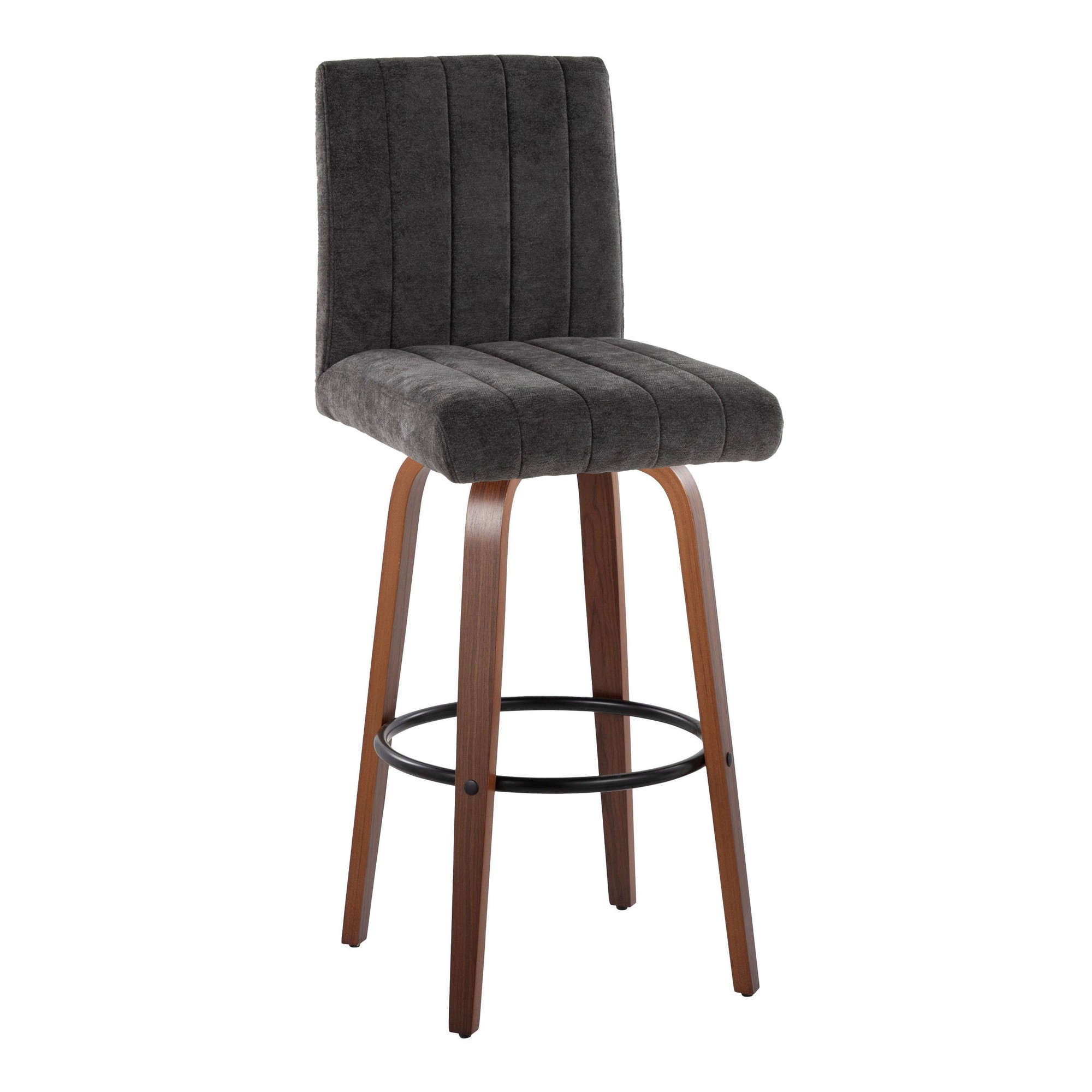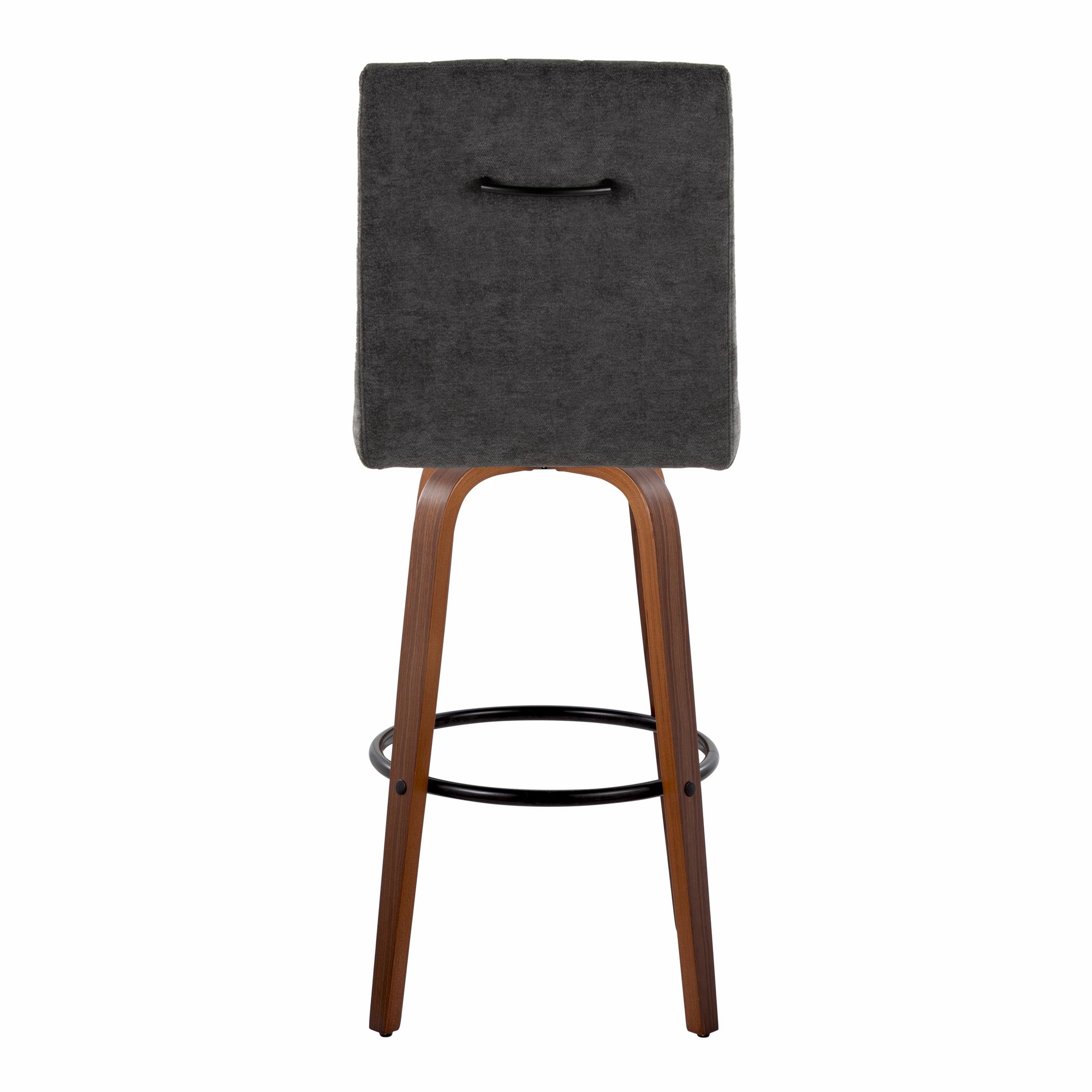 The Hank 30 Walnut and Black Contemporary Swivel Barstool is a modern seating solution that combines style and comfort. It features a plush, tufted, cushioned seat, a decorative handle, and a sturdy wood frame. The 360-degree swivel function adds convenience, while the sleek tapered legs and built-in footrest ensure a comfortable seating experience.