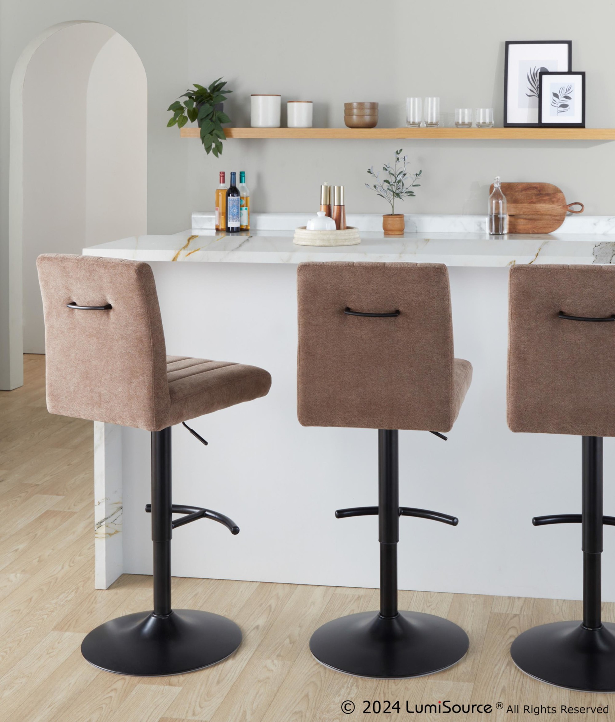 The Hank Adjustable Barstools are a modern seating solution that combines style and comfort. These stools feature a plush, tufted, cushioned seat, a decorative handle on the seat back, and a sturdy pedestal base. The swivel function and adjustable height make them a versatile addition to any bar area, providing both form and function. The sleek metal base complements the stylish fabric upholstery, enhancing the aesthetic of your space.