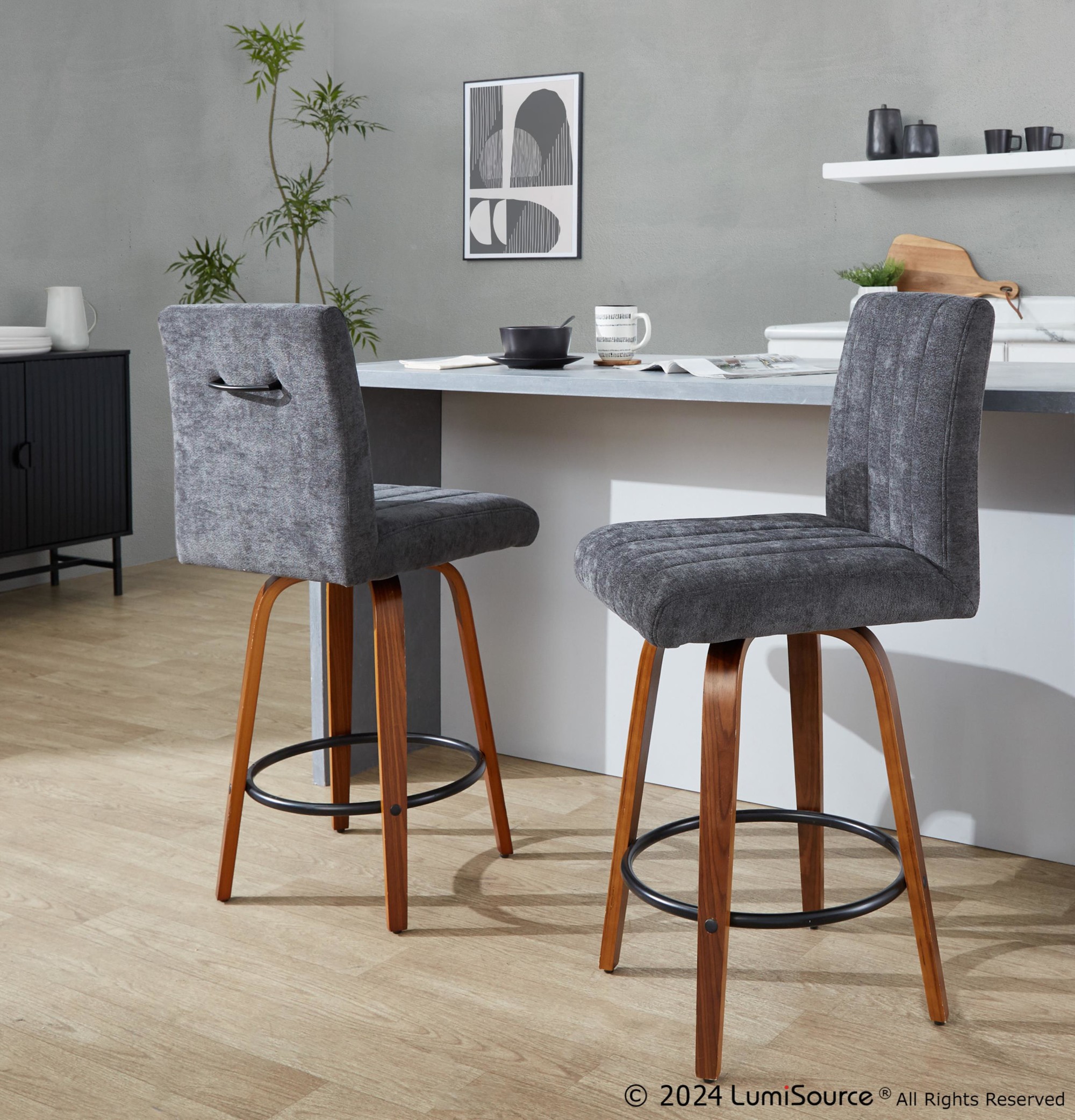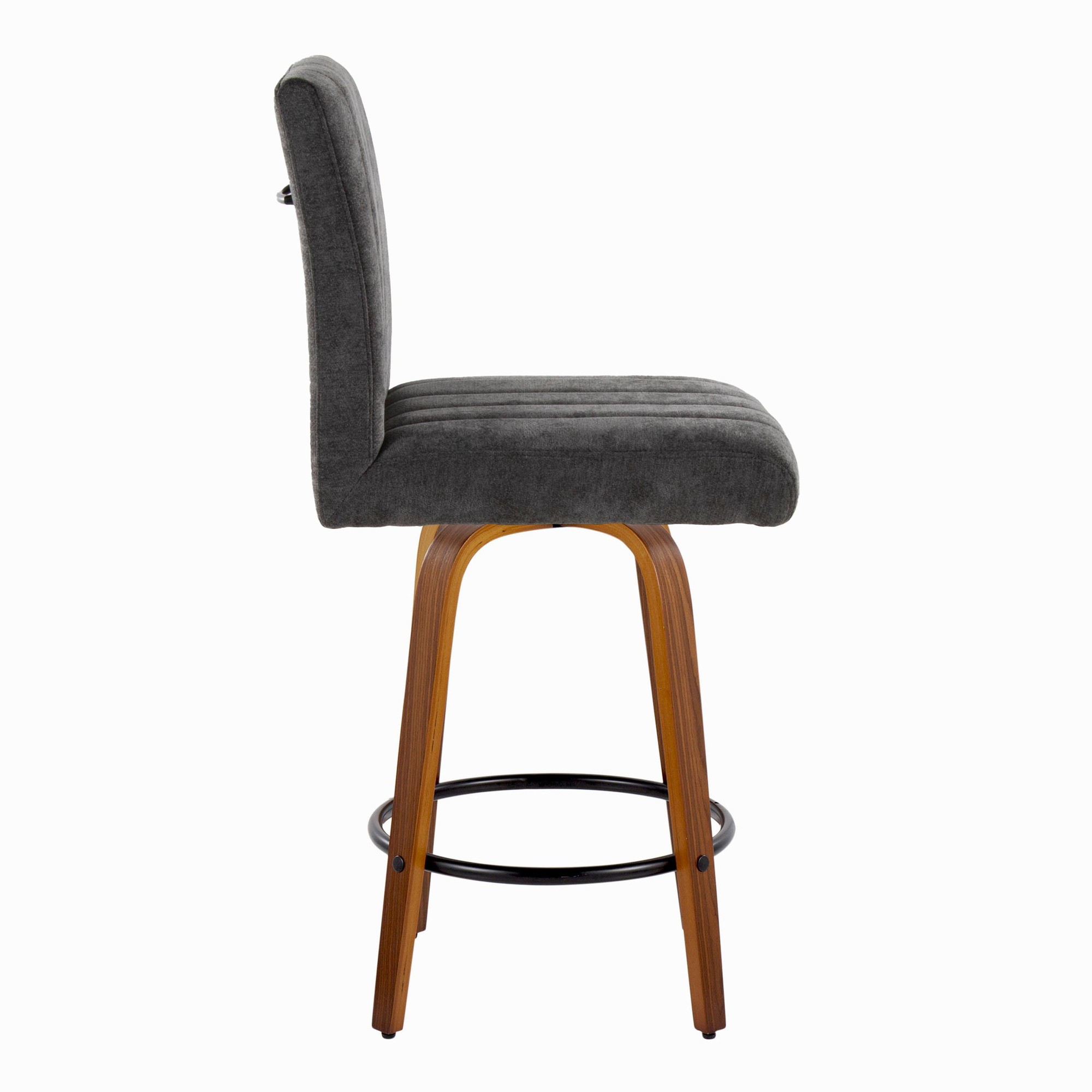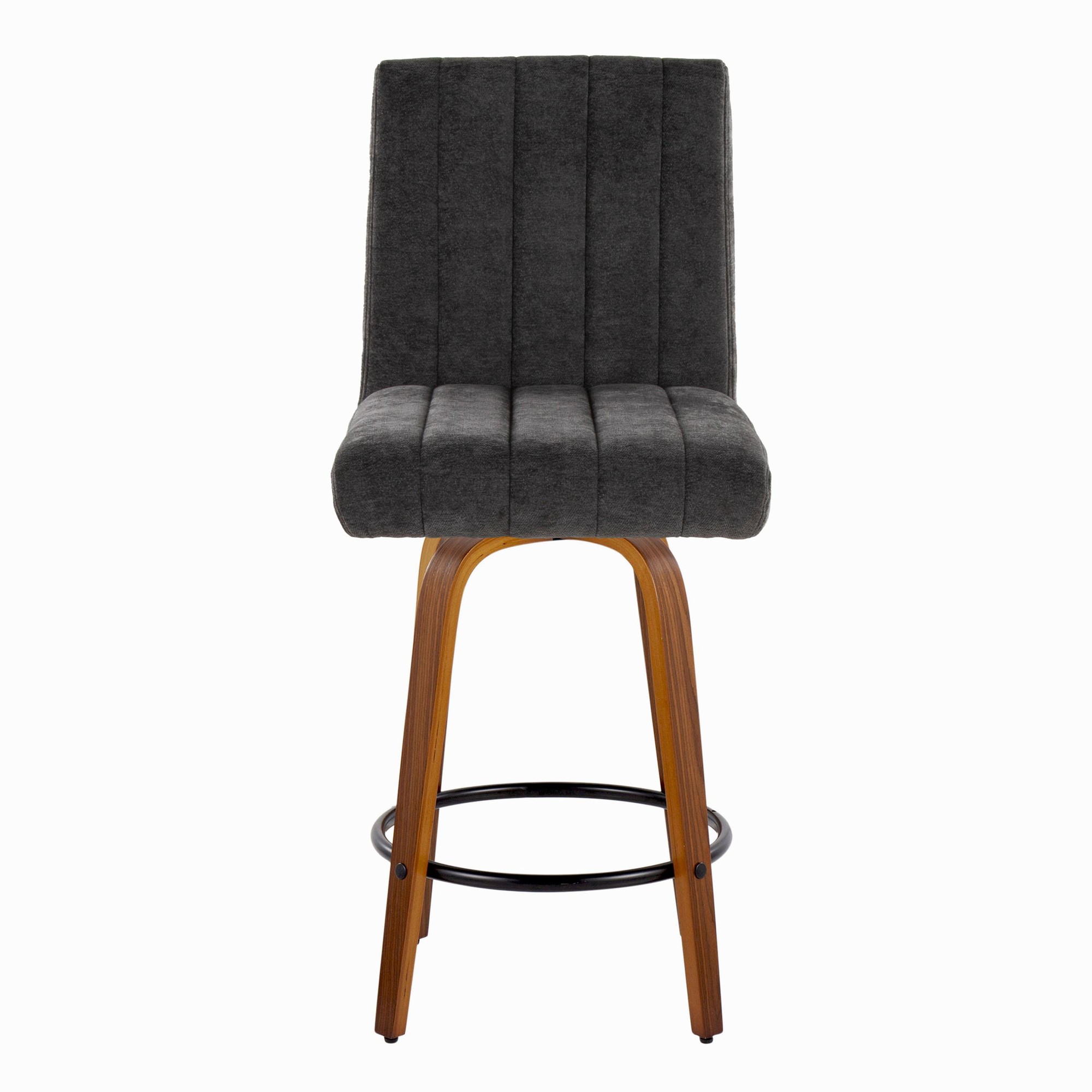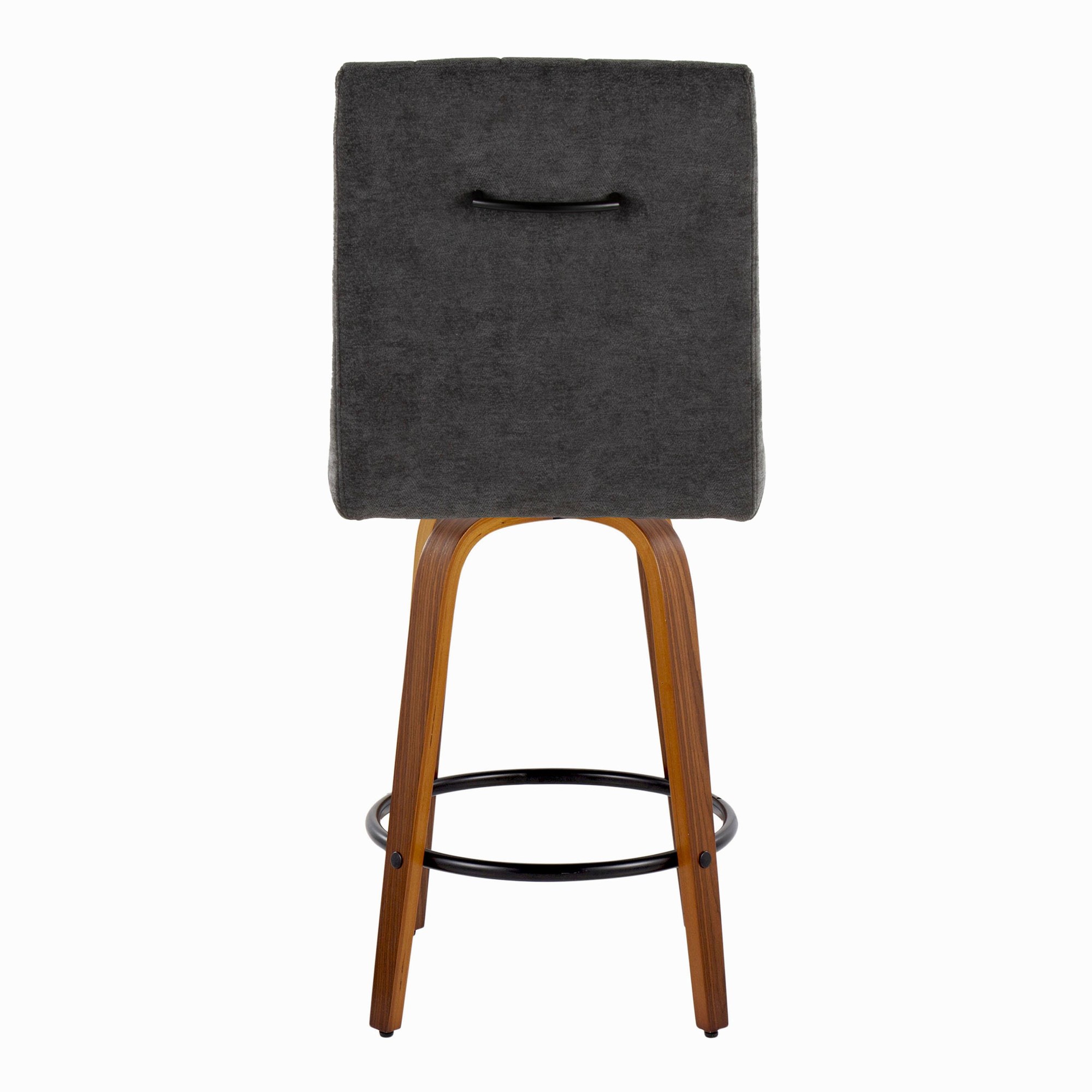 The Hank 26 Contemporary Walnut and Black Swivel Counter Stools offer a modern blend of style and comfort. These stools feature a plush, tufted, cushioned seat, a decorative handle on the seat back, and a sturdy wood frame. The sleek, tapered legs and 360-degree swivel provide both elegance and functionality, making them the perfect seating solution for your kitchen or dining area. These stools are sold in pairs.
