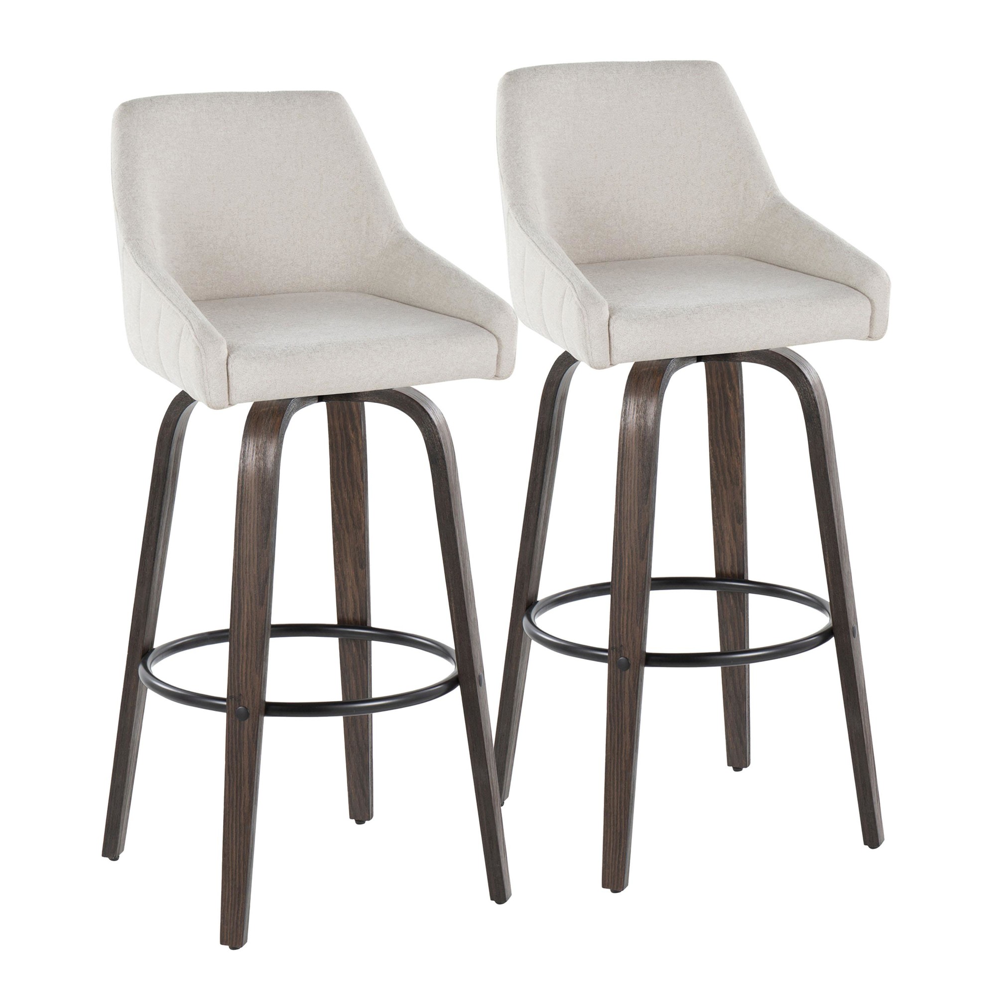 The Hannah Barstools are sold in sets of two. The stylish fabric upholstery and bent wood legs with a round black metal footrest, make this barstool set a must have.
