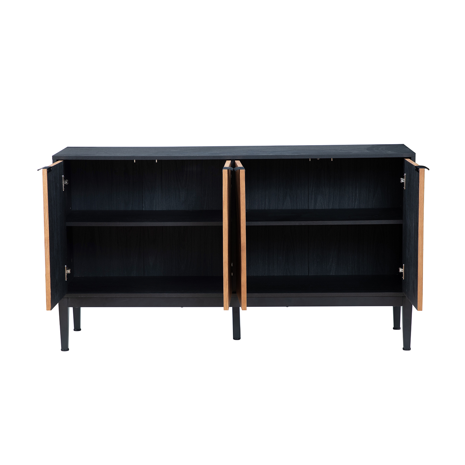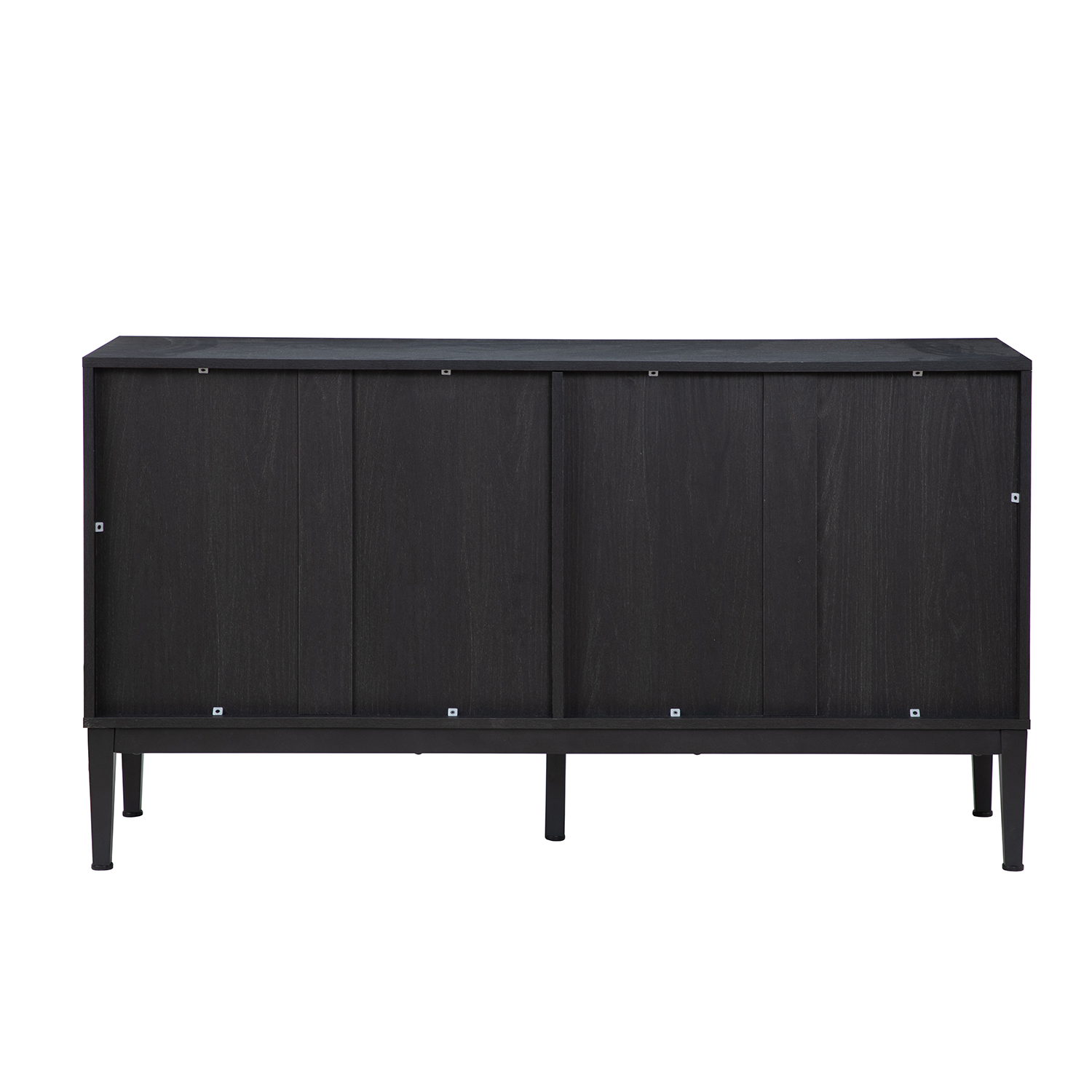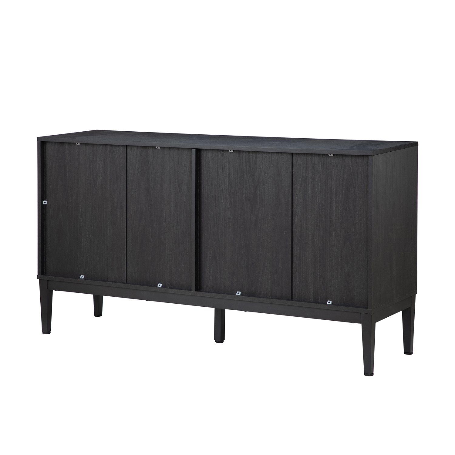 The Hargapas Black Herringbone 4-Door Modern Sideboard is a stylized piece that commands attention with its unique herringbone door design. Its clean black painted frame and metal legs, complete with adjustable pads, provide a balanced and elegant foundation. This sideboard offers ample hidden storage to keep your home clutter-free.