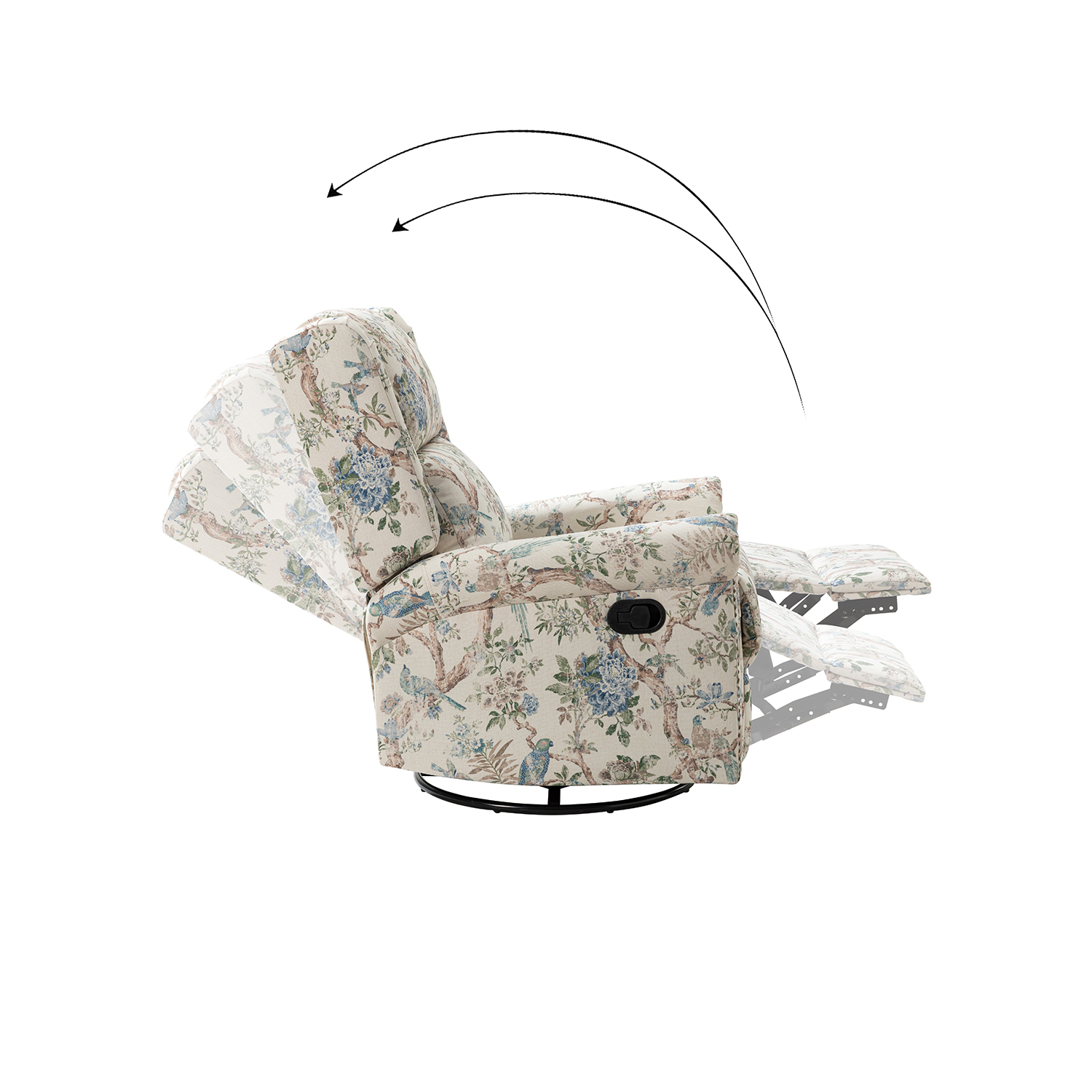 This recliner blends transitional style with ultimate comfort. Featuring a unique backrest and clean lines, this piece offers a minimalist yet practical design. The thick foam padding ensures a comfortable experience, perfect for your living room or reading nook. The bird print linen adds flair, while the nailhead trim provides a touch of vintage charm. Adjust the recliner to your preferred angle for optimal relaxation.