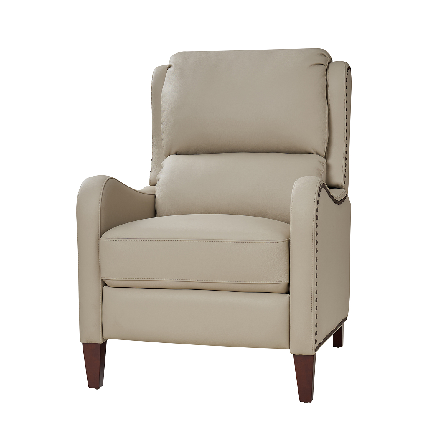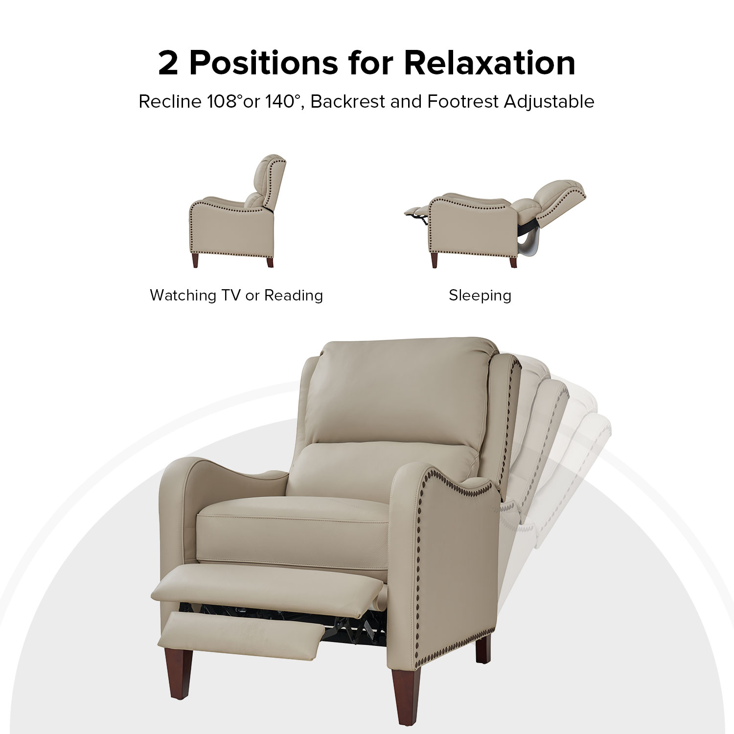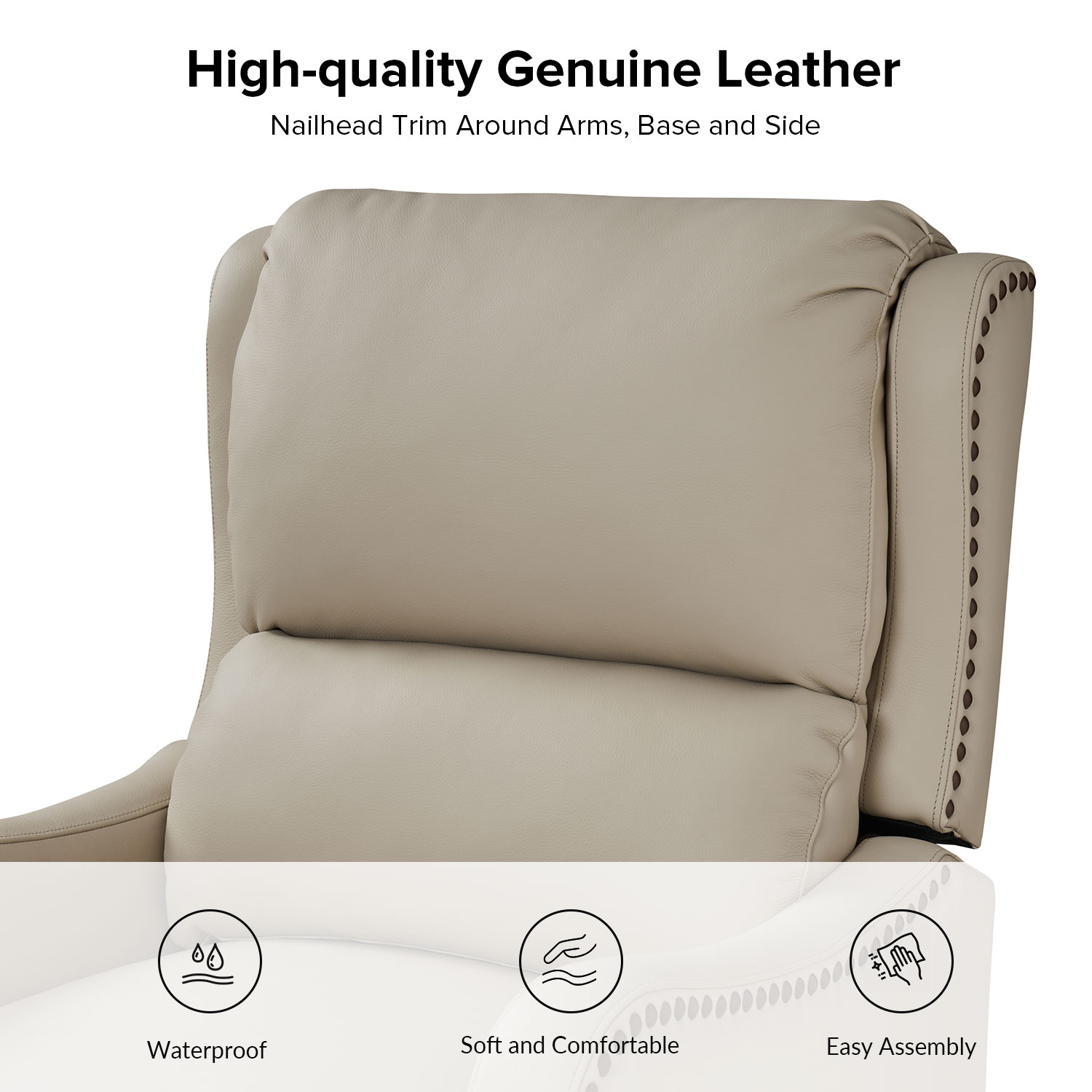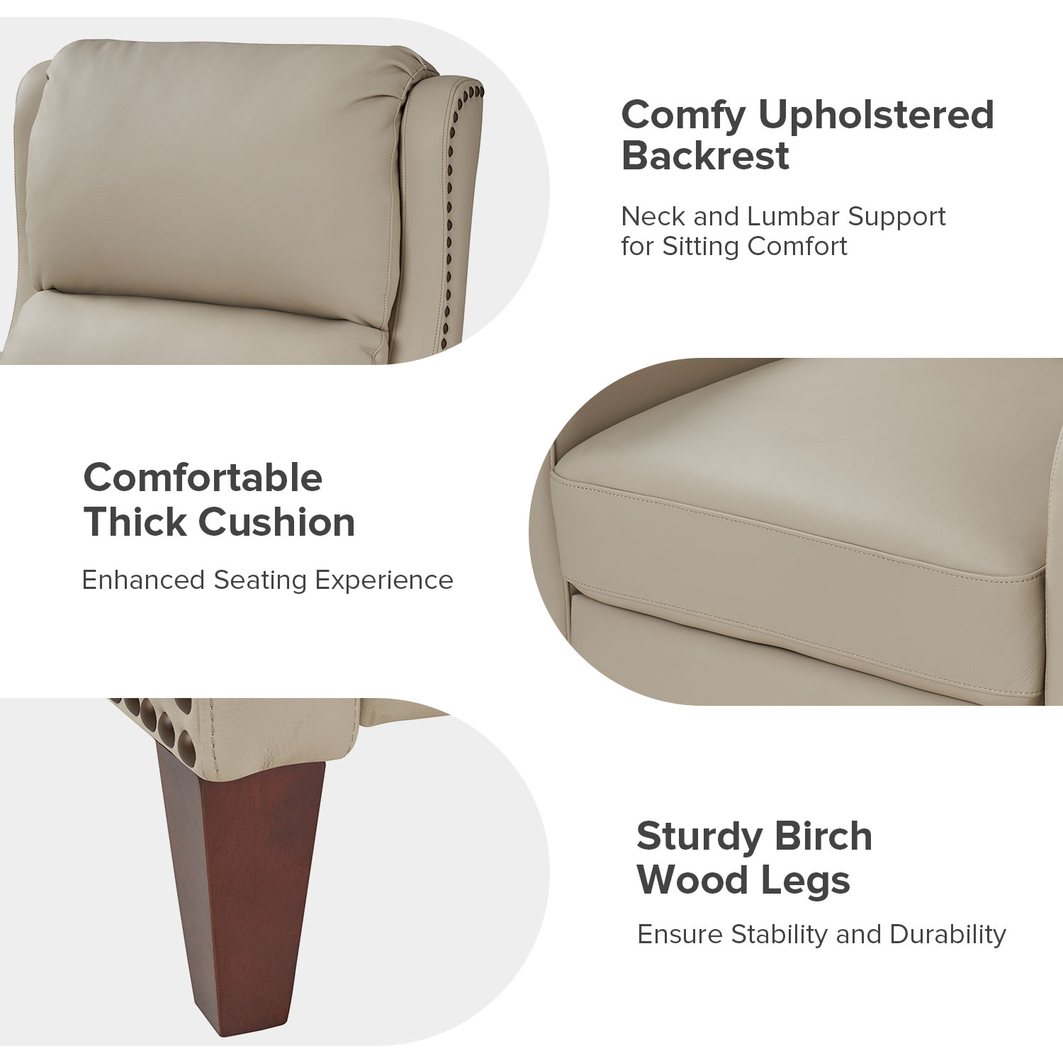 Sink into the luxurious comfort of the Hyde Beige Genuine Leather Wingback Push-Back Recliner. A modern twist on a classic design, this recliner is built on a solid hardwood frame and features thick foam cushioning for exceptional comfort. Upholstered in a blend of genuine top-grain leather and vegan leather, it offers an inviting feel with its elegant nailhead trim. Simply push back to recline up to 140 degrees – no levers or buttons needed! Enjoy comfortable seating and back support for long-term sitting, TV viewing, or relaxed reclining.