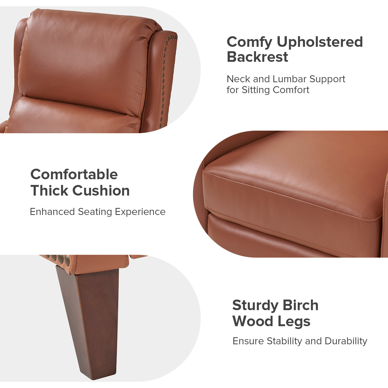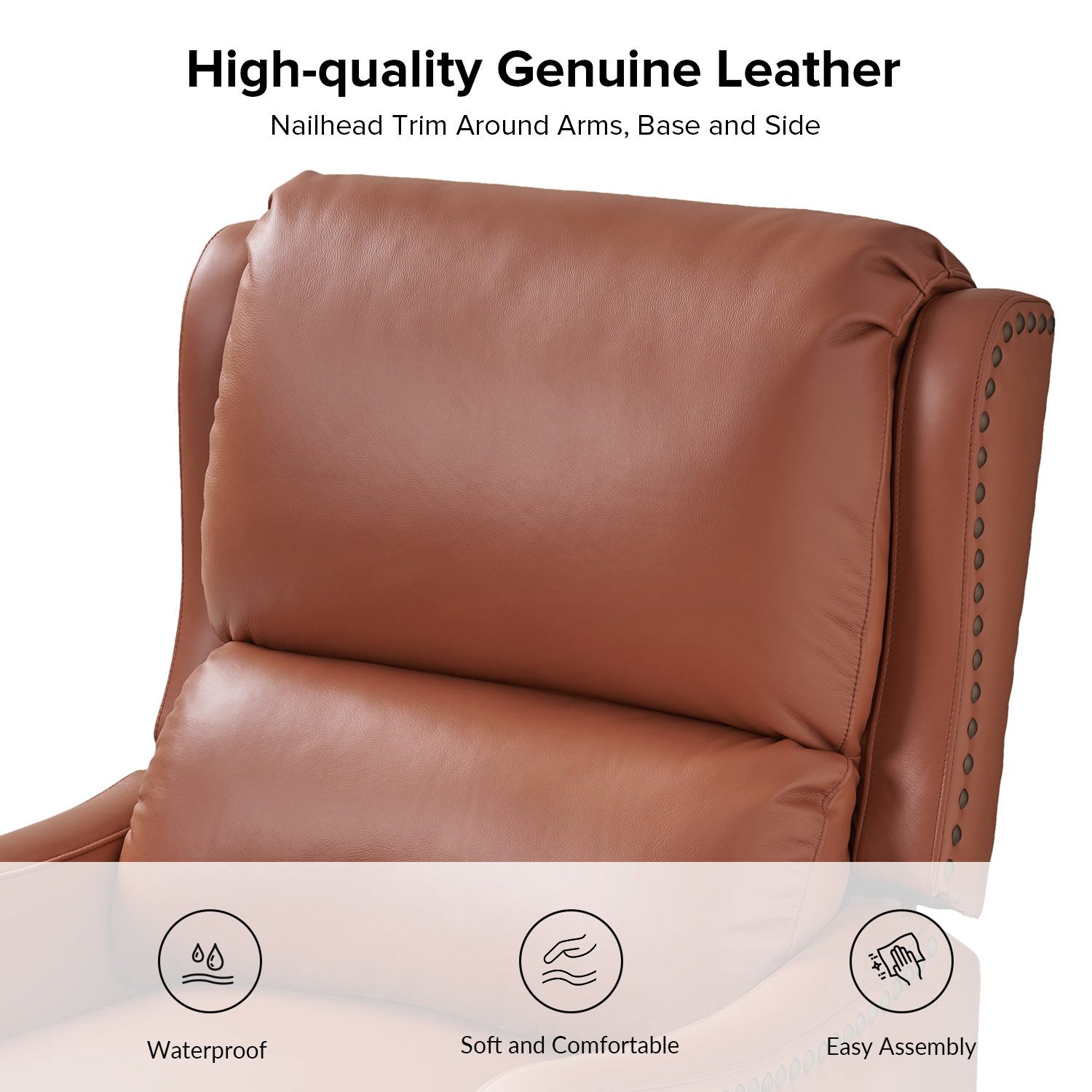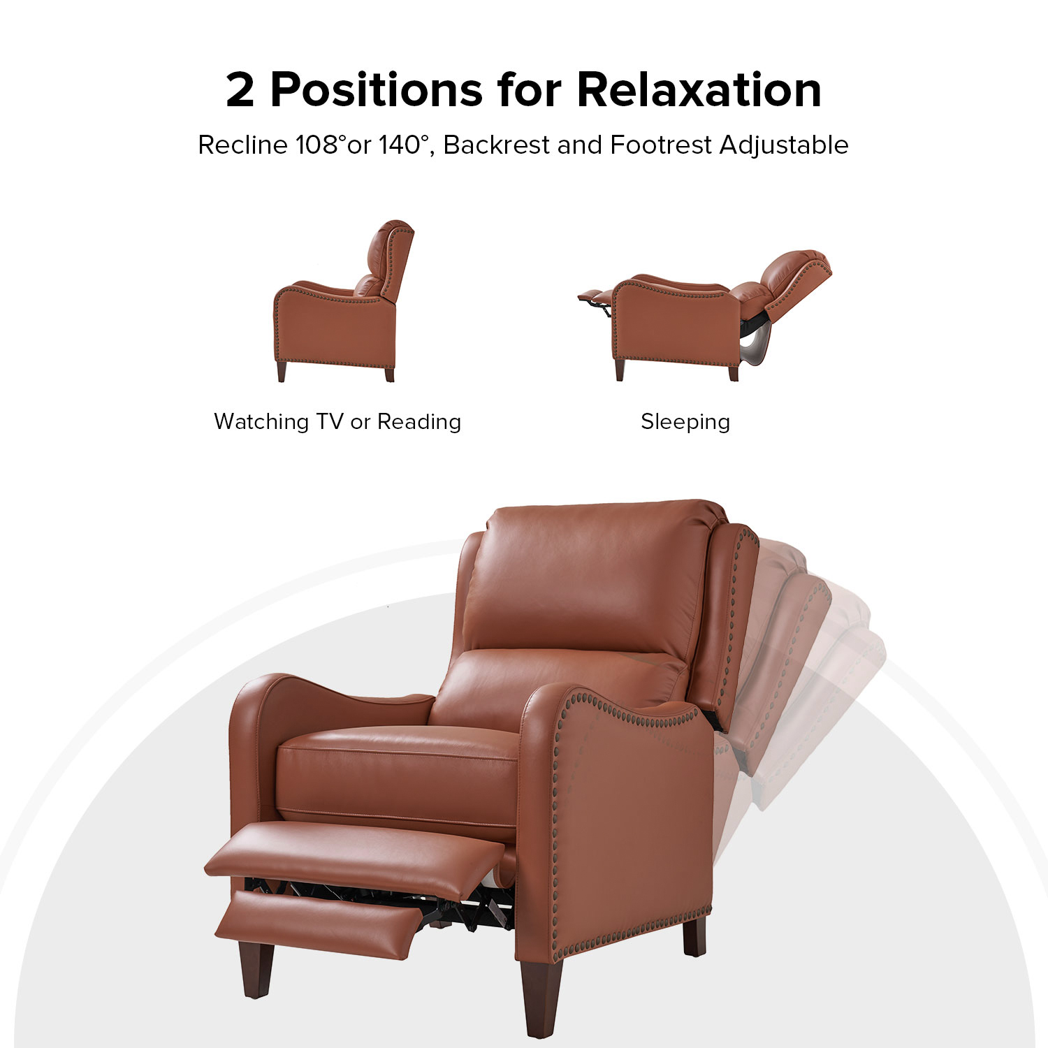 Sink into the luxurious embrace of the Hyde Brick Genuine Leather Nailhead Trim Wingback Recliner! This isn’t just a chair; it’s your personal relaxation headquarters. Featuring supple, genuine leather where it matters most and a classic wingback design, this recliner invites you to unwind in style. With its easy push-back reclining mechanism, you can effortlessly kick back and enjoy maximum comfort without fumbling for levers or buttons!