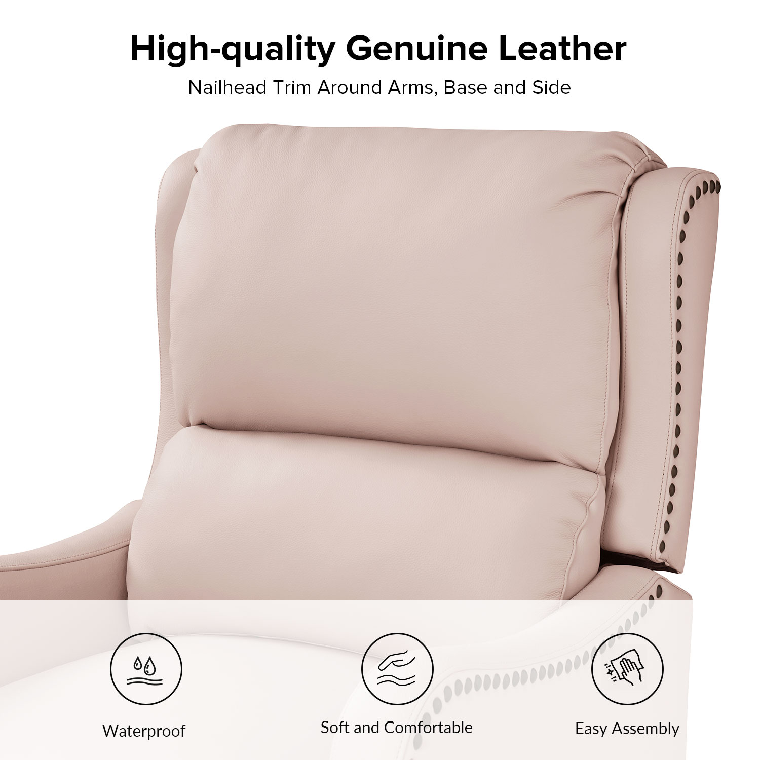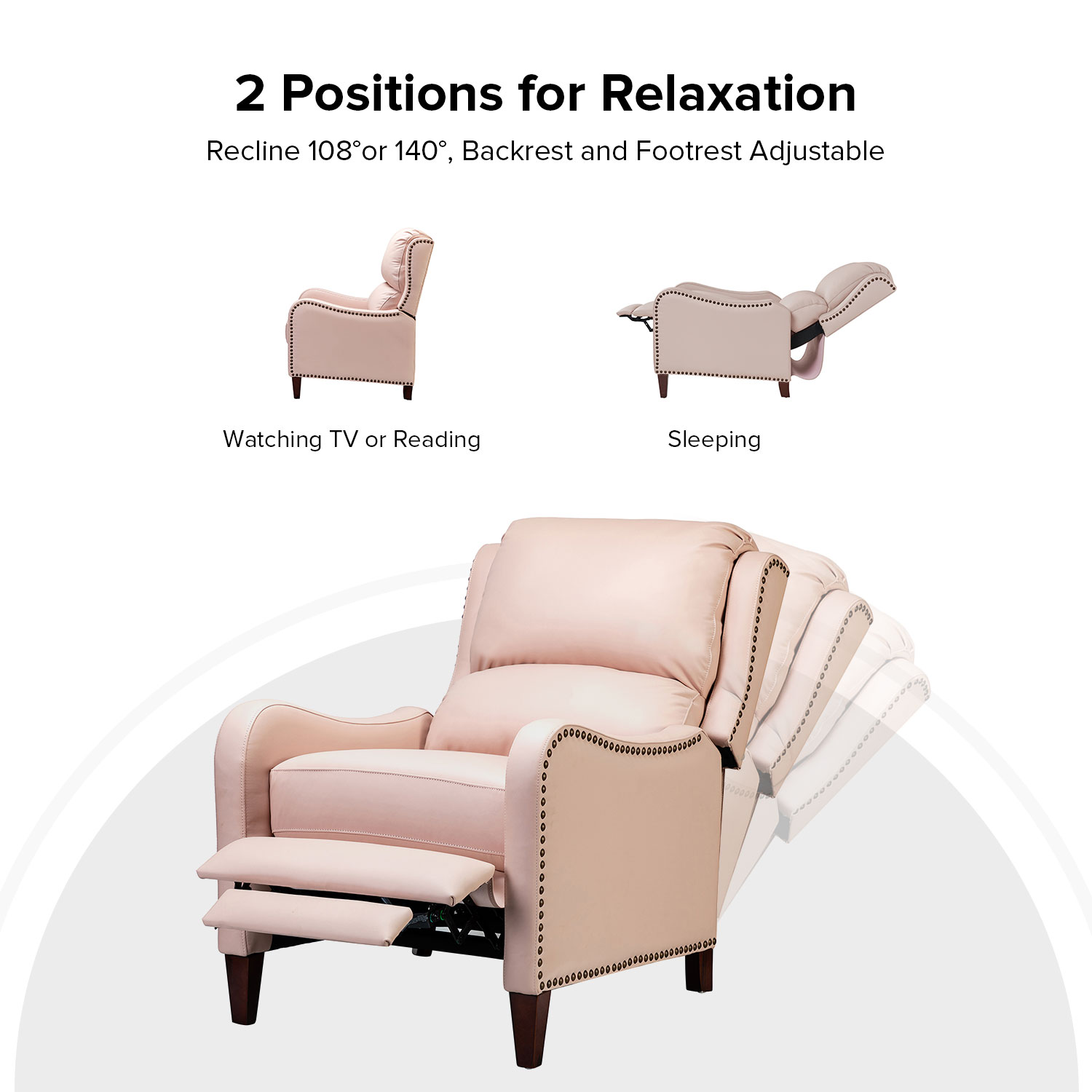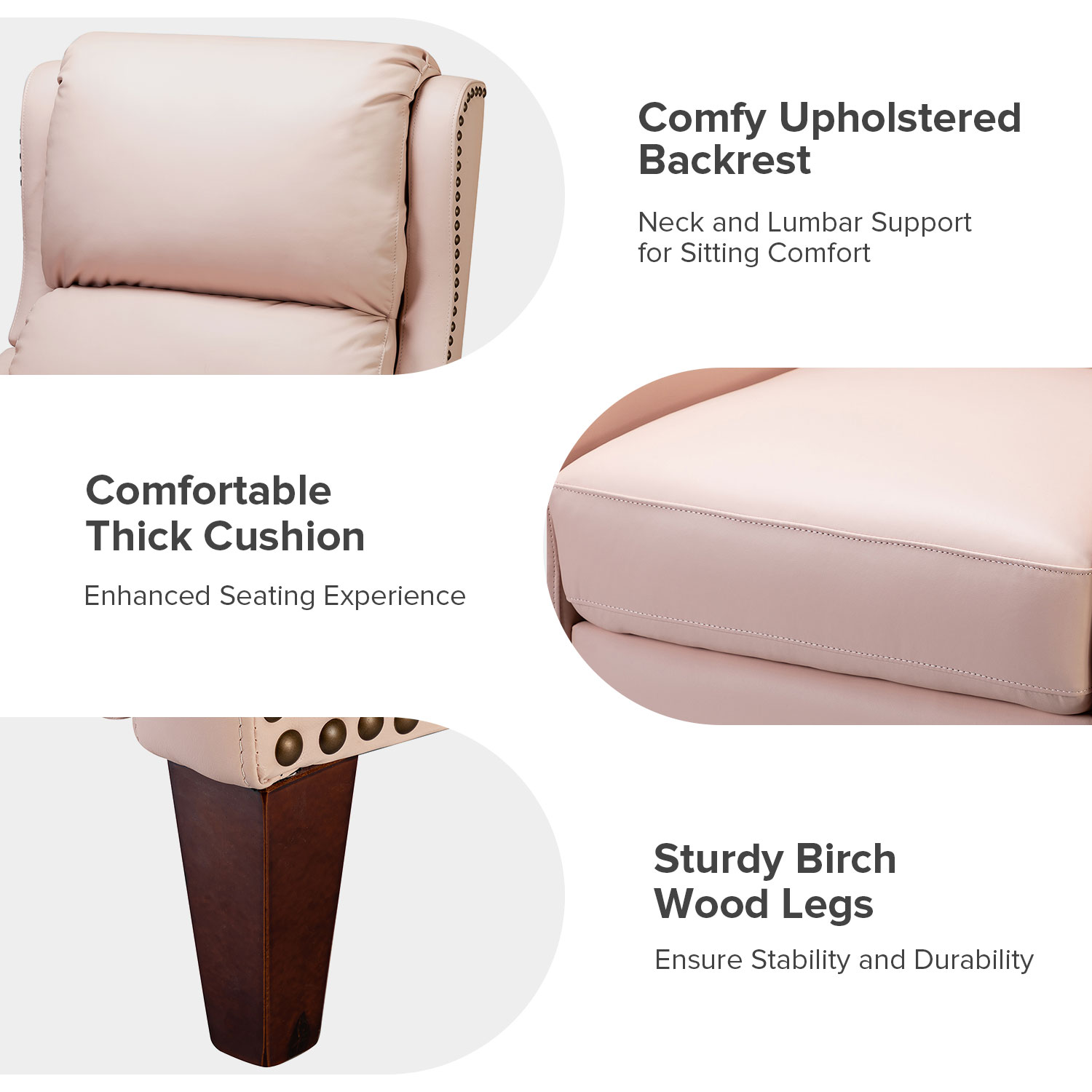 Add a touch of style to your space with this Hyde Leather Mid-Century Modern Wingback Push-Back Recliner. Built with a solid hardwood frame, this modern take on a classic wingback recliner is both stylish and comfortable. The thick foam cushioned seat is wrapped in a blend of genuine top-grain leather and vegan leather, with nailhead trim for an inviting look. This recliner is easy to use! Simply push back to recline up to 140 degrees, no levers or buttons are needed. It provides comfortable seat and back support for watching TV or just relaxing. This pink recliner adds comfort and style to any room. The dimensions are 28.75″ W x 37″ D x 42″ H, with a seat size of 22″ W x 20.5″ D x 20″ H. The product weighs 86 lbs. Some assembly is required.