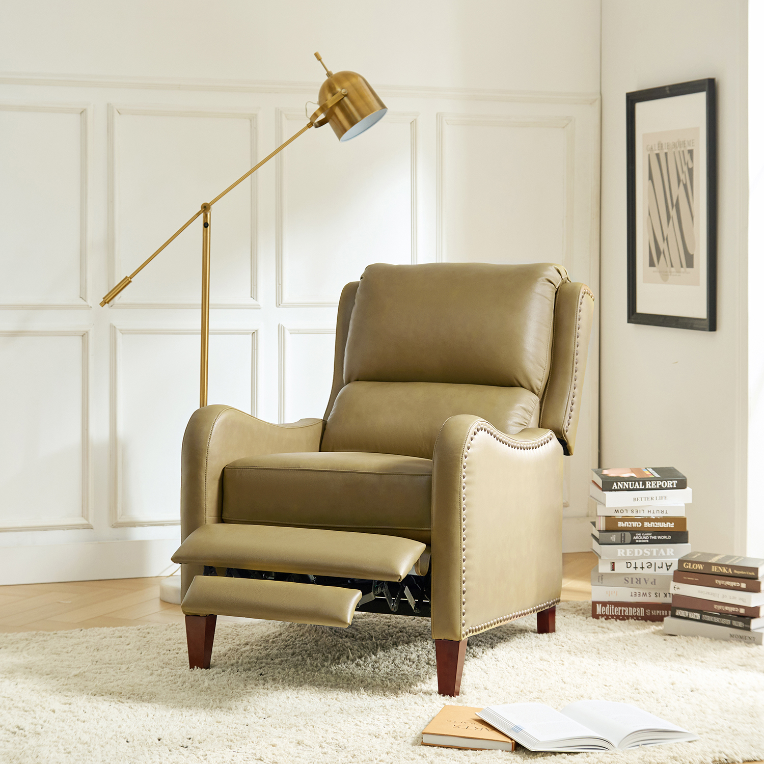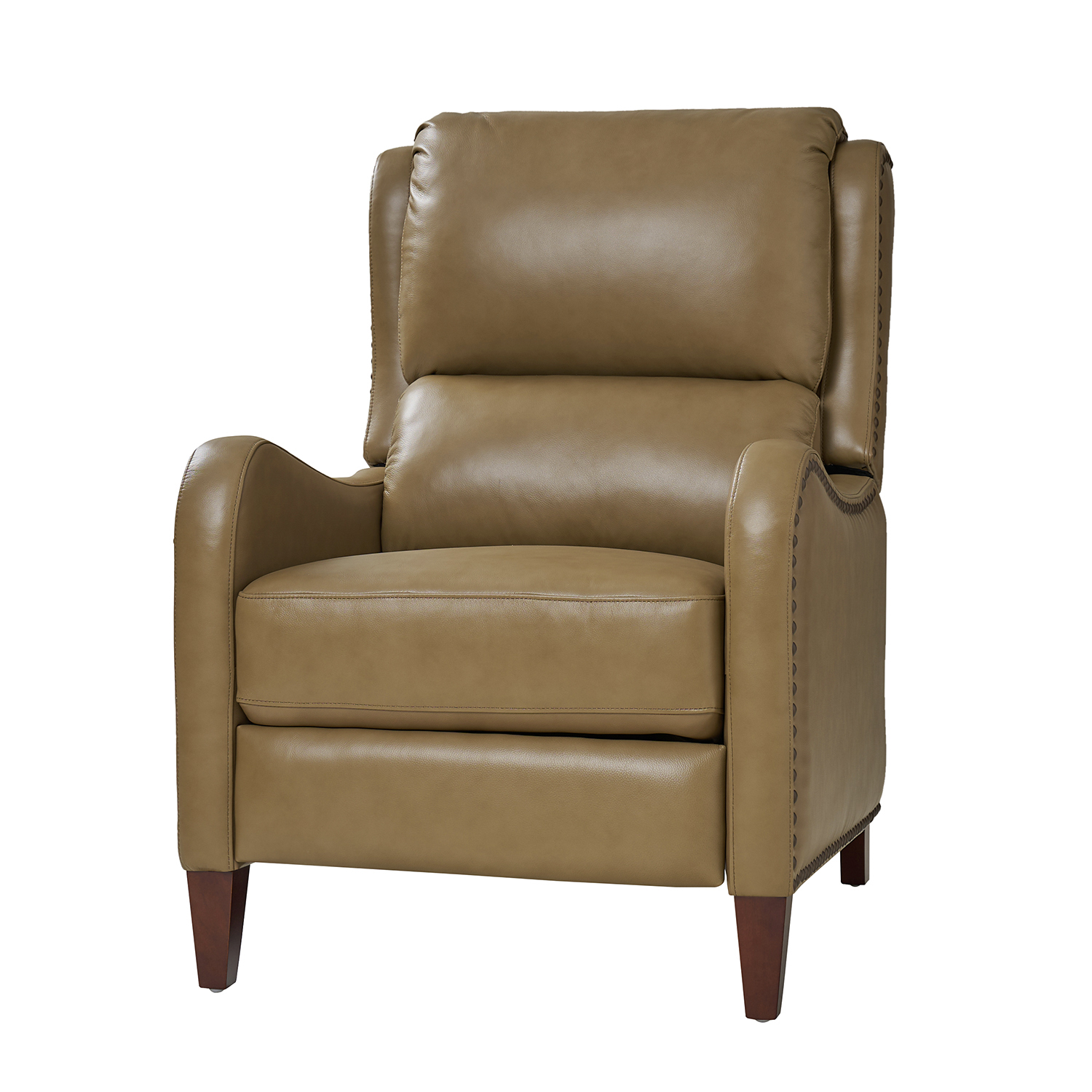 Sink into sophisticated relaxation with the Hyde Taupe Genuine Leather Wingback Mid-Century Modern Recliner. A modern twist on the classic wingback design, this recliner is crafted with a solid hardwood frame and features a thick foam-cushioned seat for exceptional comfort. Upholstered in a blend of genuine top-grain leather and vegan leather, it exudes quality and style. Simply push back to recline up to 140 degrees – no levers or buttons needed!