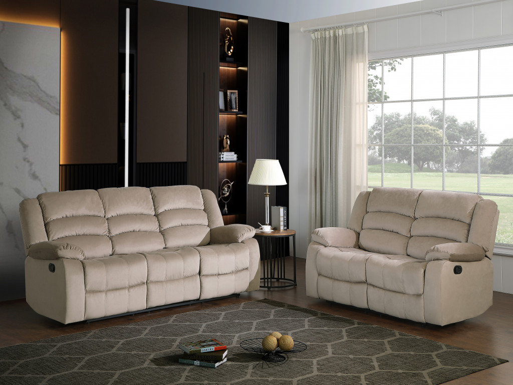 Step into a world of unparalleled seating comfort with the remarkable two-piece indoor beige microsuede five-person seating set. This luxurious reclining sofa and loveseat combination offers ultimate relaxation and style, making it the perfect addition to any living space. The soft and durable microsuede upholstery ensures longevity, while the coil spring seat construction provides even weight distribution, reducing pressure points for enhanced comfort. Designed to bring family and friends together, this set offers both functionality and aesthetic appeal in a compact design.