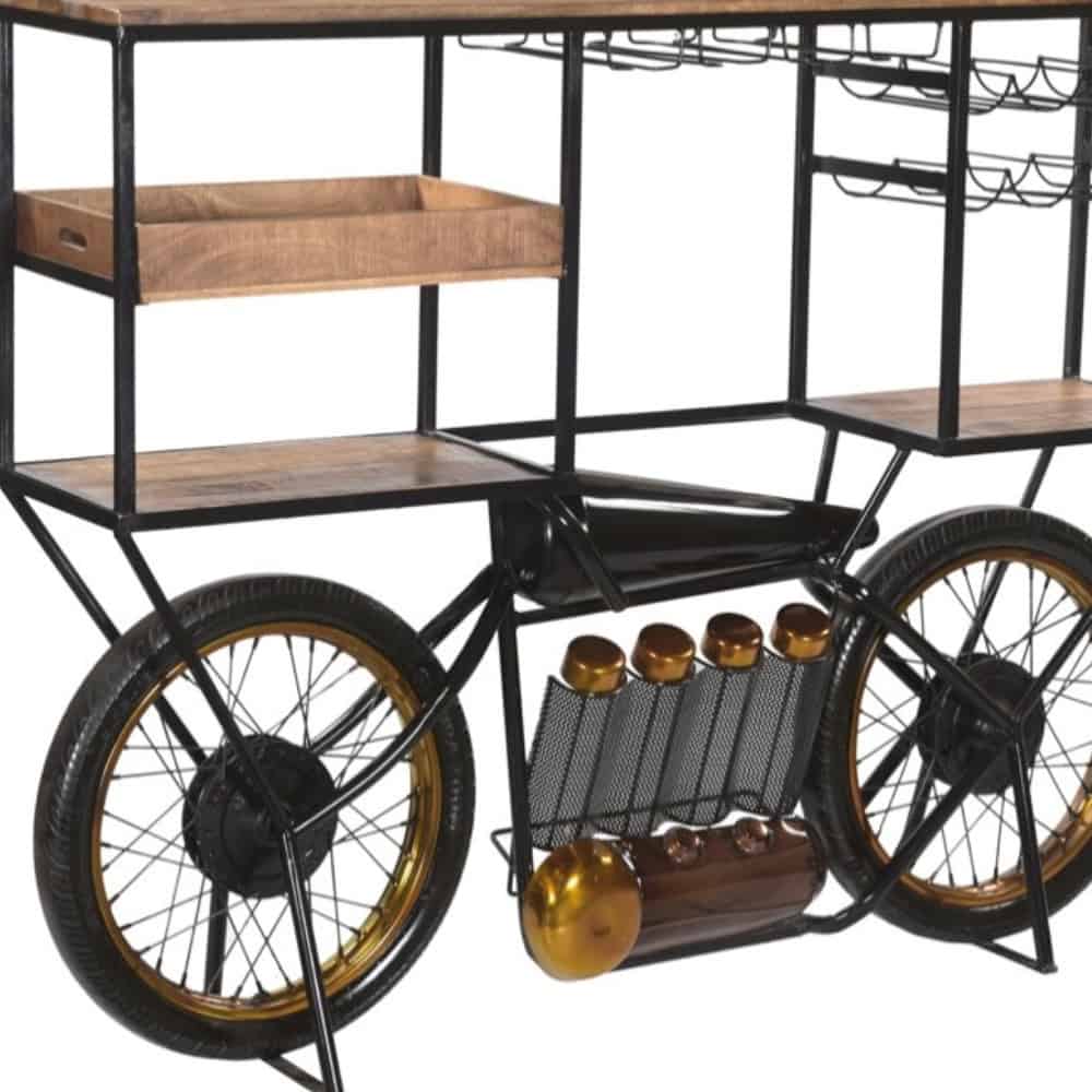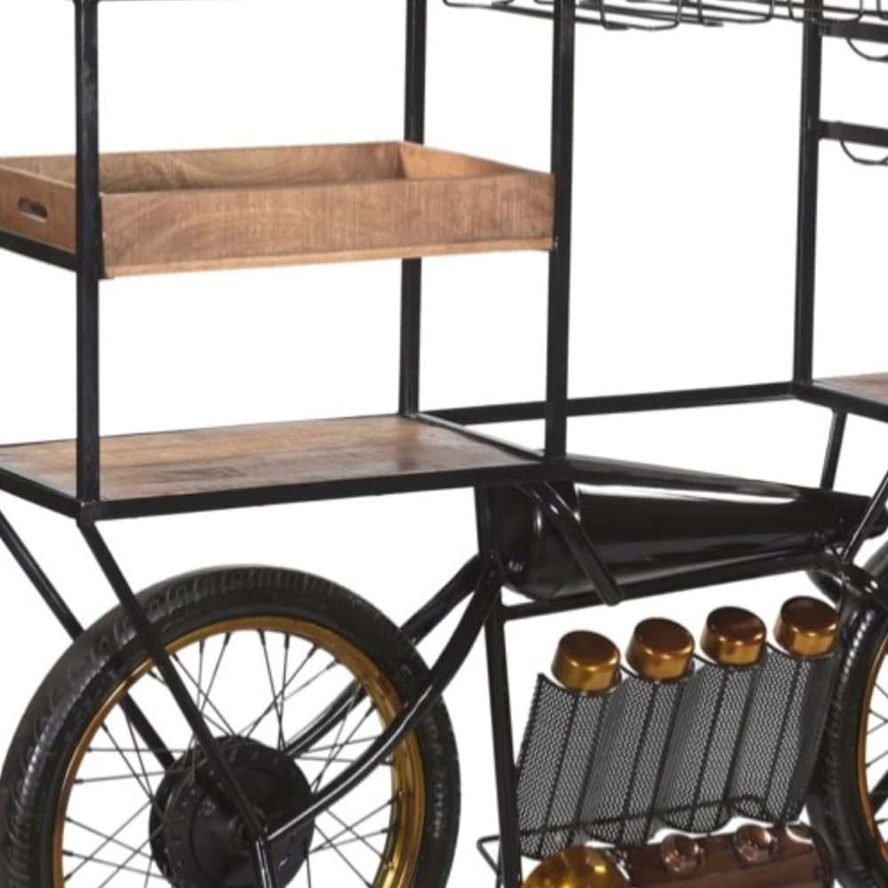 Add a touch of elegance and convenience to your home with the Industrial Brown and Black Wood Bar Cart With Wine Storage. This bar cart combines style and functionality, making it a versatile addition to any space. Crafted with a sturdy metal frame and a sleek solid wood top, it is designed for durability and aesthetic appeal. Its industrial design and reclaimed rustic look create a striking focal point in any room. The rectangular shape ensures it fits seamlessly into your layout, while the ample wine storage keeps your favorite bottles within easy reach. Whether entertaining guests or enhancing your home decor, this bar cart delivers both practicality and charm.