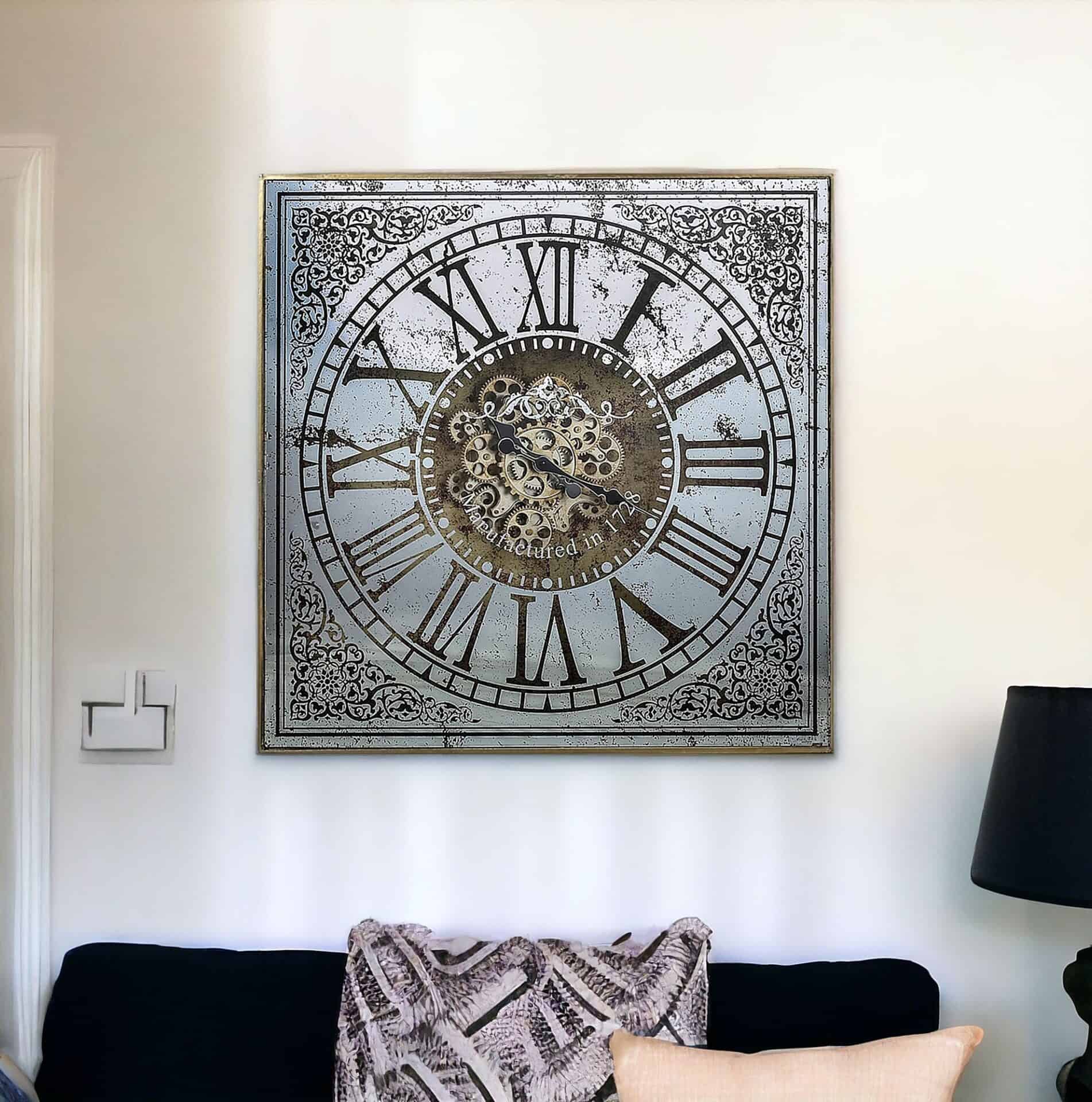 Taking inspiration from industrial aesthetics and modern elegance, the Industrial Silver and Gold Square Wall Clock with Roman Numerals is a captivating addition to your space. The weathered silver base is adorned with intricate matte black scroll patterns at the corners, while bold Roman numerals encircle a cluster of cogs and gears, creating a striking visual appeal. This wall clock features an aged finish and industrial elements, making it a versatile piece that complements both contemporary and traditional decor. Its antique-inspired design adds character and depth, making it a standout centerpiece in any room.