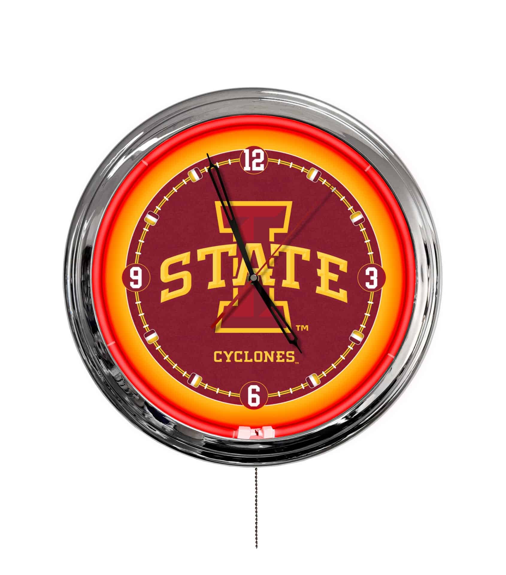 The Iowa State University 16-Inch LED Wall Clock in Chrome is a stylish and efficient alternative to traditional neon clocks. This vibrant clock features a variety of eye-catching colors that illuminate the logo against a sleek chrome casing. With 20 static colors and 19 dynamic modes, you can easily adjust the speed and brightness to suit any atmosphere. The clock is powered by a UL listed transformer and features accurate quartz movement, making it both functional and fashionable.