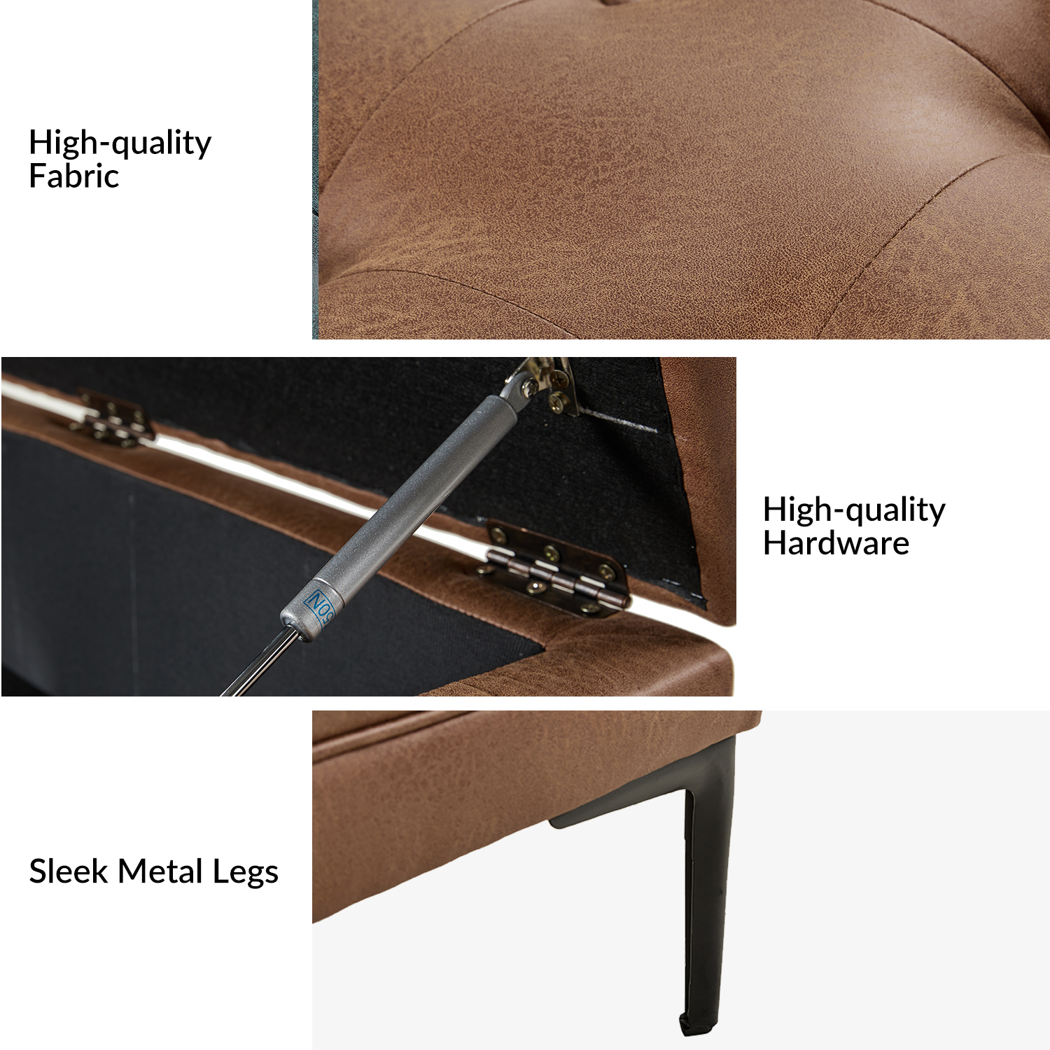 This versatile ottoman is a harmonious blend of elegance and practicality, bringing together elements from traditional, transitional, and mid-century modern design styles. The button-tufted upholstery exudes timeless sophistication, while the sleek metal legs offer stability and a touch of industrial charm. A hidden storage compartment beneath the seat cushion provides a convenient solution for maintaining a clutter-free living space.