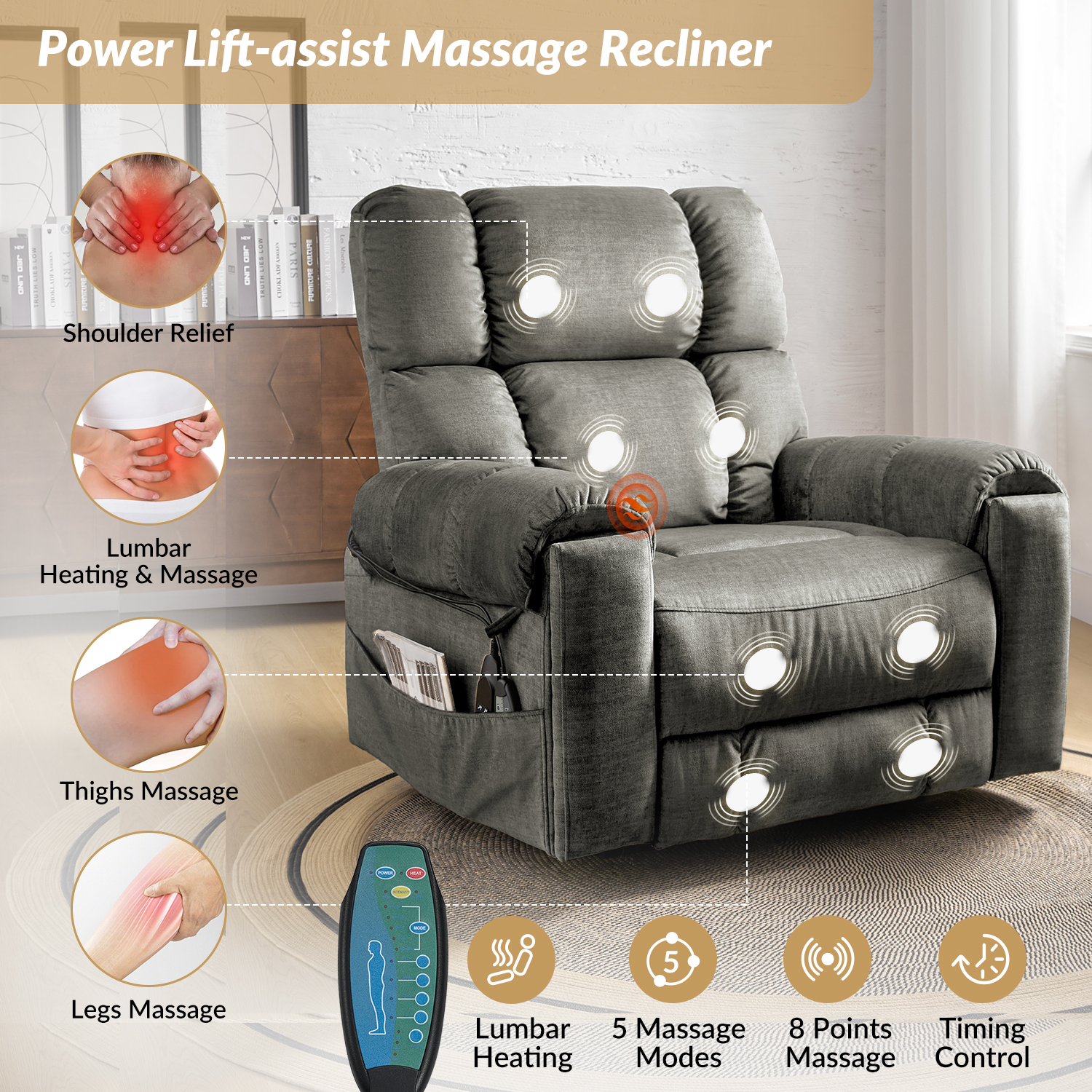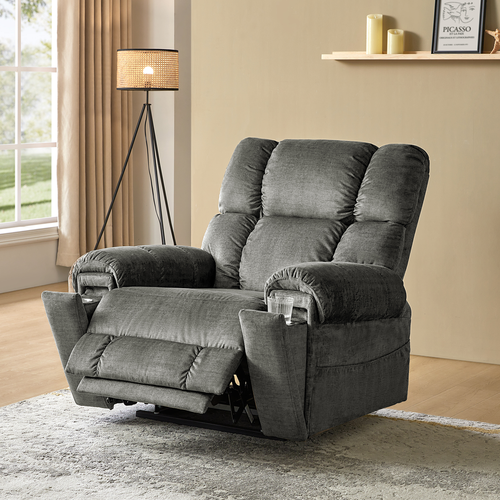 Experience ultimate relaxation and convenience with the Irving Grey Velvet Power Lift Recliner. This transitional recliner is expertly designed for comfort and ease of use, featuring an electric lift mechanism for effortless standing assistance. Independent controls for the backrest and footrest allow personalized relaxation, while massage and heating functions soothe aches.