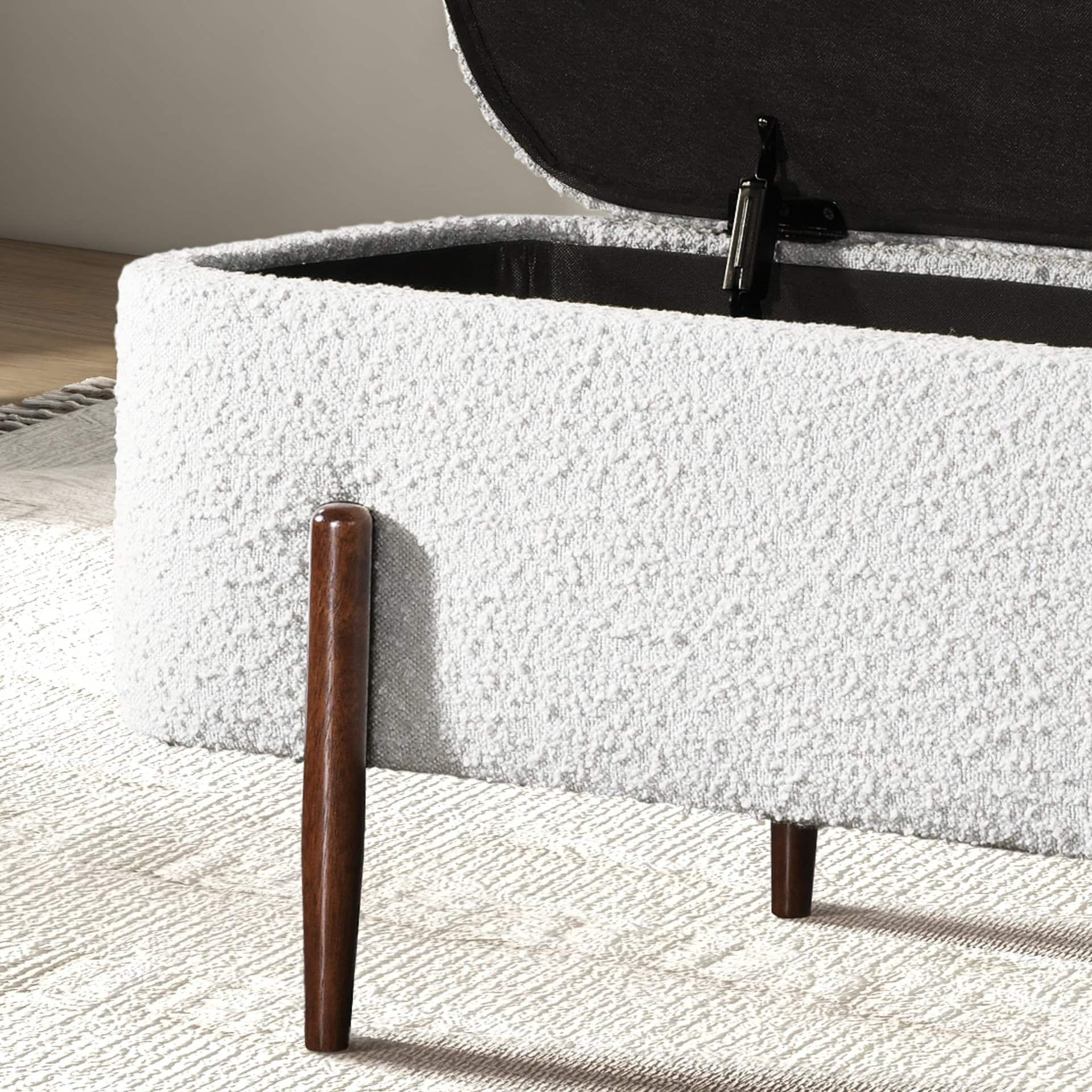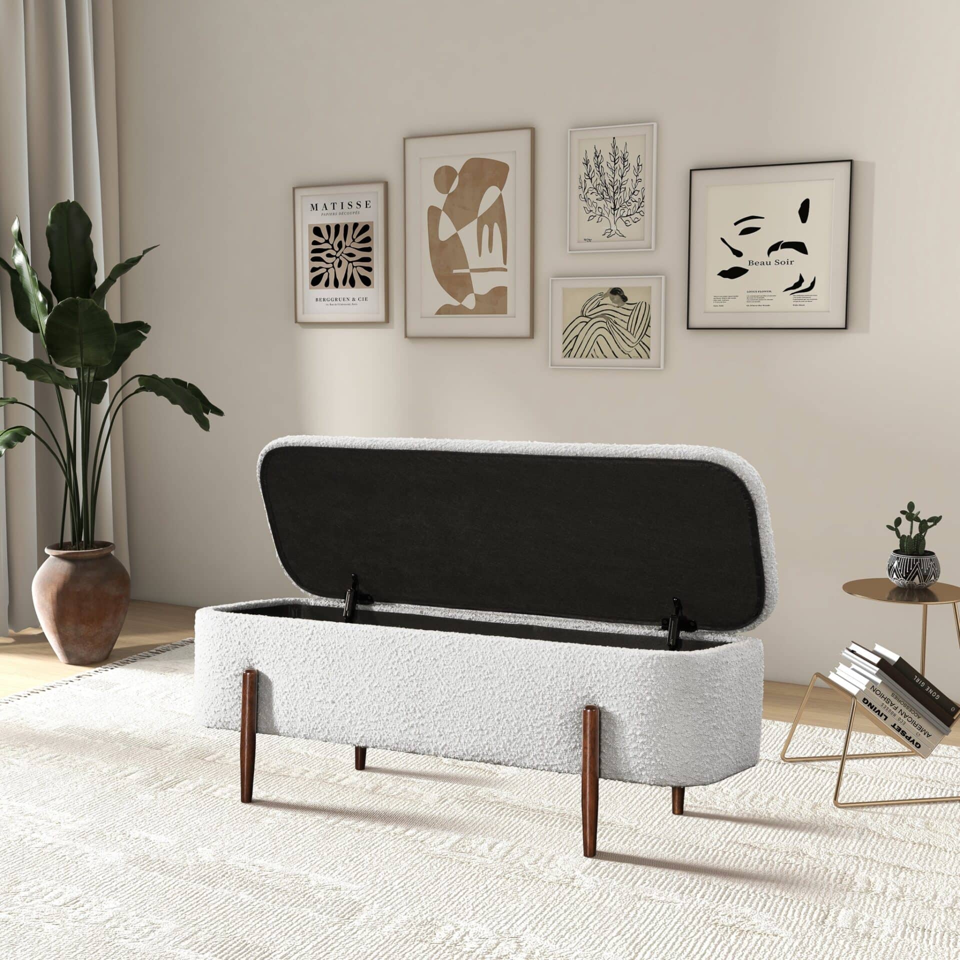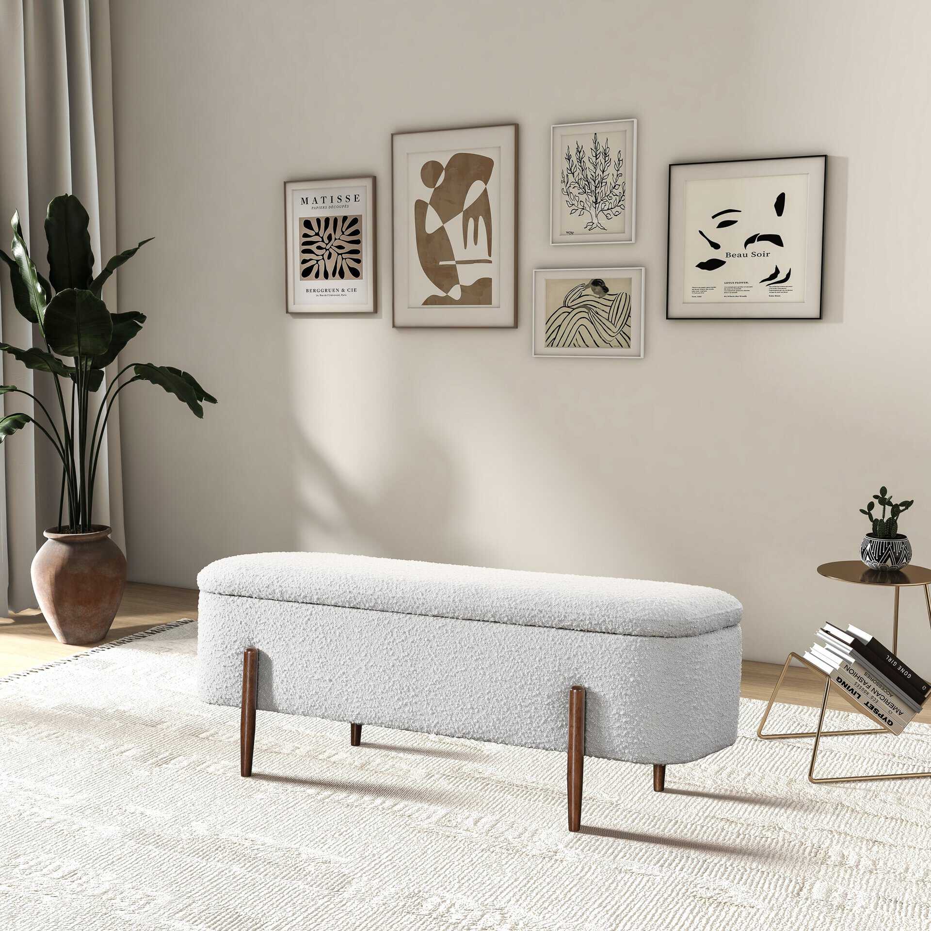 The Ivory Boucle Mid-Century Modern Storage Bench with Teak Frame is a timeless piece designed to elevate any living area, dining room, or bedroom. Featuring a sleek teak frame and luxurious ivory boucle upholstery, this bench combines functionality with classic mid-century modern aesthetics. Its versatile design makes it a perfect addition to a variety of interior styles, offering both seating and storage solutions.