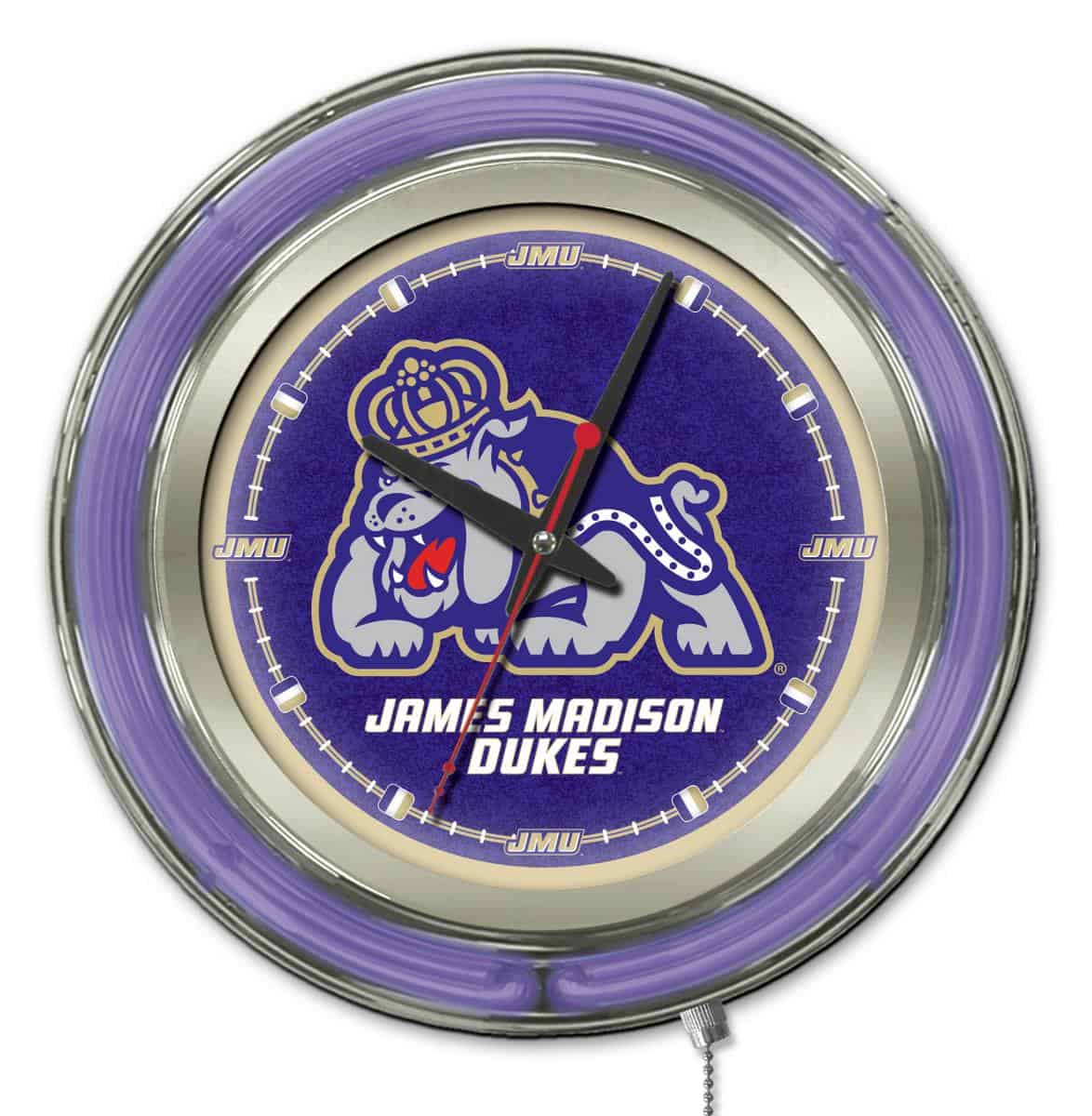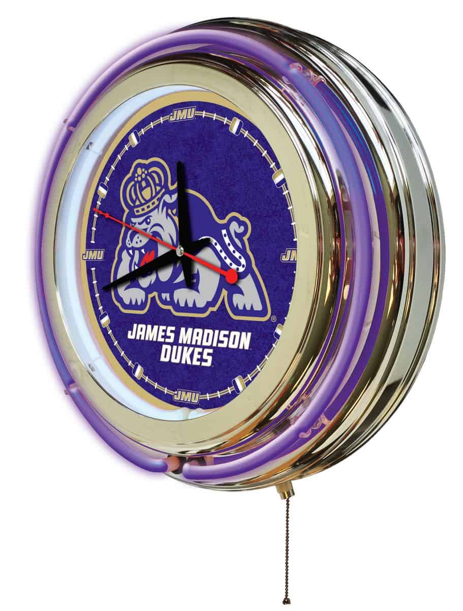The James Madison University 15-Inch Neon Logo Clock in Chrome is the perfect addition to any fan’s collection. This vibrant clock showcases your school pride with its stunning design, featuring a chrome casing and a neon outer ring in team colors. The brilliantly illuminated clock face is enhanced by a white inner neon ring, making it a standout piece. The clock is easily operable with a pull chain and powered by a standard 120V outlet, ensuring convenience and functionality in any setting.