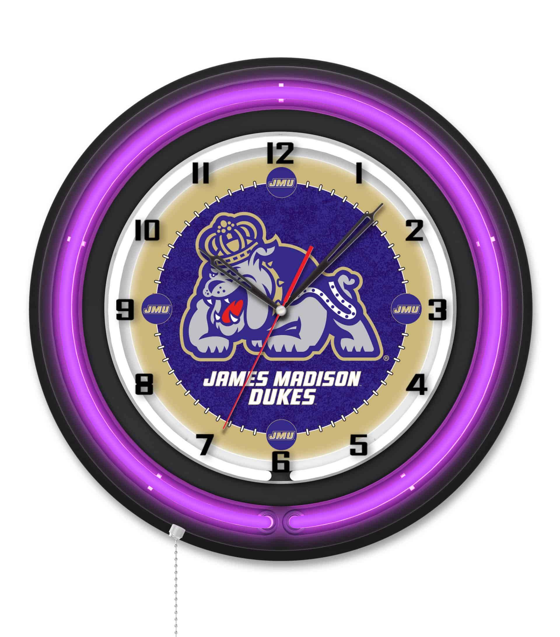 The James Madison University 19-Inch Neon Logo Clock in Black is the perfect addition to any man cave, showcasing your school pride with style. This clock features a sleek black casing and vibrant neon rings that illuminate the custom printed clock face. The brilliant white inner neon ring provides excellent visibility, while the outer neon accent color complements the team’s colors. Designed for convenience, the neon lights can be easily turned on and off with a pull chain, making it a practical choice for any fan.