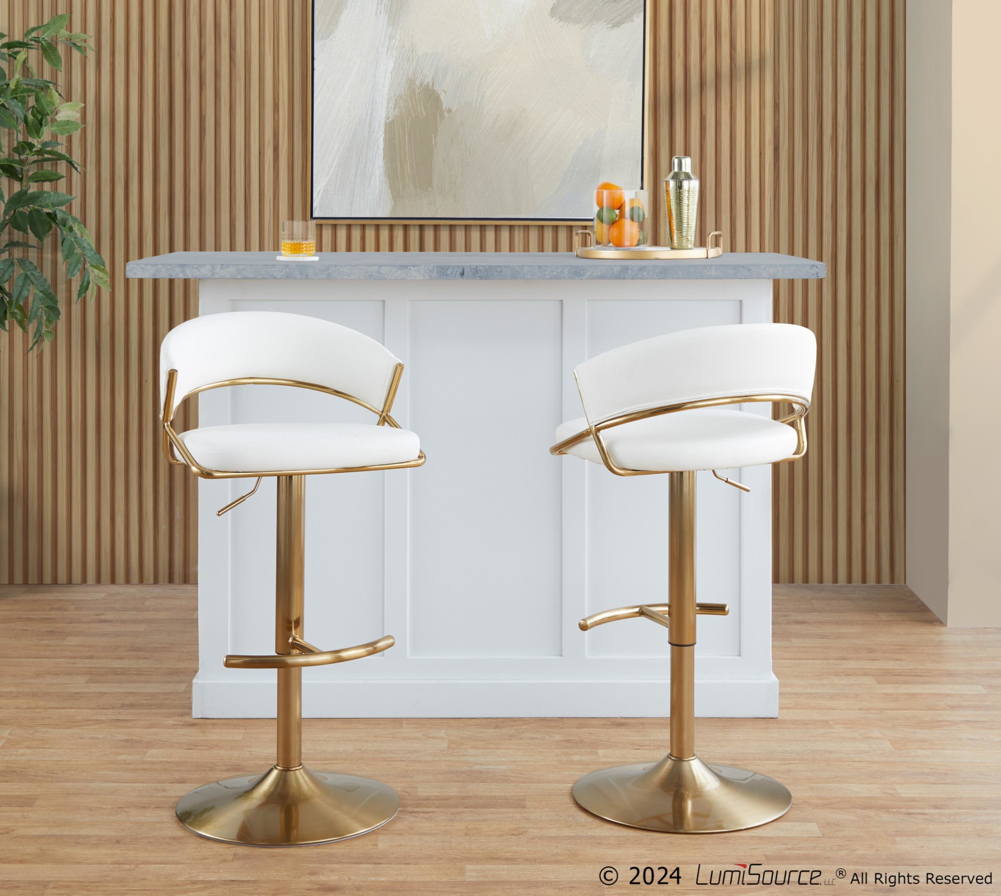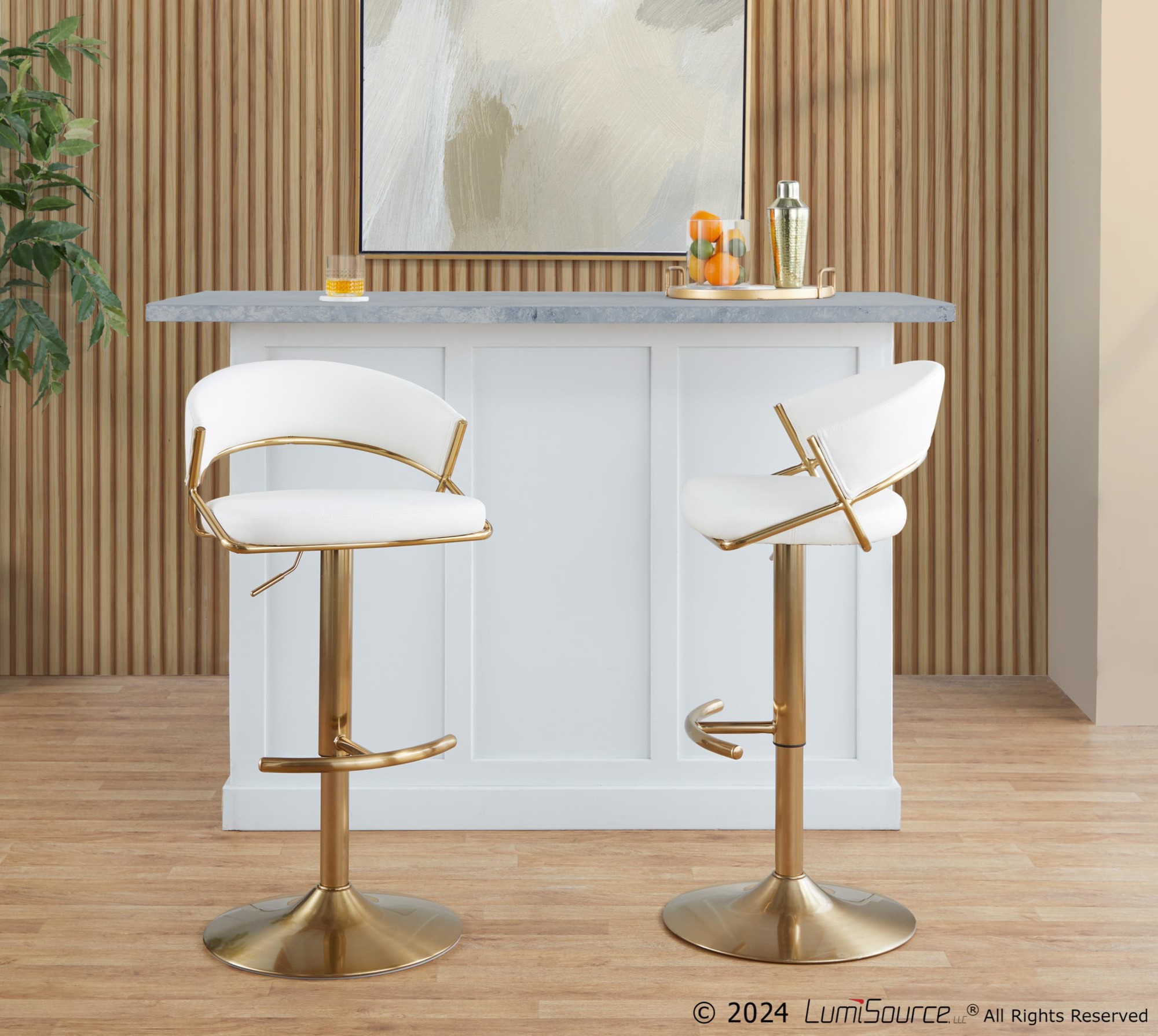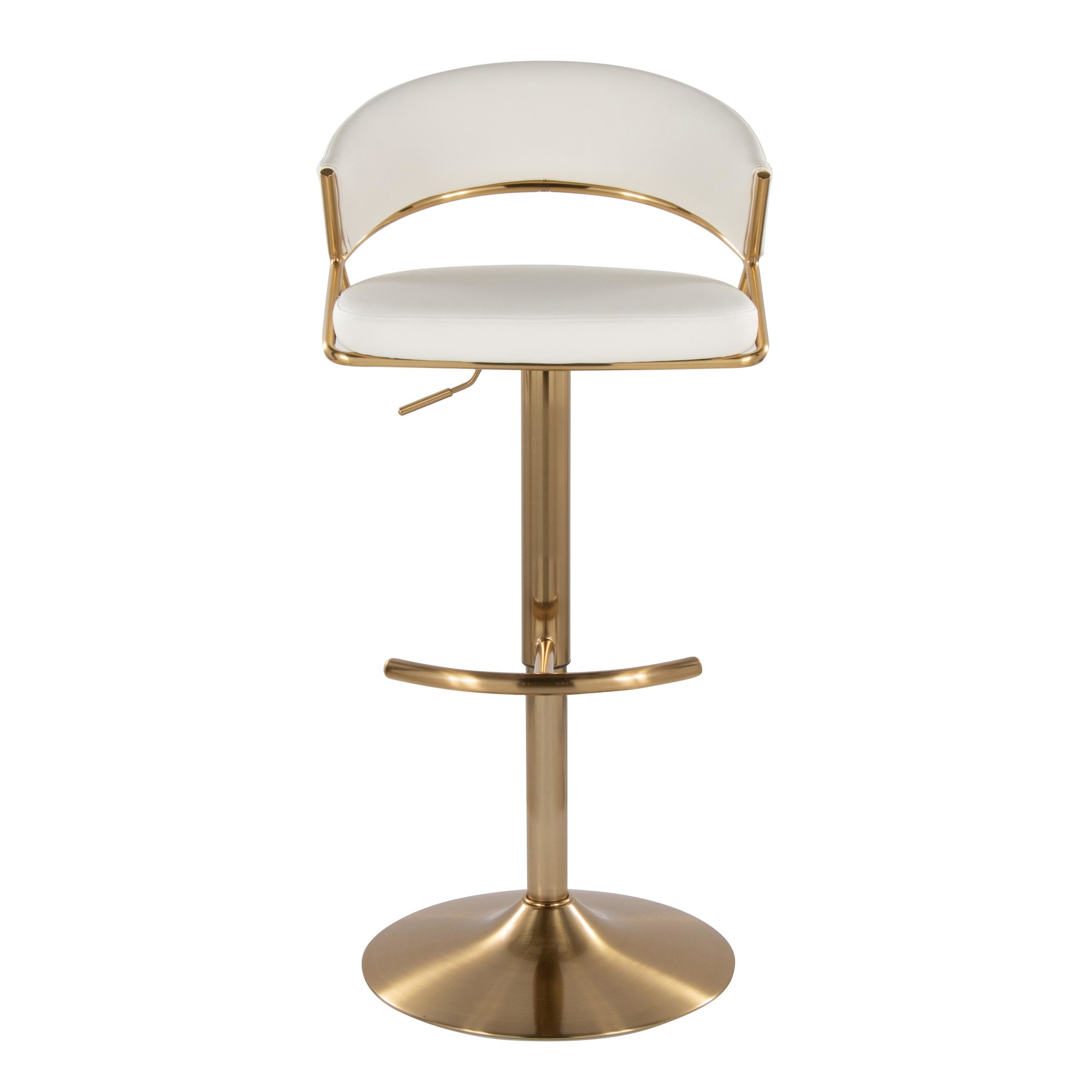 Add a touch of glam to your man cave with these sleek adjustable barstools. Featuring a contemporary style, these barstools are sold in pairs and boast a gold metal base with a convenient rounded t footrest. The white faux leather upholstery offers a luxurious feel. Enjoy adjustable height and a full 360-degree swivel for maximum comfort and flexibility. Perfect for your home bar or entertainment space, these barstools require assembly and support up to 250 lbs each. Enjoy dimensions of 18.25″L x 20.25″W x 36-44.5″H.