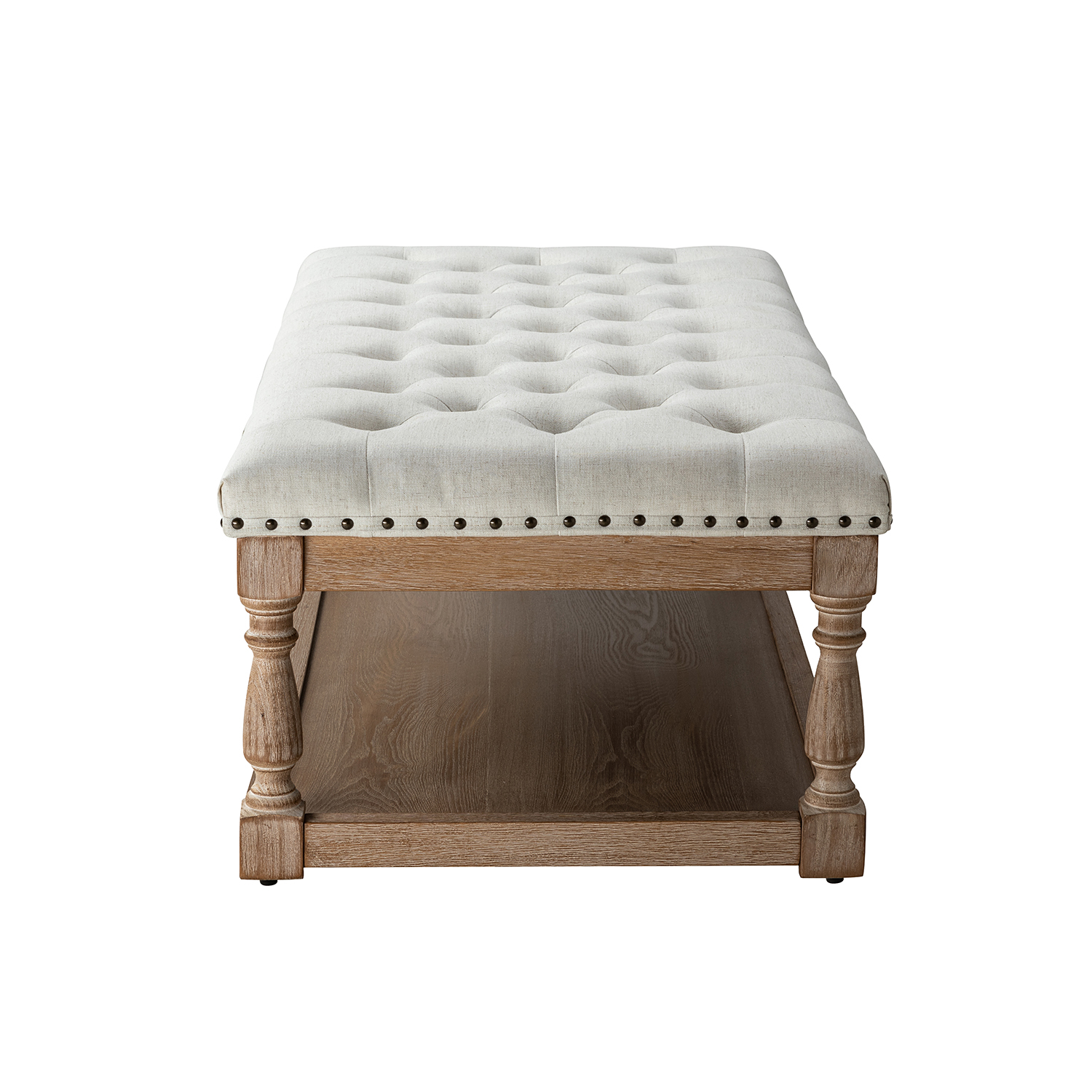 This rectangular storage ottoman blends farmhouse charm with practical functionality. It serves as a coffee table, footrest, or extra seating while providing ample storage for your living room essentials. The button-tufted details and nailhead trim add visual appeal, making it a stylish and versatile addition to your home.