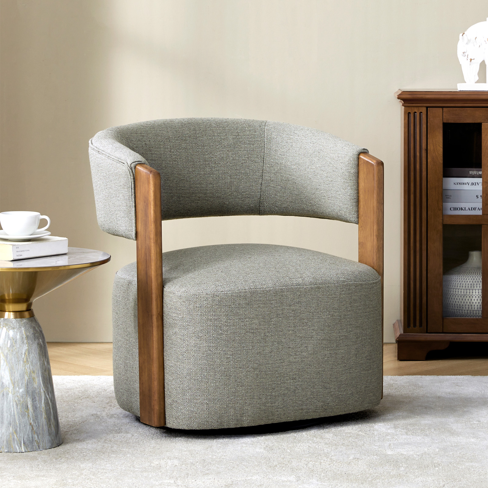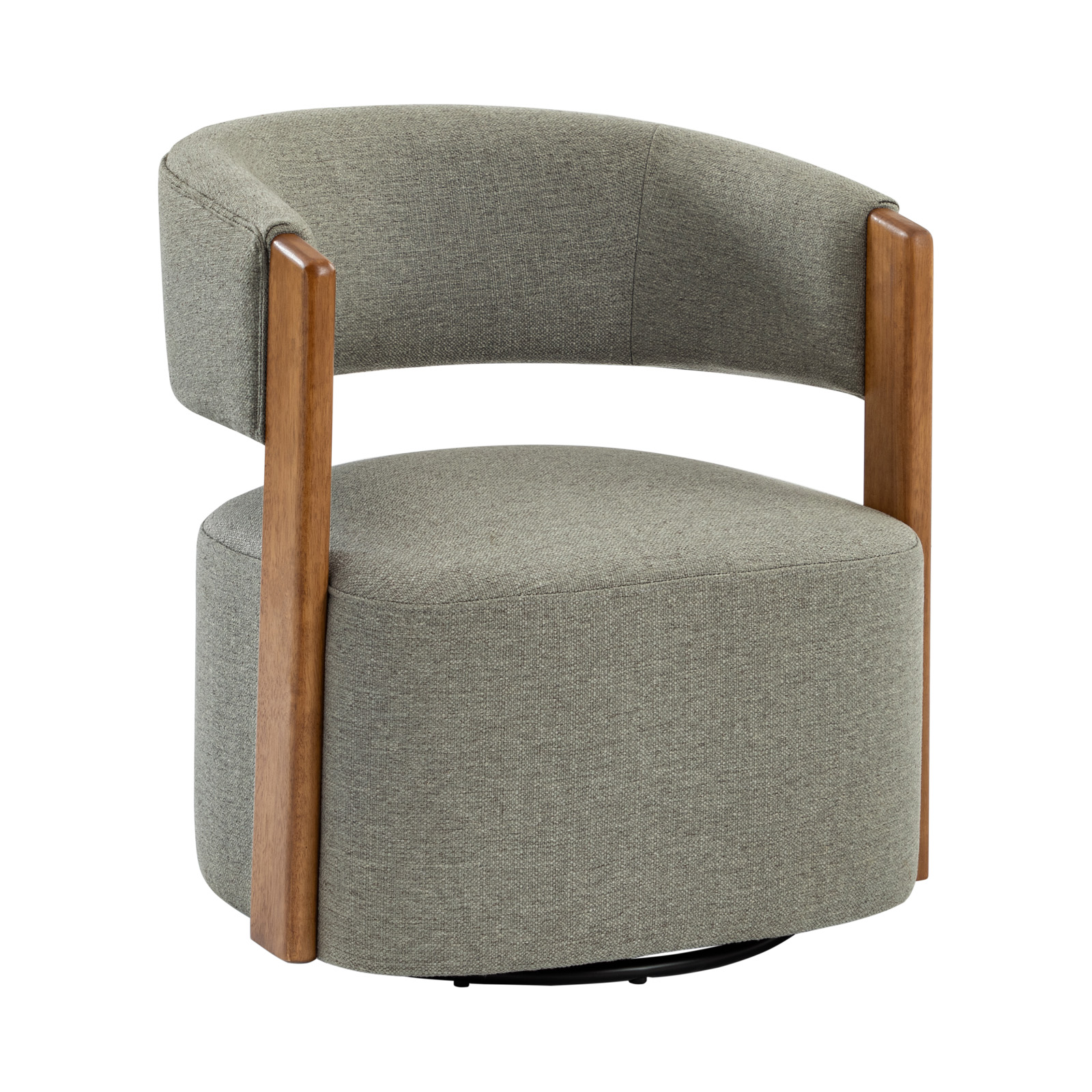 The Jordan Grey Mid-Century Modern Swivel Barrel Chair seamlessly combines style and comfort, making it a perfect addition to your living room or bedroom. This chair features sleek, solid wood armrests, a comfortable thick seat cushion, and a convenient swivel function. Enhance your home with a piece that offers both aesthetic appeal and practicality. Enjoy effortless movement and versatile placement in any room.