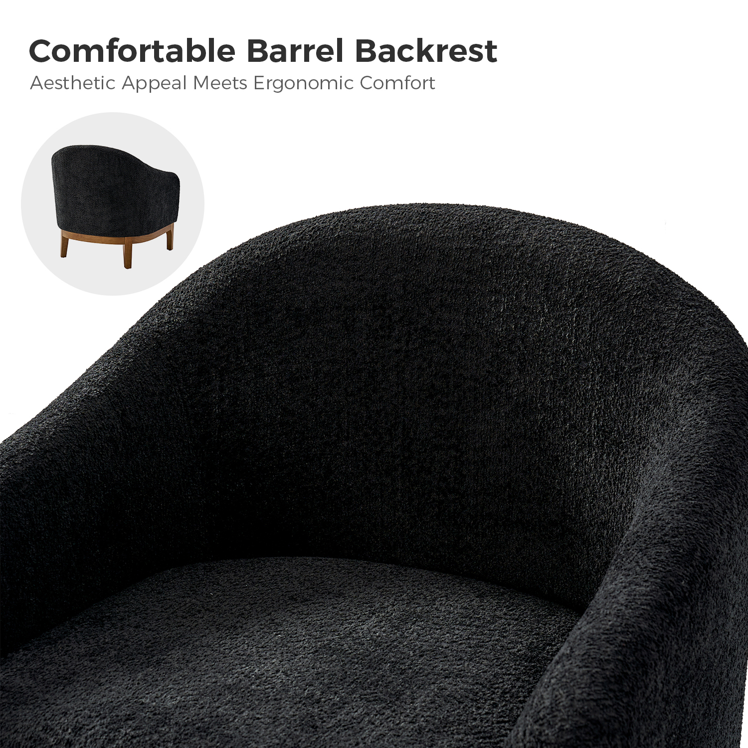 The modern barrel chair seamlessly blends style and comfort, making it a perfect focal point in any contemporary living room or bedroom. The distinctive barrel back exudes sophistication, complemented by luxurious lamb wool fabric for a soft and plush feel. Supported by solid wood legs with adjustable feet for stability, this chair features a dual-sided cushion for versatile styling and a high-density sponge for lasting comfort.