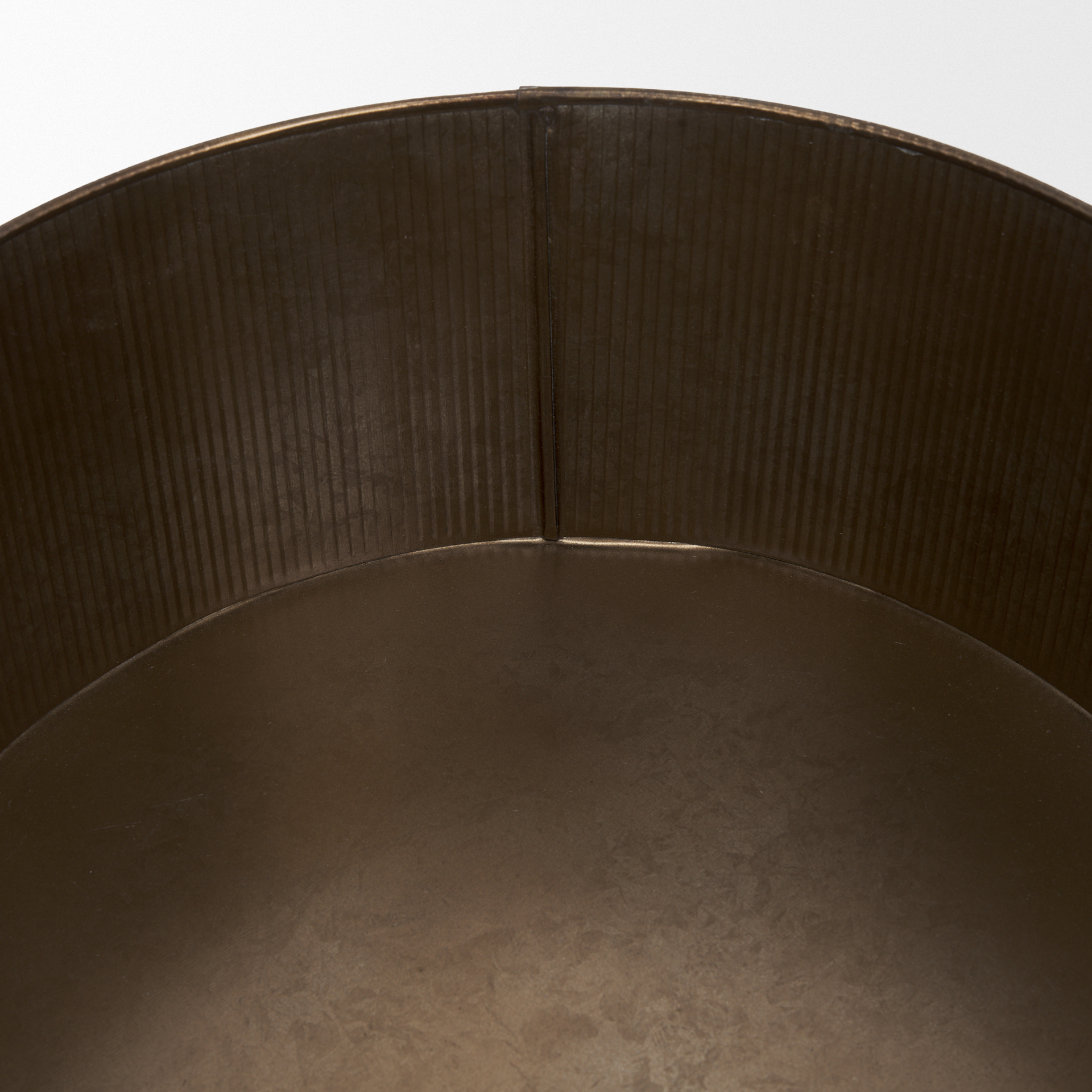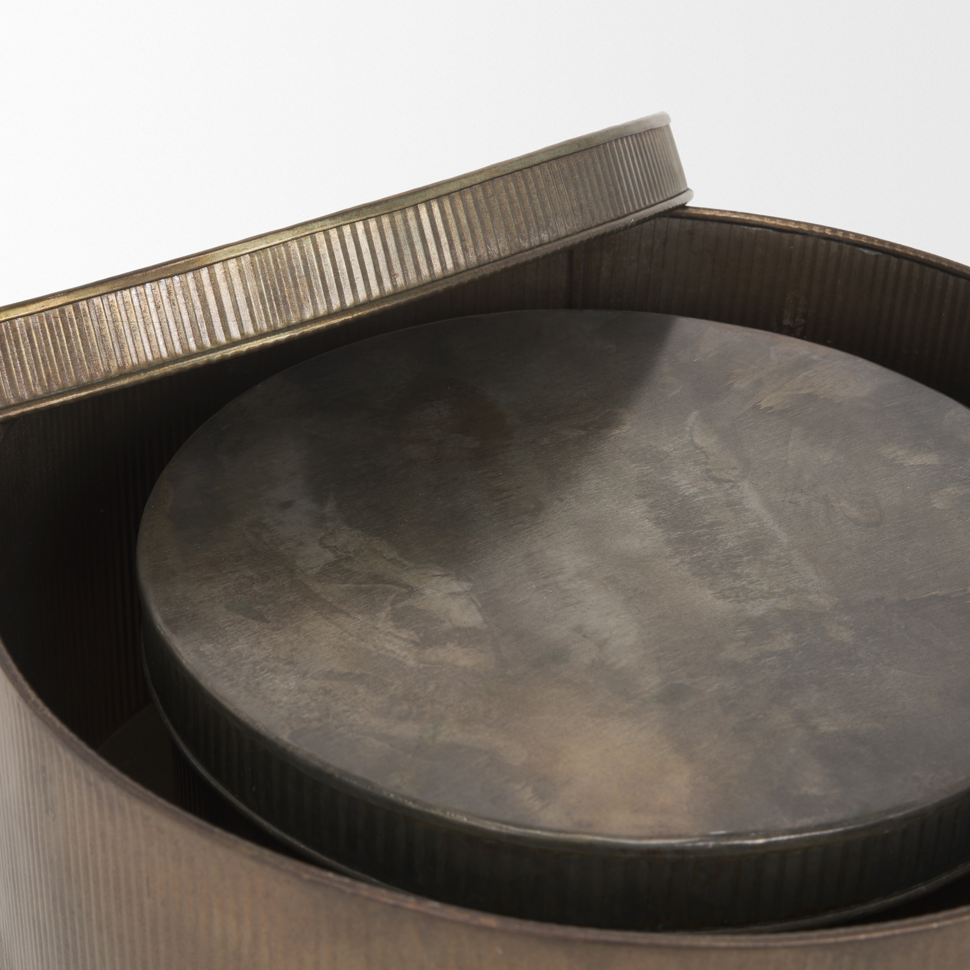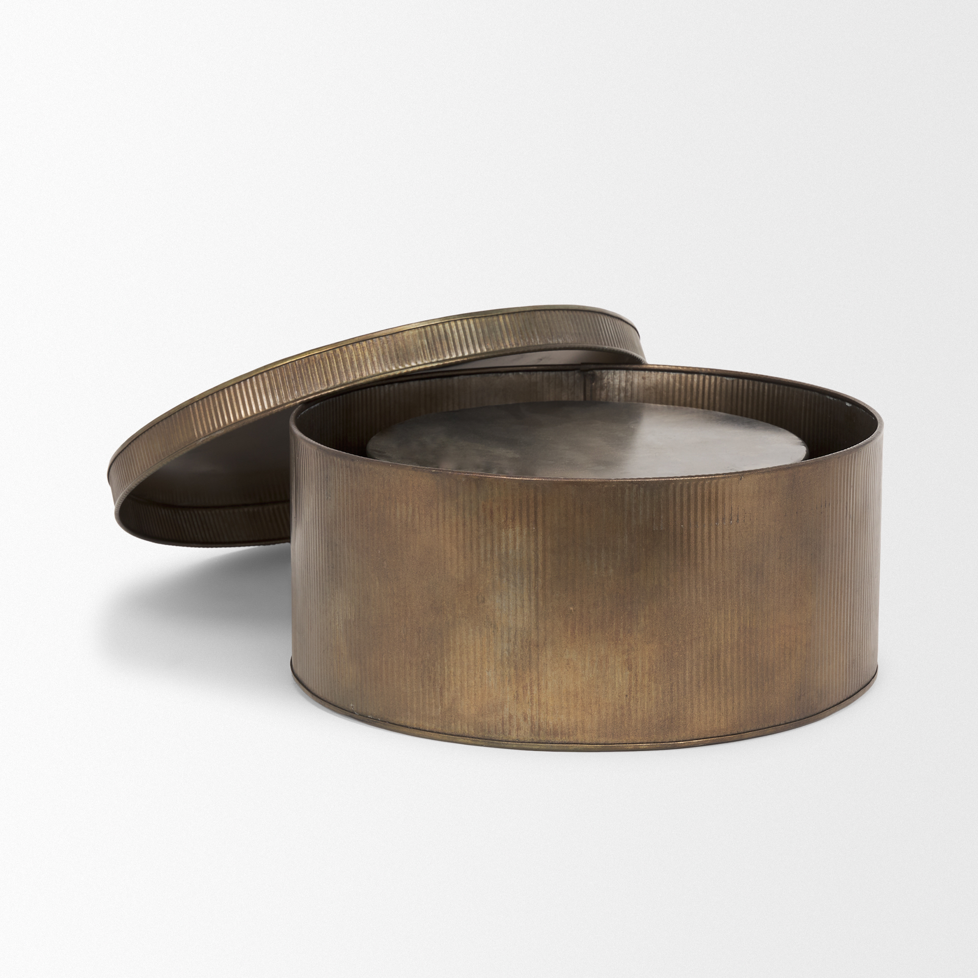 The Josephine Round Antique Gold Metal Boxes offer a touch of vintage flair to any space. Handcrafted from GI sheet metal, each piece boasts a unique antiqued brass finish, creating a one-of-a-kind decorative accent. These boxes feature a smooth top and a distinctive ribbed texture around the frame, perfect for adding character to your decor. Due to their handmade nature, slight variations in color, pattern, and size are to be expected, enhancing their individual charm.