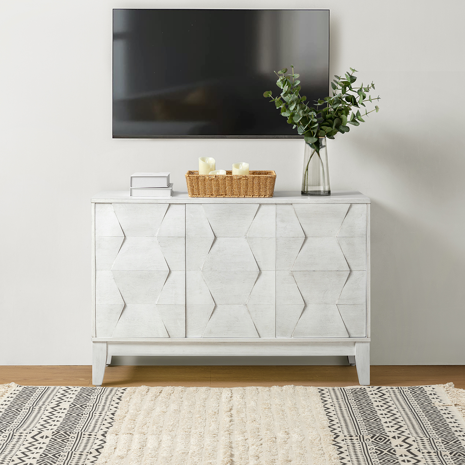 This 3-door storage cabinet offers a stylish and practical solution for your home. Designed with a contemporary aesthetic, this sideboard provides ample storage while enhancing your décor. The push-to-open doors reveal adjustable shelves, allowing for effortless organization. Subtle hexagonal embellishments add visual texture and create an eye-catching focal point.