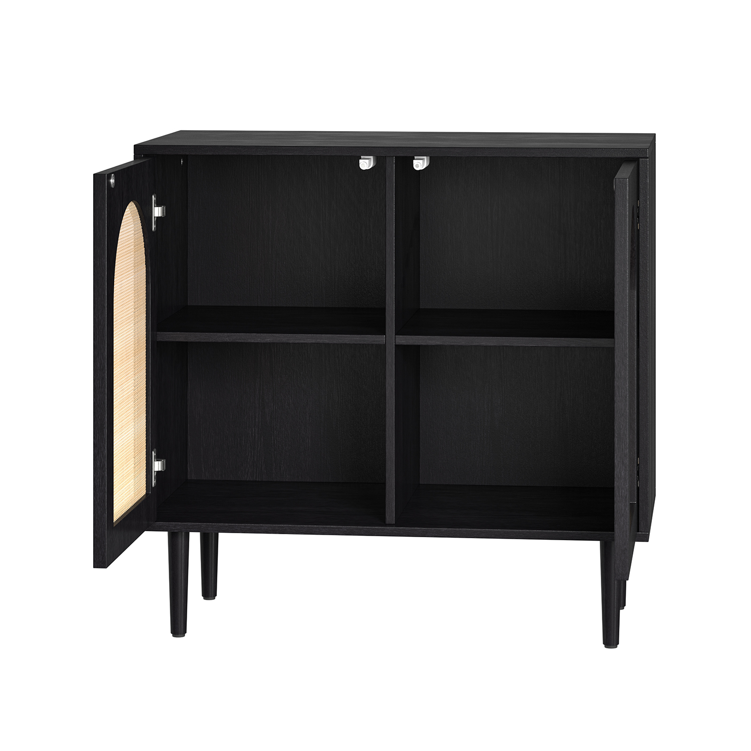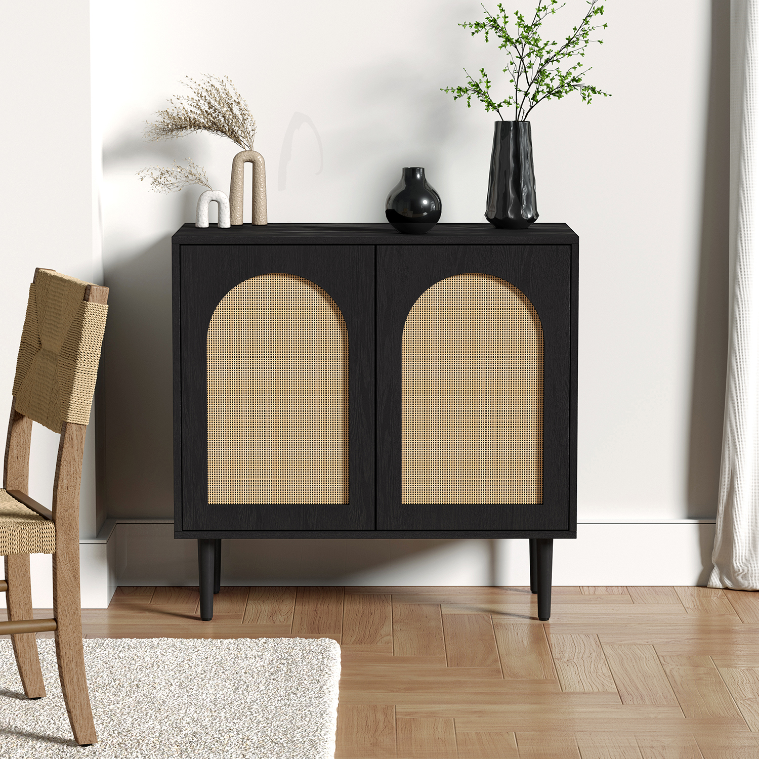 Simplify your space with the Juli Black Rattan Door Rustic Accent Cabinet! This contemporary cabinet combines natural materials with ample storage. Its rustic, organic look and clean silhouette make it a versatile addition to any room. The rattan doors open to reveal two interior shelves, perfect for storing cutlery, linens, or barware. The cabinet’s overall rustic palette complements its modern design, seamlessly blending with any existing color scheme in your living room or entryway.