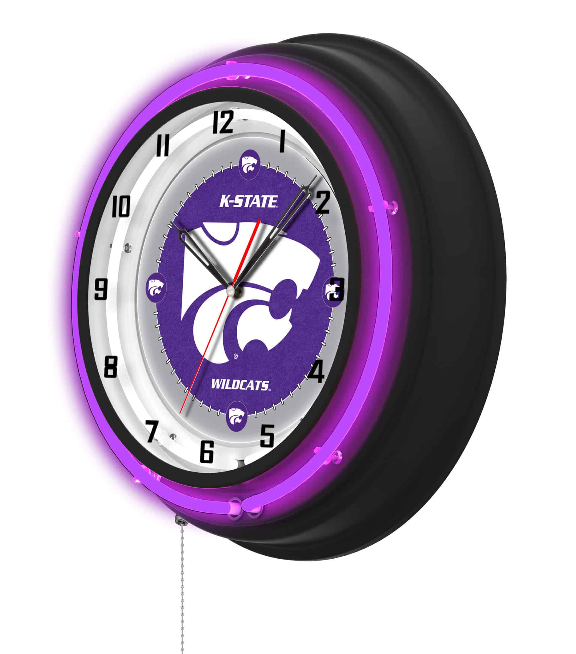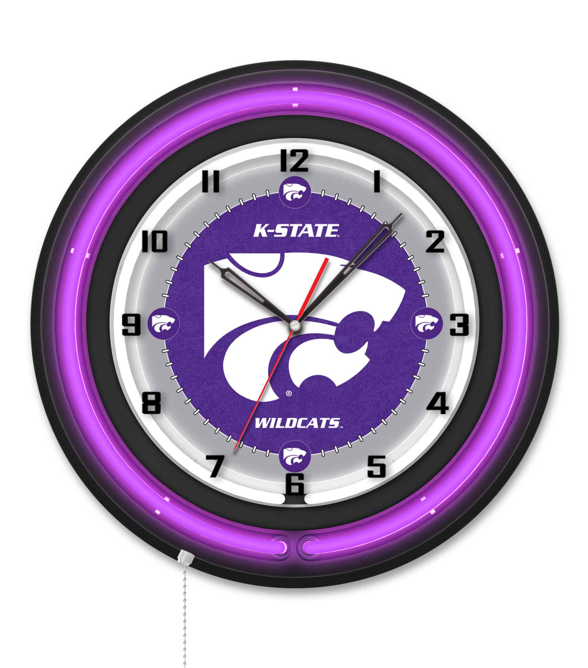 The Kansas State University 19-Inch Neon Logo Clock in Black is the ultimate statement piece for any fan’s space. This eye-catching clock features a sleek black casing and vibrant neon rings that showcase your team spirit. Its brilliant white inner neon ring illuminates the custom printed clock face, ensuring that you never miss a moment. Designed for convenience, the neon lights can be easily turned on or off using a pull chain, while the accurate quartz movement guarantees precise timekeeping. This clock is not just a functional timepiece but also a bold decoration that enhances any man cave or sports room.