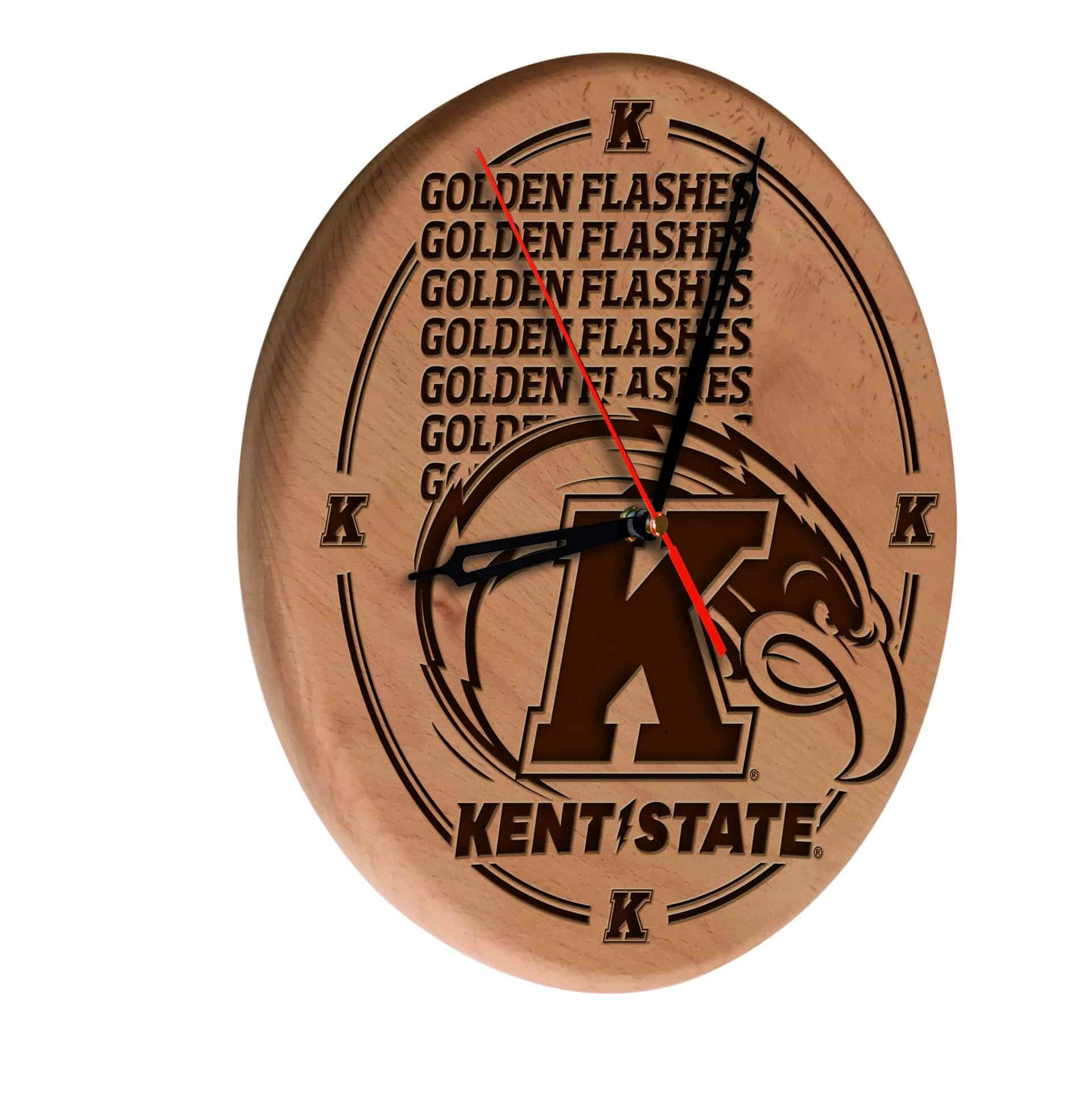 The Kent State University 13-Inch Solid Wood Engraved Clock in Natural is a stunning addition to any space, showcasing your school pride with elegance. This officially licensed clock features laser engraved graphics that highlight your favorite university. With its accurate quartz movement, this clock ensures precise timekeeping powered by a single AA battery (not included). The recessed keyhole hanger allows for easy mounting, ensuring a flush and polished look on your wall. Ideal as a gift for graduates, sports fans, or as a personal keepsake, this clock brings a touch of sophistication and pride to any environment.