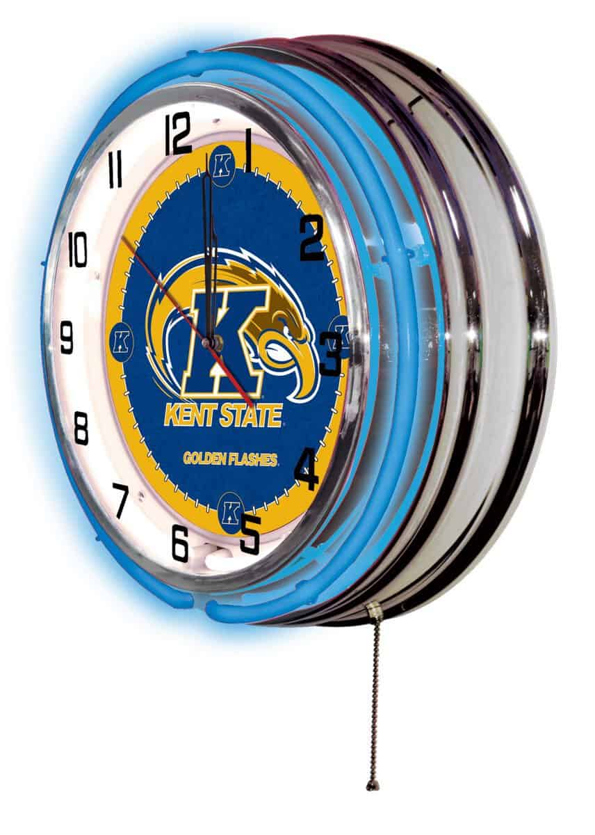 The Kent State University 19-Inch Neon Logo Clock in Chrome is an eye-catching piece of decor that showcases your school pride. This clock features a stylish chrome casing and a vibrant neon outer ring that highlights the custom printed clock face, illuminated by a brilliant white inner neon ring. Enjoy the convenience of a pull chain for easy on/off operation, and rely on accurate quartz movement powered by a single AA battery. Perfect for gifting or for personal use, this clock combines functionality with a stunning design.