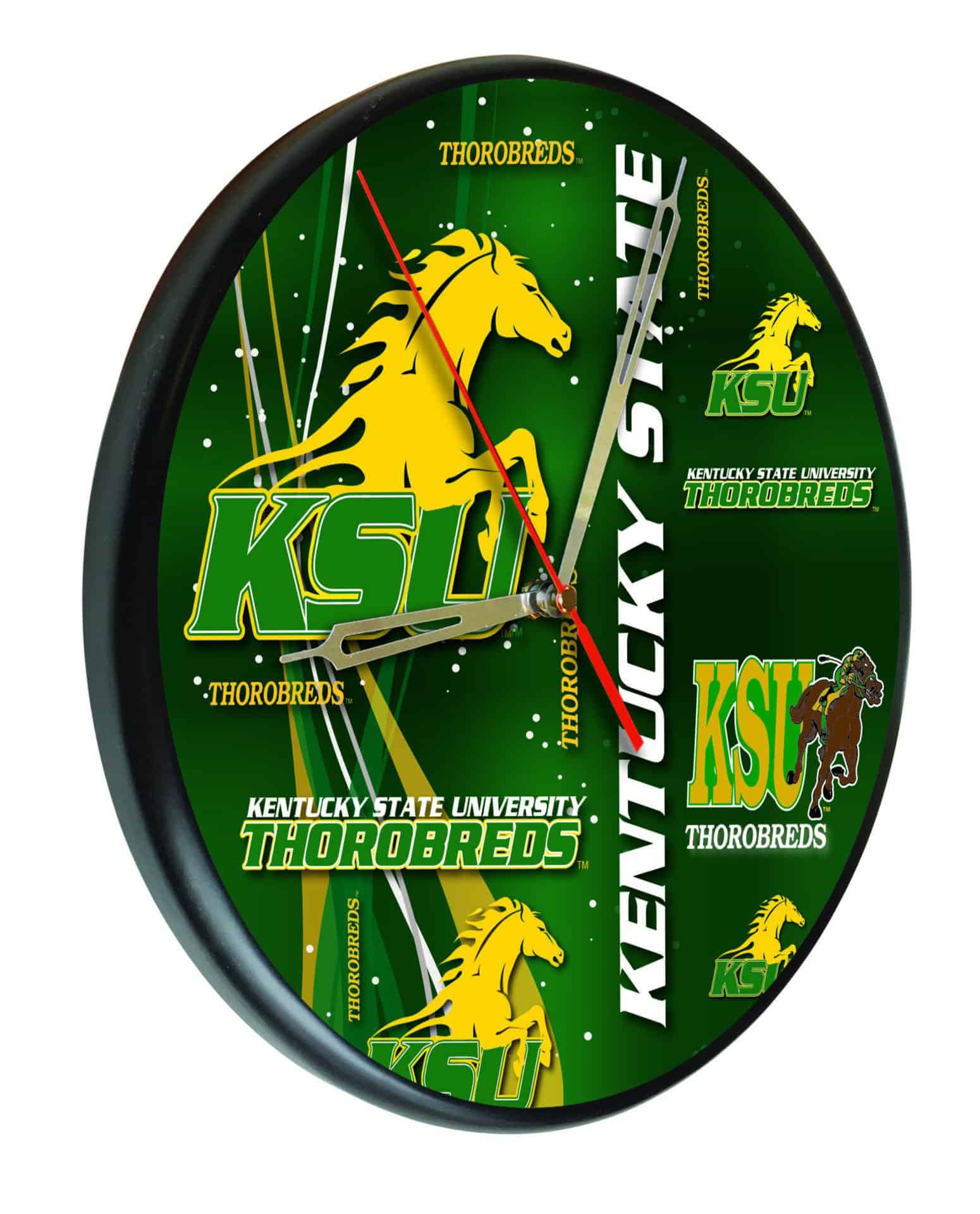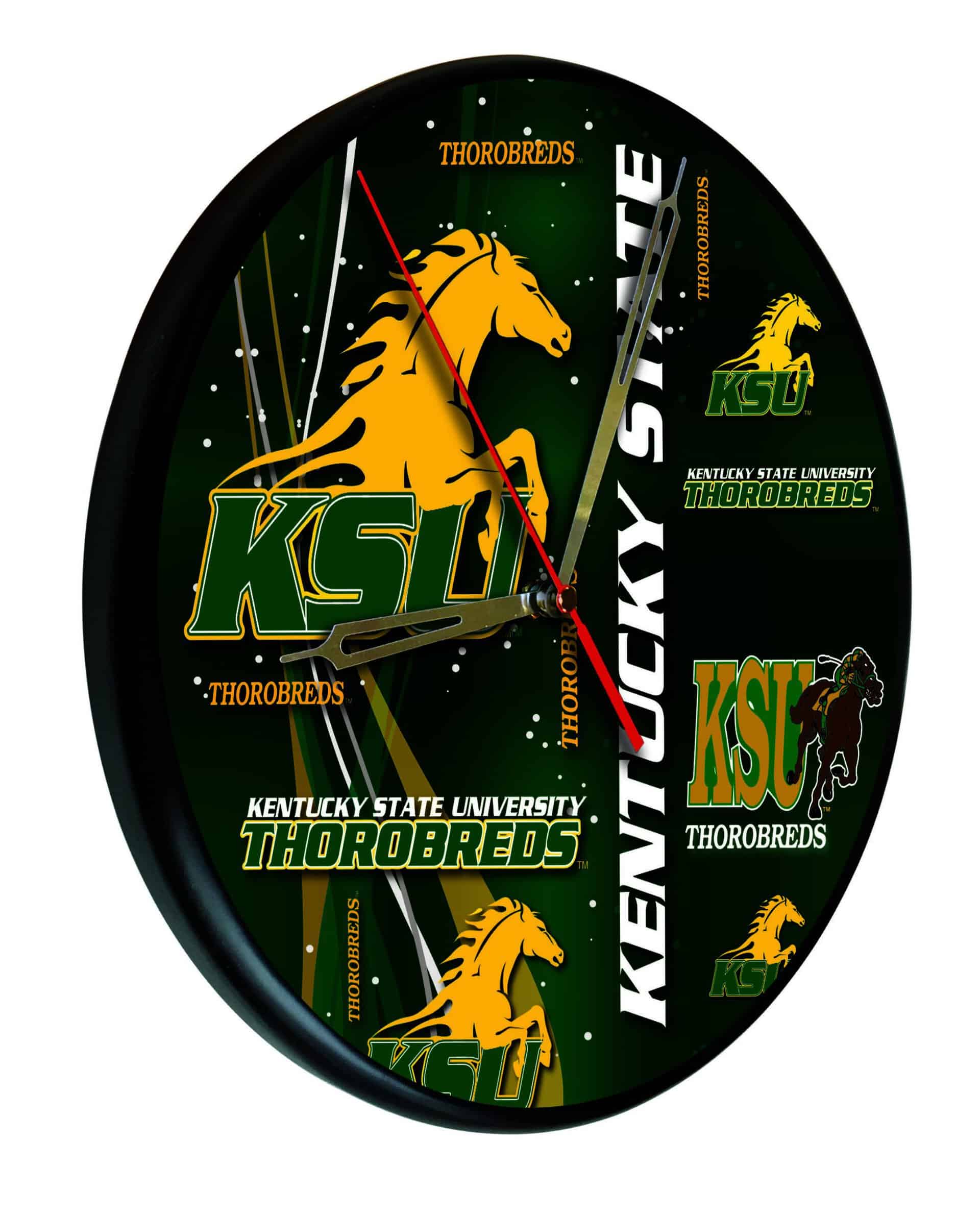 The Kentucky State University 13-Inch Solid Wood Clock in Black is the perfect way to showcase your school spirit. This officially licensed clock features first surface, digitally printed graphics utilizing UV inks that resist fading over time. Its accurate quartz movement ensures precise timekeeping, powered by a single AA battery (not included). The clock’s recessed keyhole hanger allows for a flat wall display, providing a clean and finished look. Ideal as a gift for graduates, sports enthusiasts, or for personal use, this clock combines functionality with school pride.