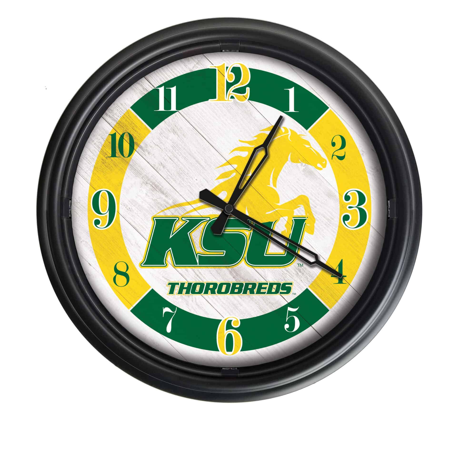 The Kentucky State University 14-Inch Indoor/Outdoor LED Wall Clock in Black is the perfect addition to any man cave, showcasing your school pride while offering practical functionality. This clock features a durable, weather-resistant construction, making it suitable for both indoor and outdoor use. The striking design includes vibrant, fade-resistant artwork that is digitally printed with UV inks. With a photo eye-controlled LED lighting system, the clock face illuminates automatically in low light, ensuring visibility at all times. Enjoy precise timekeeping thanks to the accurate quartz movement powered by a single AA battery.