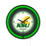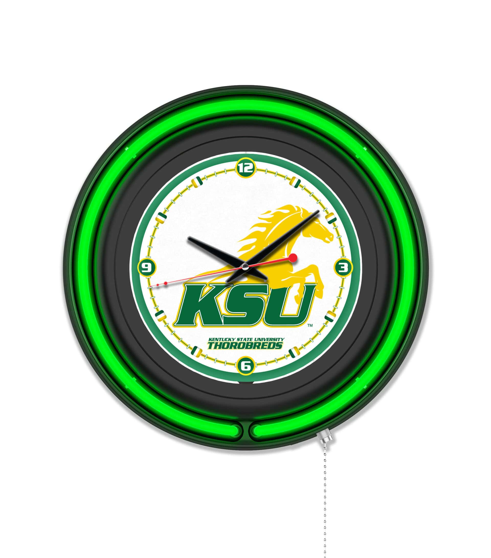 The Kentucky State University 15-Inch Neon Logo Clock in Black is the perfect addition to your man cave, showcasing your school spirit in a vibrant and functional way. This striking clock features a black casing and a neon outer ring that highlights a custom printed clock face illuminated by a brilliant white inner neon ring. With an easy-to-use pull chain for on/off operation, this clock combines style and practicality, making it an ideal gift for graduates, sports fans, or for personal use.