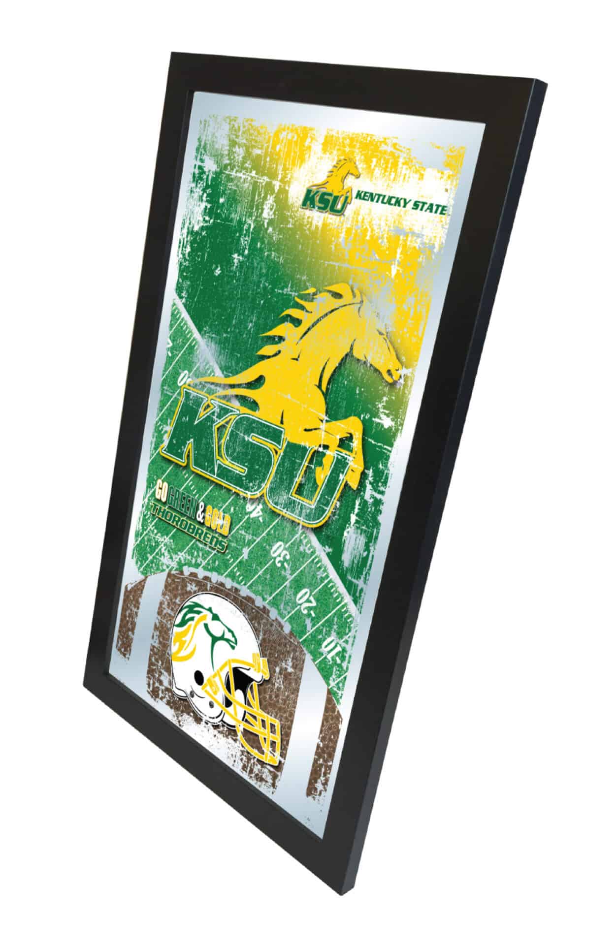 Show your school pride with this officially licensed football wall mirror. Featuring a simple yet elegant design, the vibrant colors burst through the 1/8″ thick glass, beautifully highlighted by mirrored accents. The mirror is framed with a black, 1 1/4″ wrapped wood frame and includes dual saw-tooth hangers for easy installation. Measuring 15″ in height and 26″ in width, this mirror is perfect for your office, garage, or any room in the house. Whether you’re purchasing it as a gift for a recent graduate, a sports super fan, or treating yourself, you’ll appreciate the quality craftsmanship and design.
