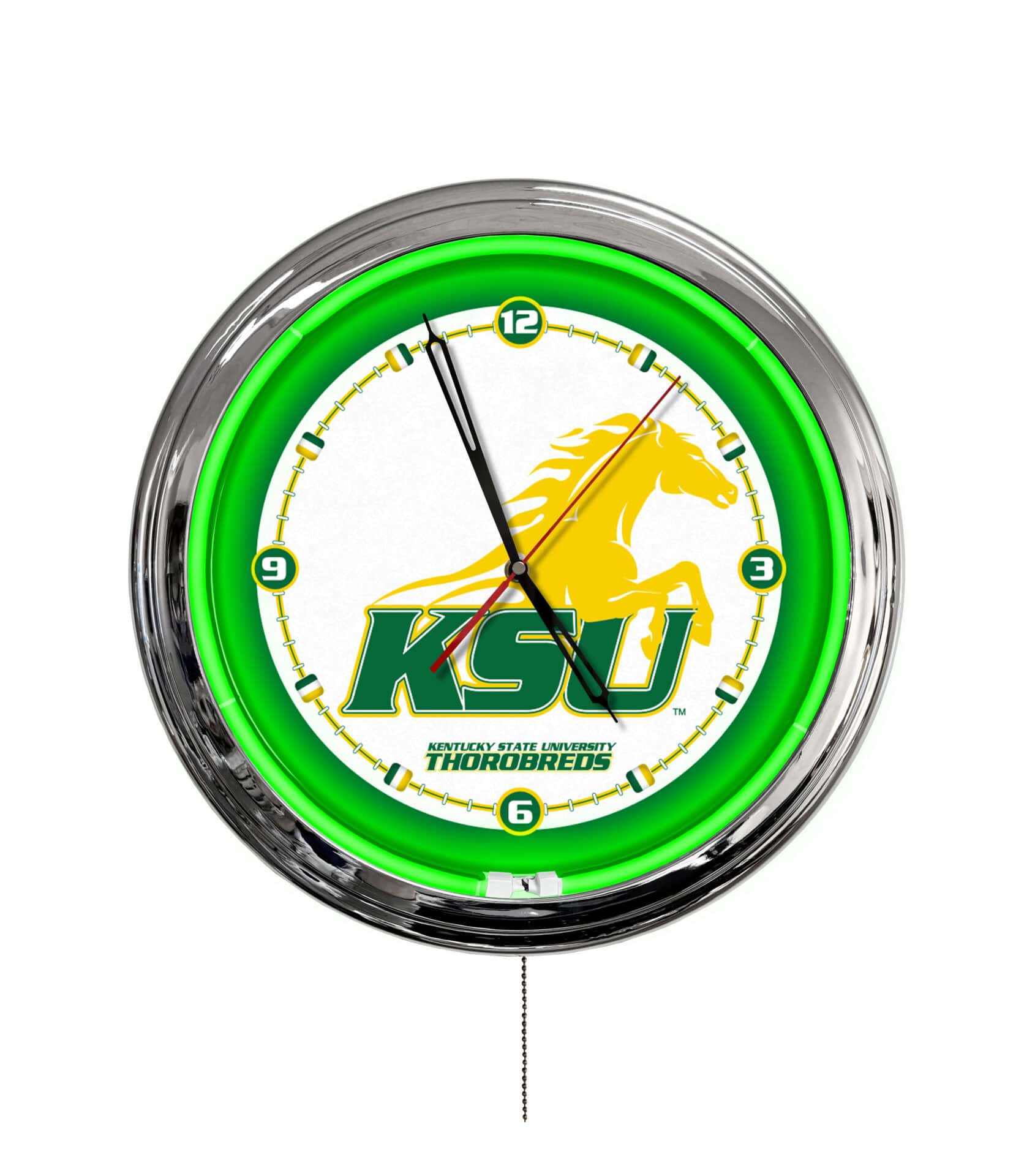 The Kentucky State University 16-Inch LED Wall Clock in Chrome is a modern and stylish timepiece that brightens up any space with its vibrant multi-color display. Featuring a sleek chrome casing, this clock offers flexibility and a unique design that can adapt to various atmospheres. With the ability to illuminate logos and brands in a stunning array of colors, it is perfect for showcasing team spirit in your man cave or any other setting.