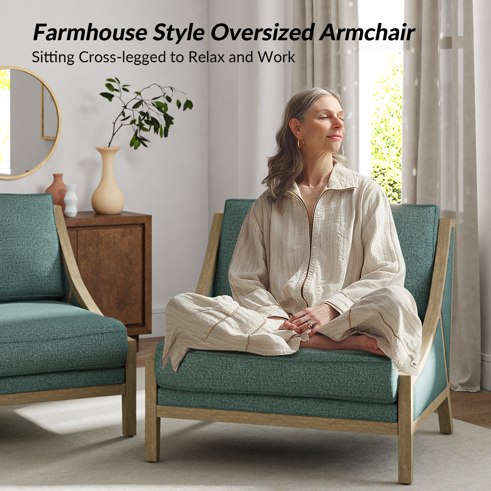 The Kim Teal Farmhouse Oversized Accent Armchair is a charming addition to any space, blending seamlessly with living rooms and bedrooms alike. Its farmhouse style and coastal accents create a relaxed, inviting atmosphere. The oversized seat and movable back cushion offer customizable comfort for lounging or working. Enjoy the warmth of solid wood legs and armrests, designed for both durability and style.