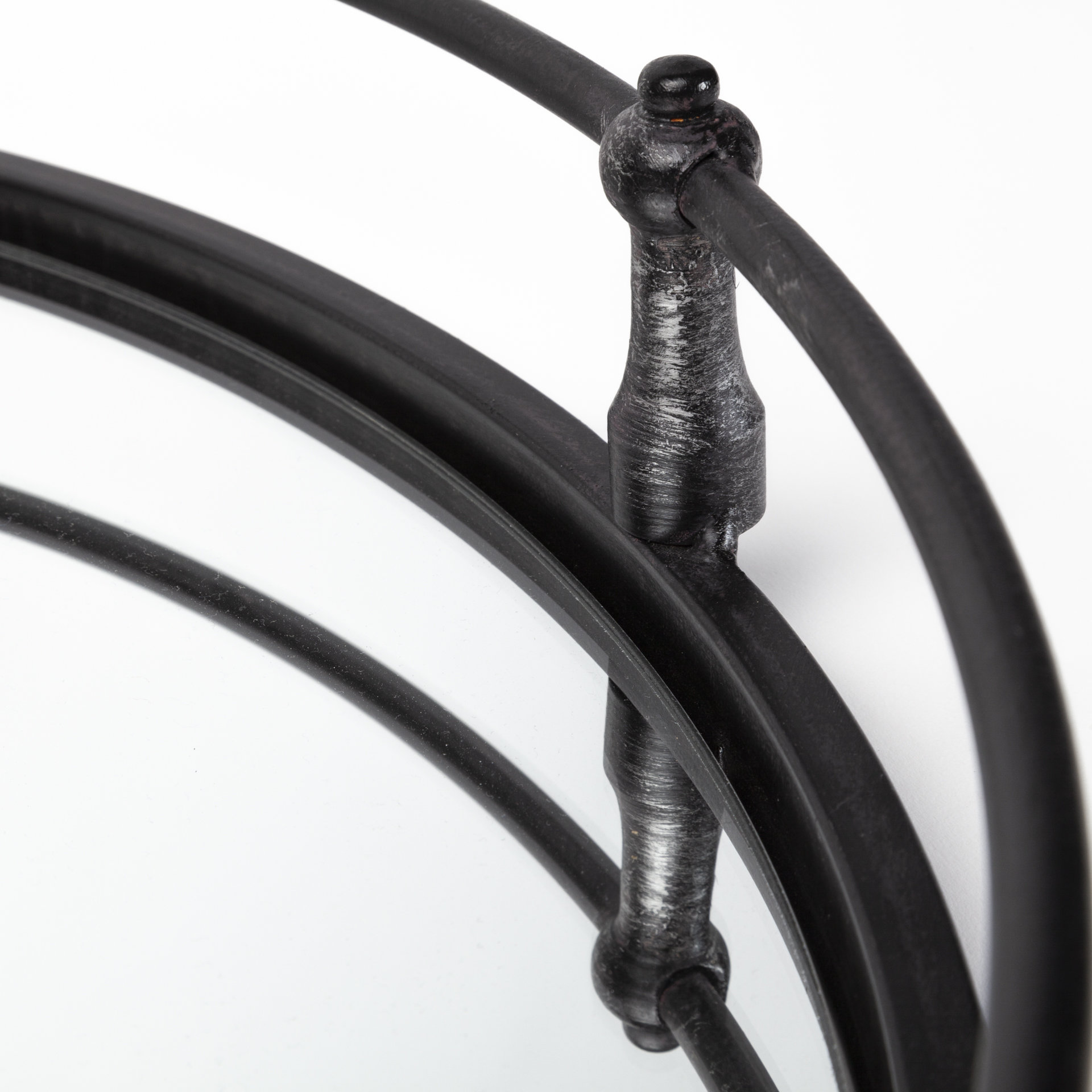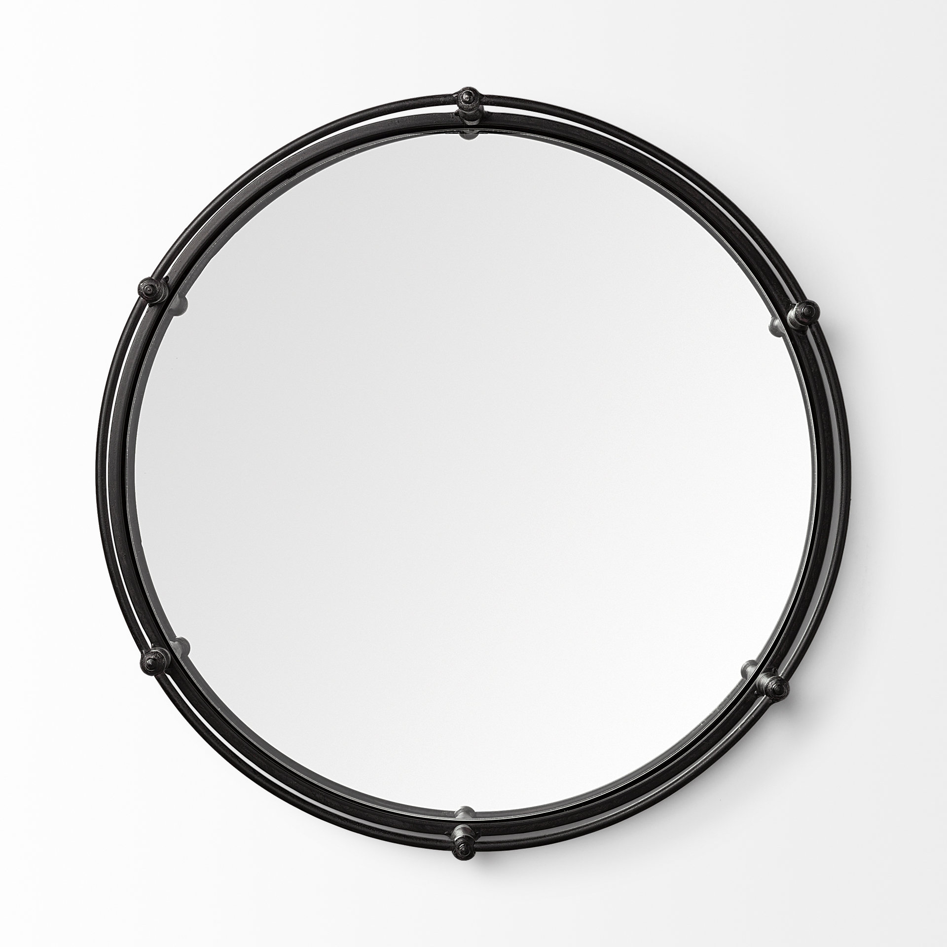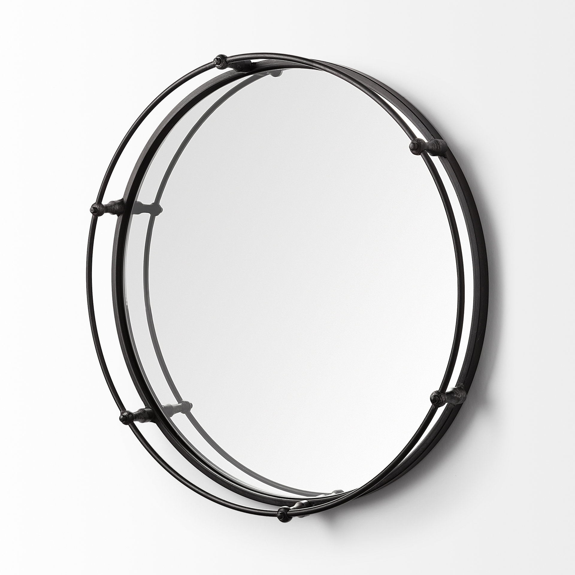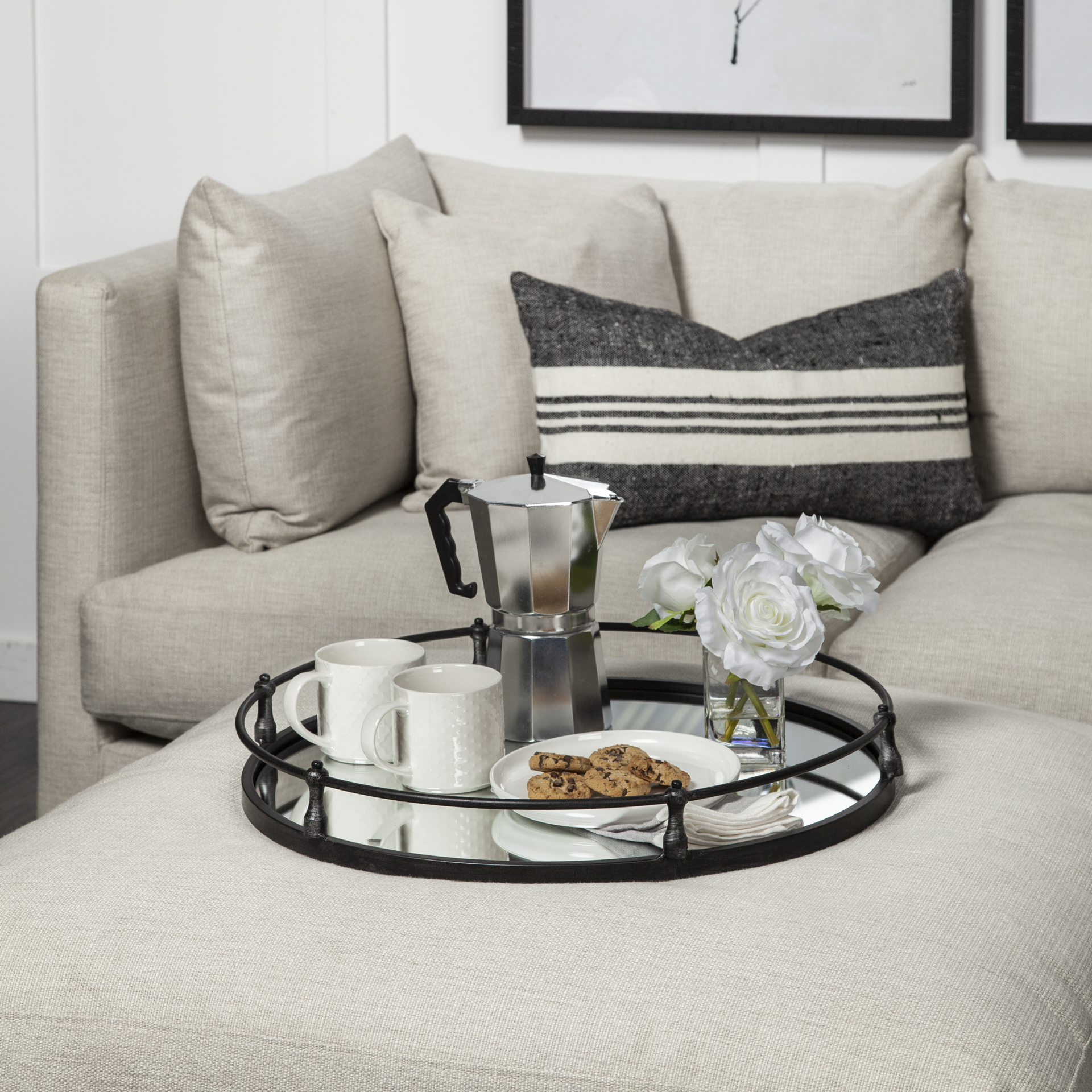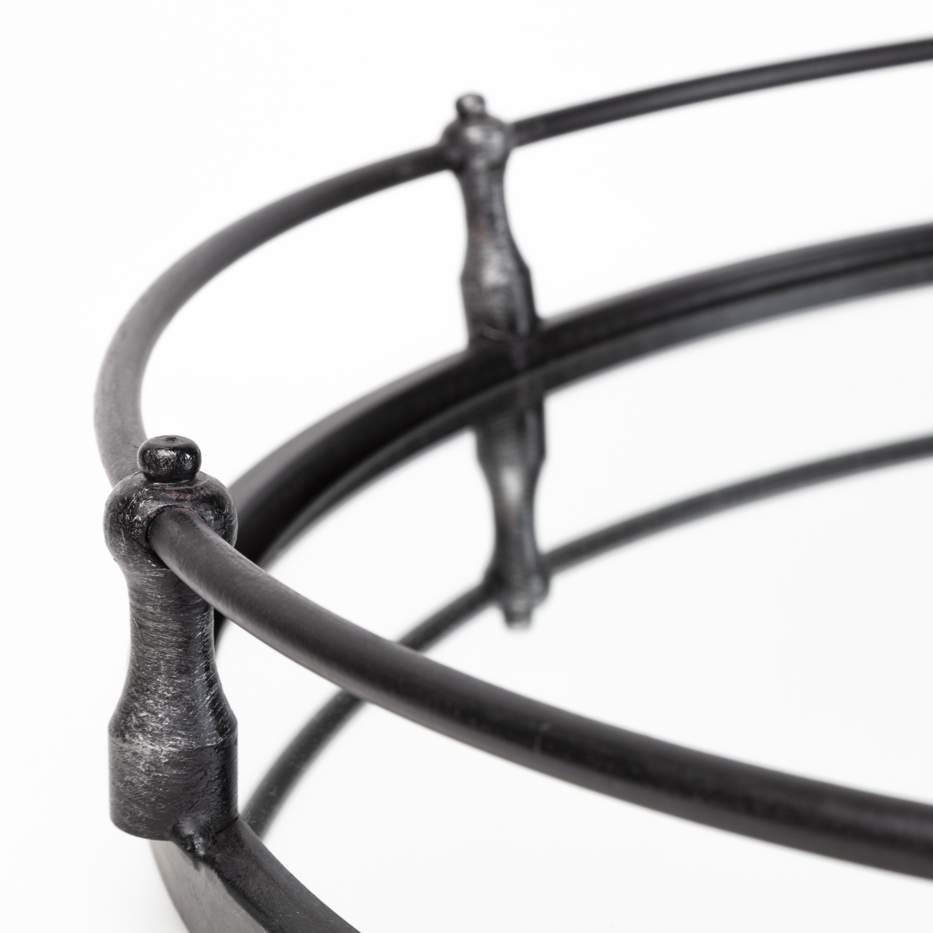 The Kimbel is a stylish round tray that adds a touch of elegance to any space. Its mirrored-glass base reflects light beautifully, while the naturally finished metal frame provides a sophisticated contrast. Use it to display your favorite items or as a chic serving piece. The raised railings ensure items stay safely in place. As an added bonus, you can even mount it on the wall to use as a decorative mirror!