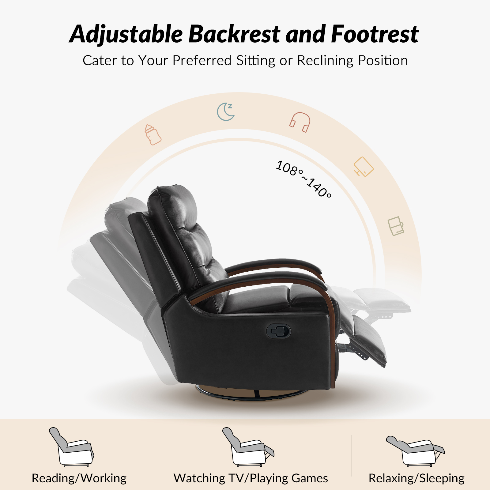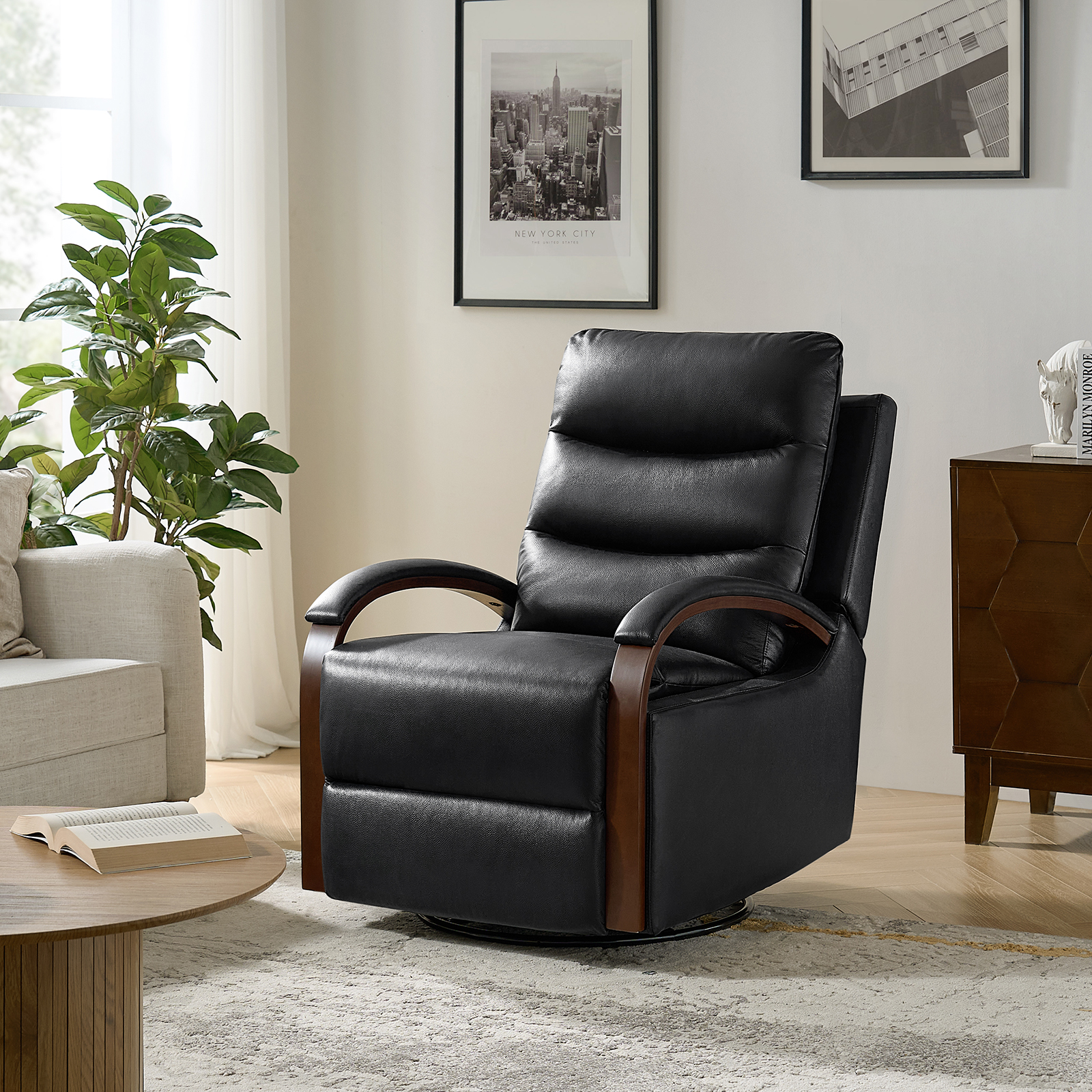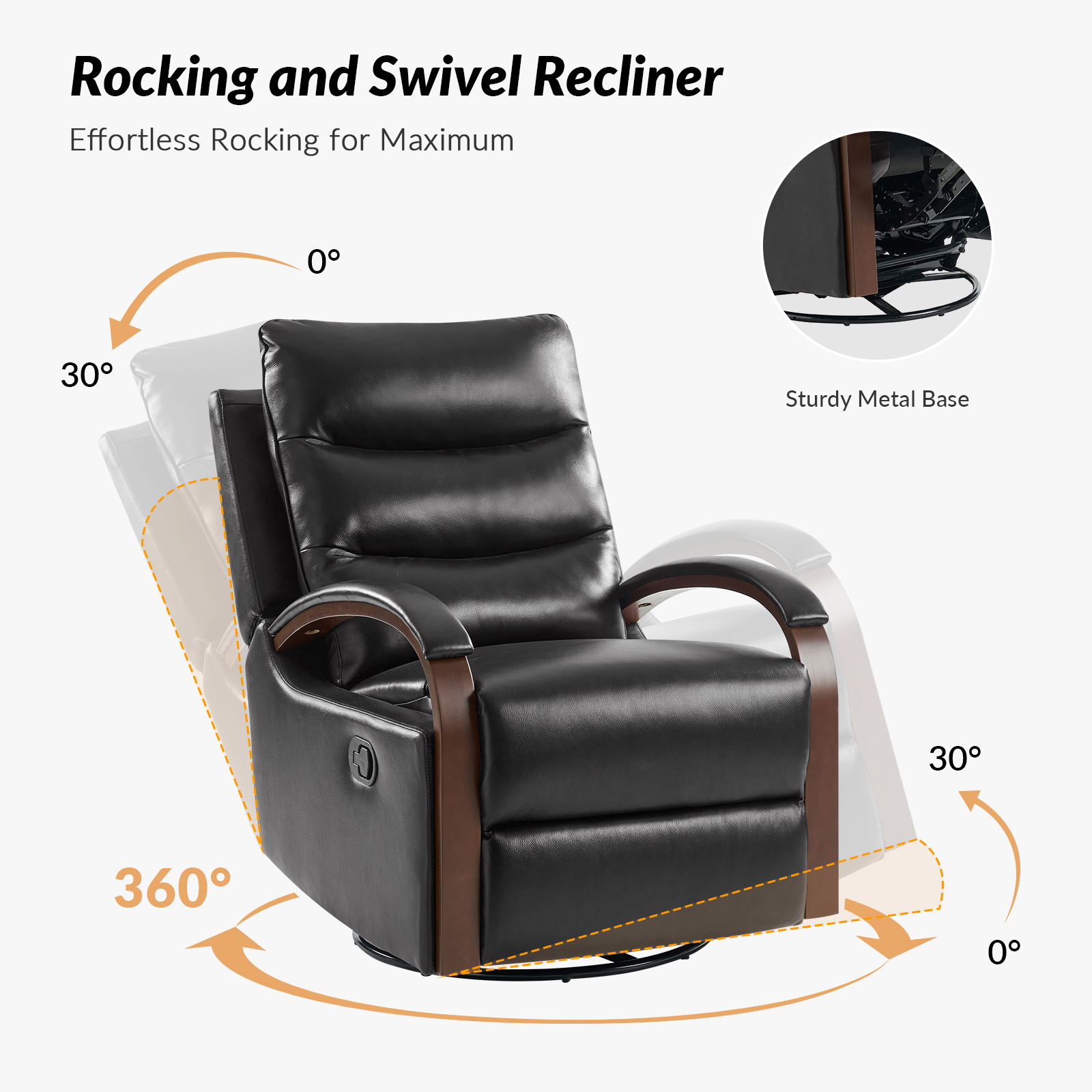 Sink into the luxurious comfort of the Rocking Swivel Recliner. This recliner blends modern style with versatile functionality. The curved wood arms and wooden arm accents add an elegant touch, making it perfect for any contemporary space. Upholstered in a combination of genuine and vegan leather, this swivel recliner offers both a luxurious feel and lasting durability.