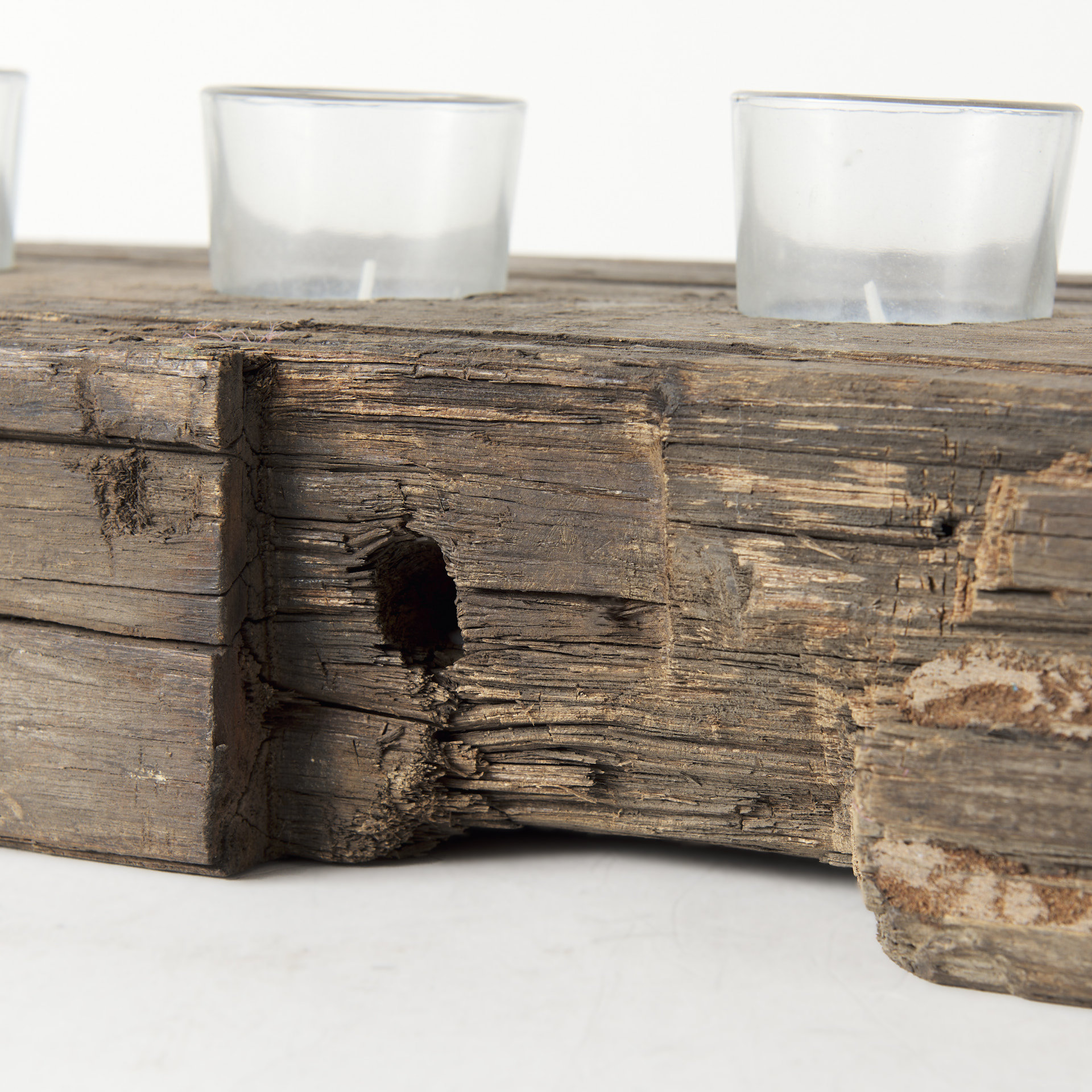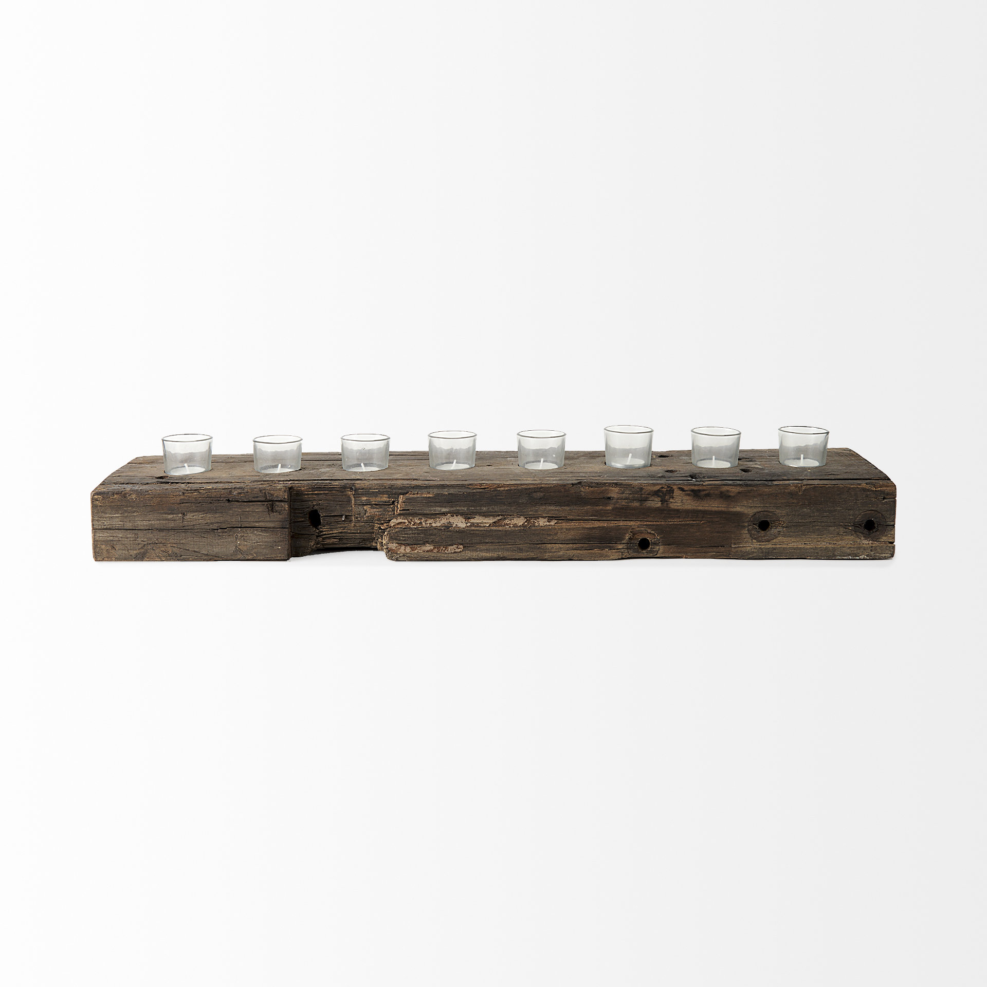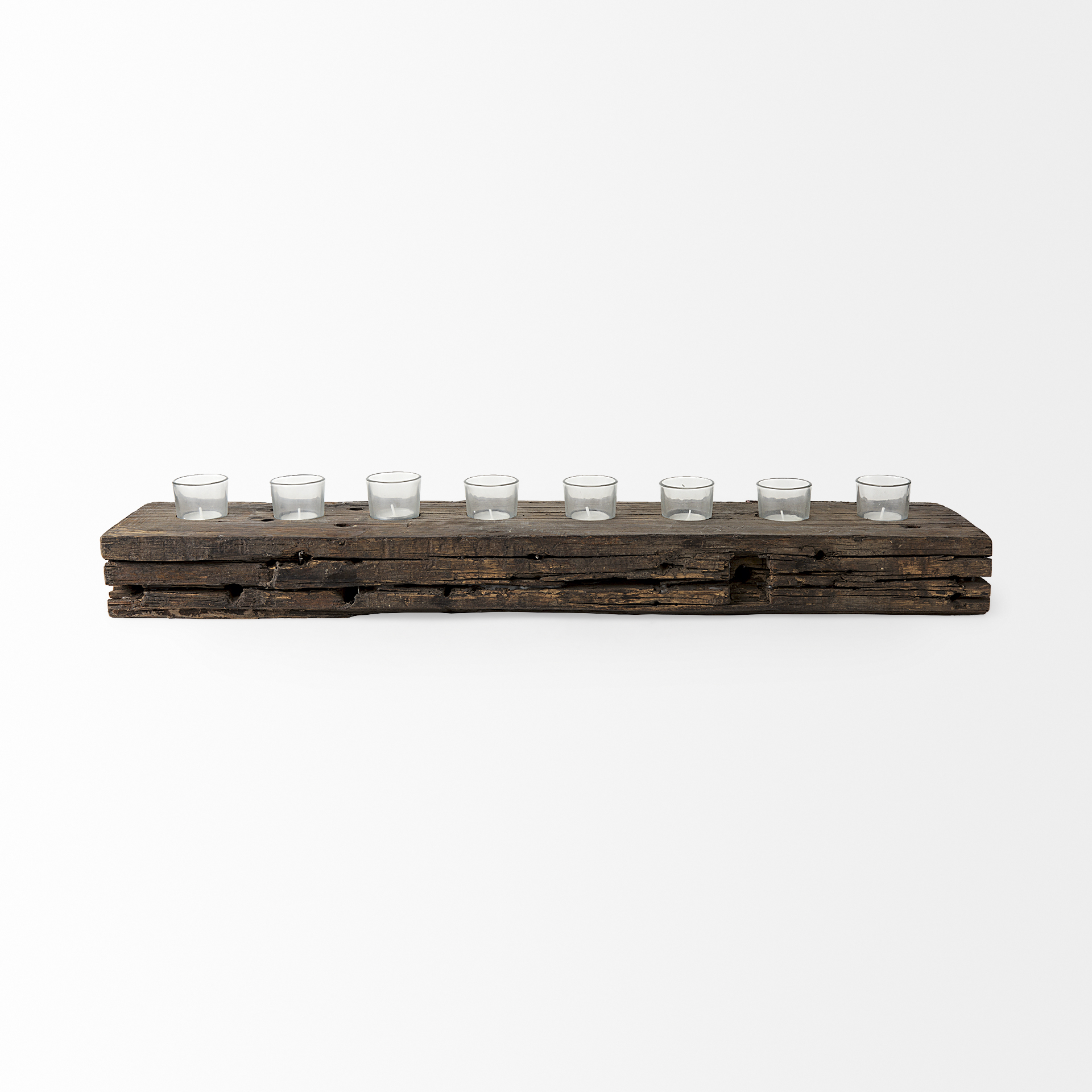 The Lakara is a stunning tabletop candle holder crafted from reclaimed hardwood. This beautiful piece holds eight tealight candles in glass votives, creating a warm and inviting ambiance. Each Lakara is unique, showcasing the natural character of the reclaimed wood. It’s the perfect statement piece to illuminate your space with rustic charm!